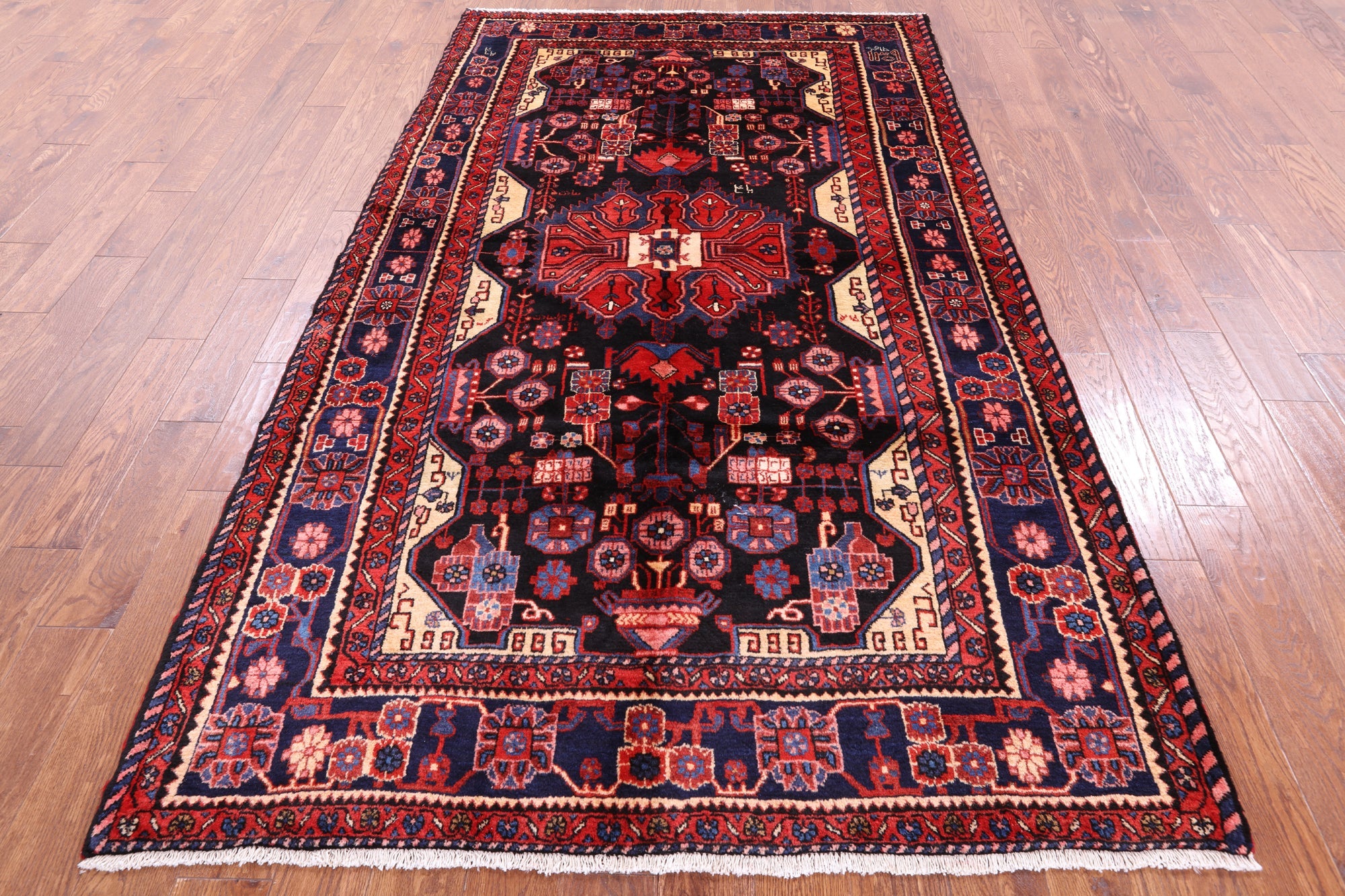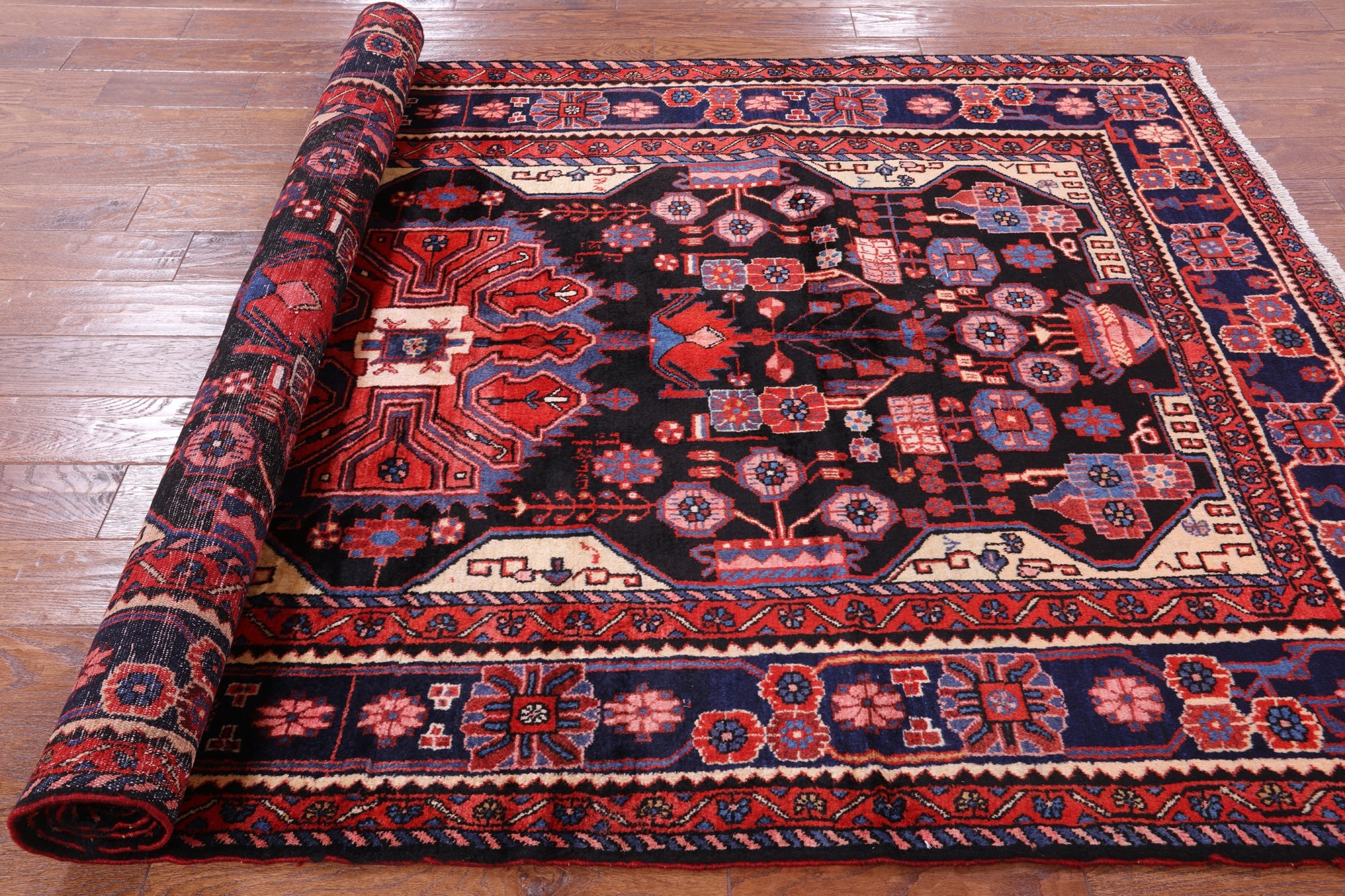 Nahavand rugs comes from the city of Nahavand in Persia. These rugs have a tribal style look, often using floral medallions and a variety of vegetable dyed colors such as reds, blues, greens and different shades of ivory. Nahavand rugs are made with very high quality wool, which gives it a shine. They are very durable rugs that will last a lifetime.