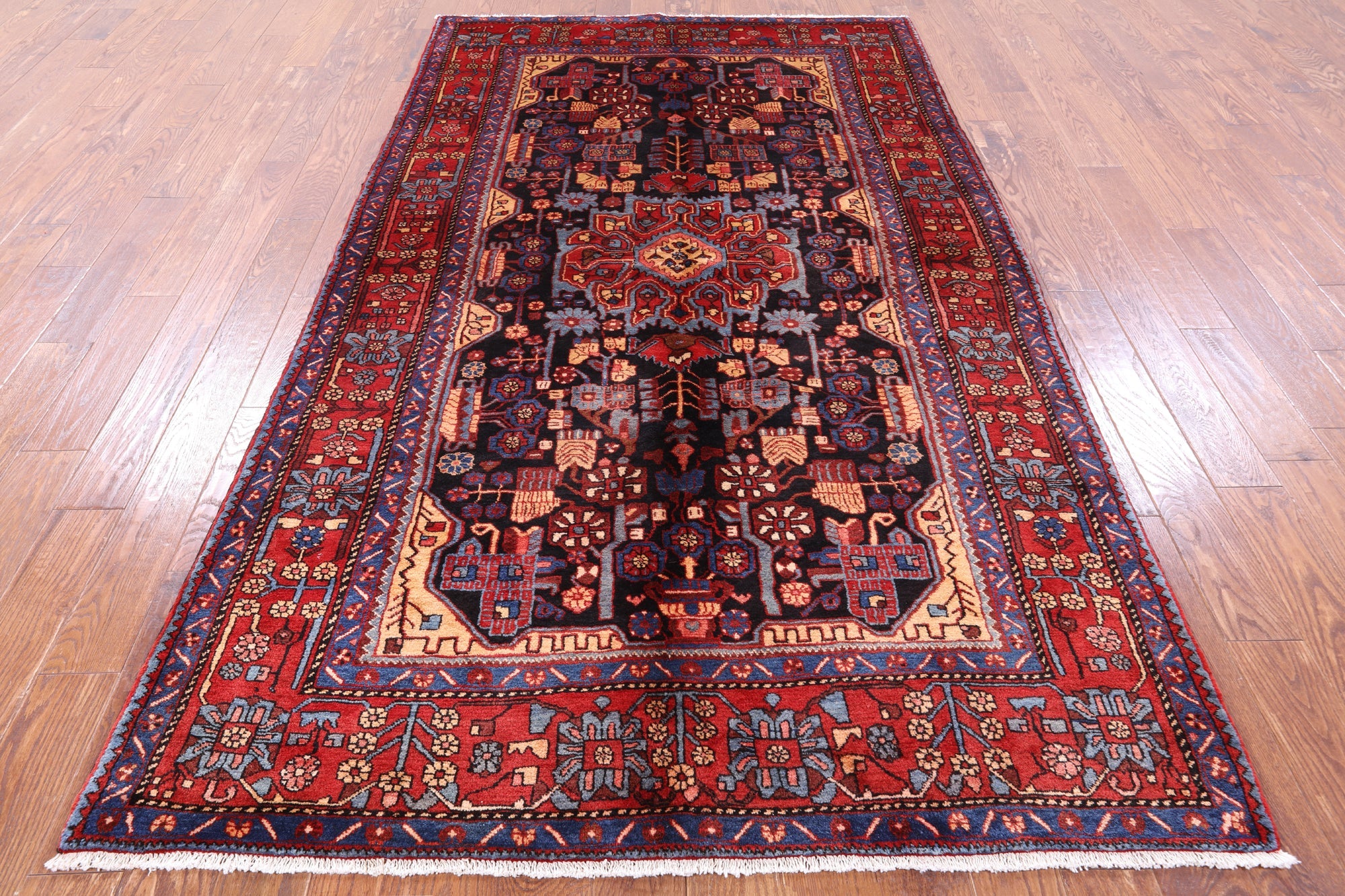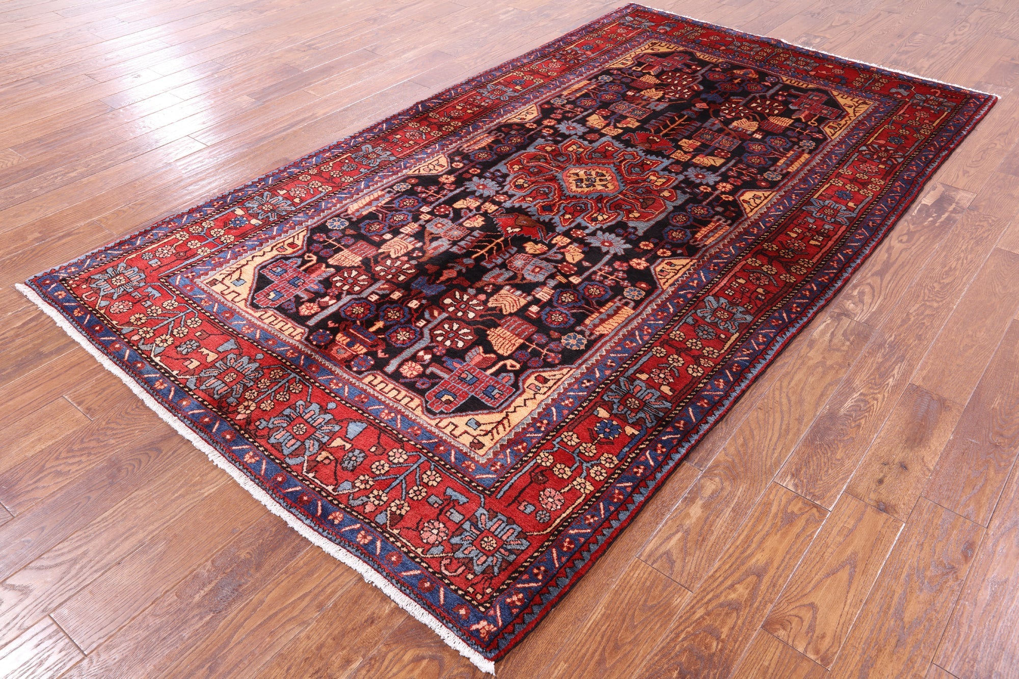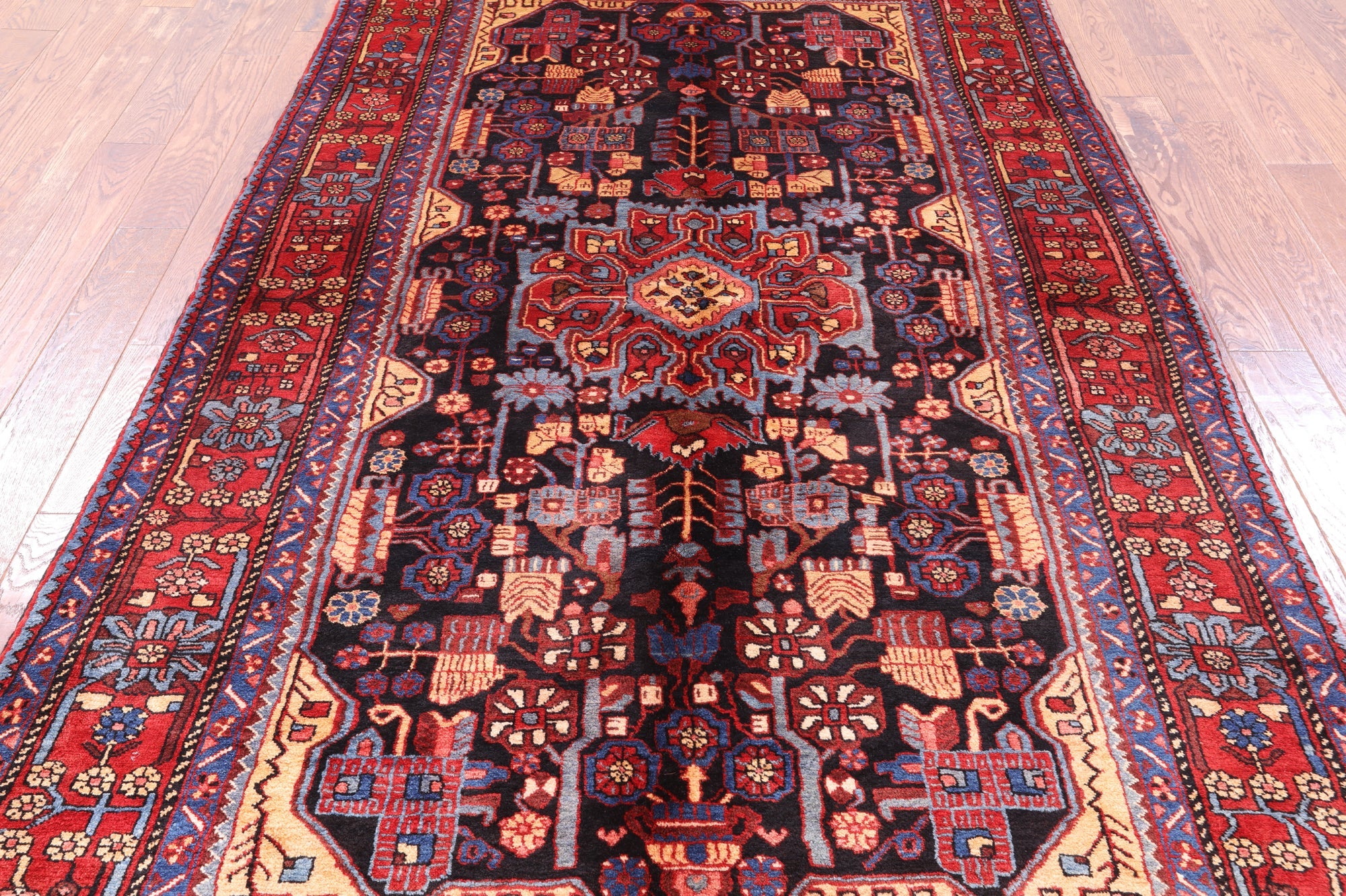 Nahavand rugs comes from the city of Nahavand in Persia. These rugs have a tribal style look, often using floral medallions and a variety of vegetable dyed colors such as reds, blues, greens and different shades of ivory. Nahavand rugs are made with very high quality wool, which gives it a shine. They are very durable rugs that will last a lifetime.