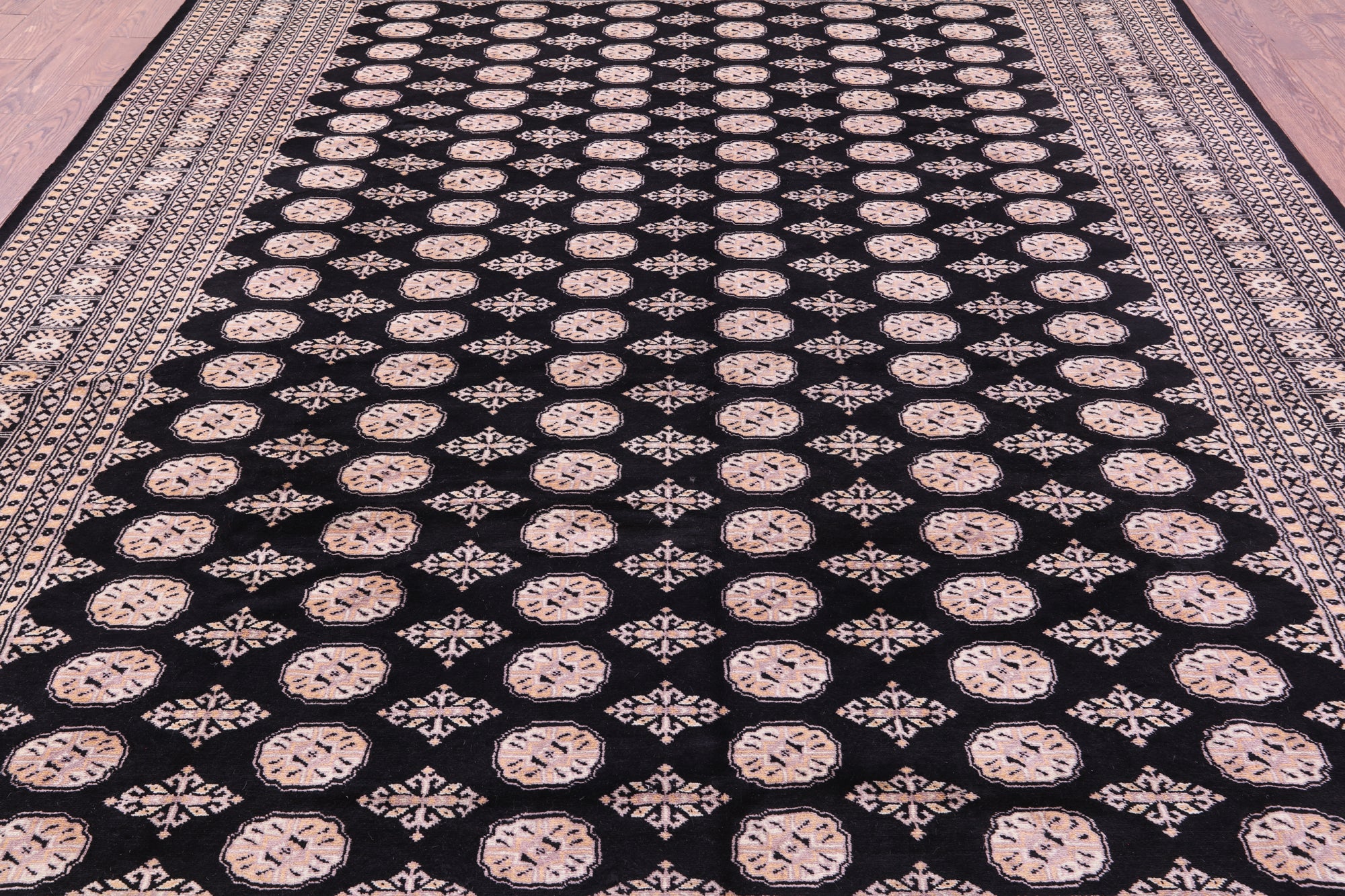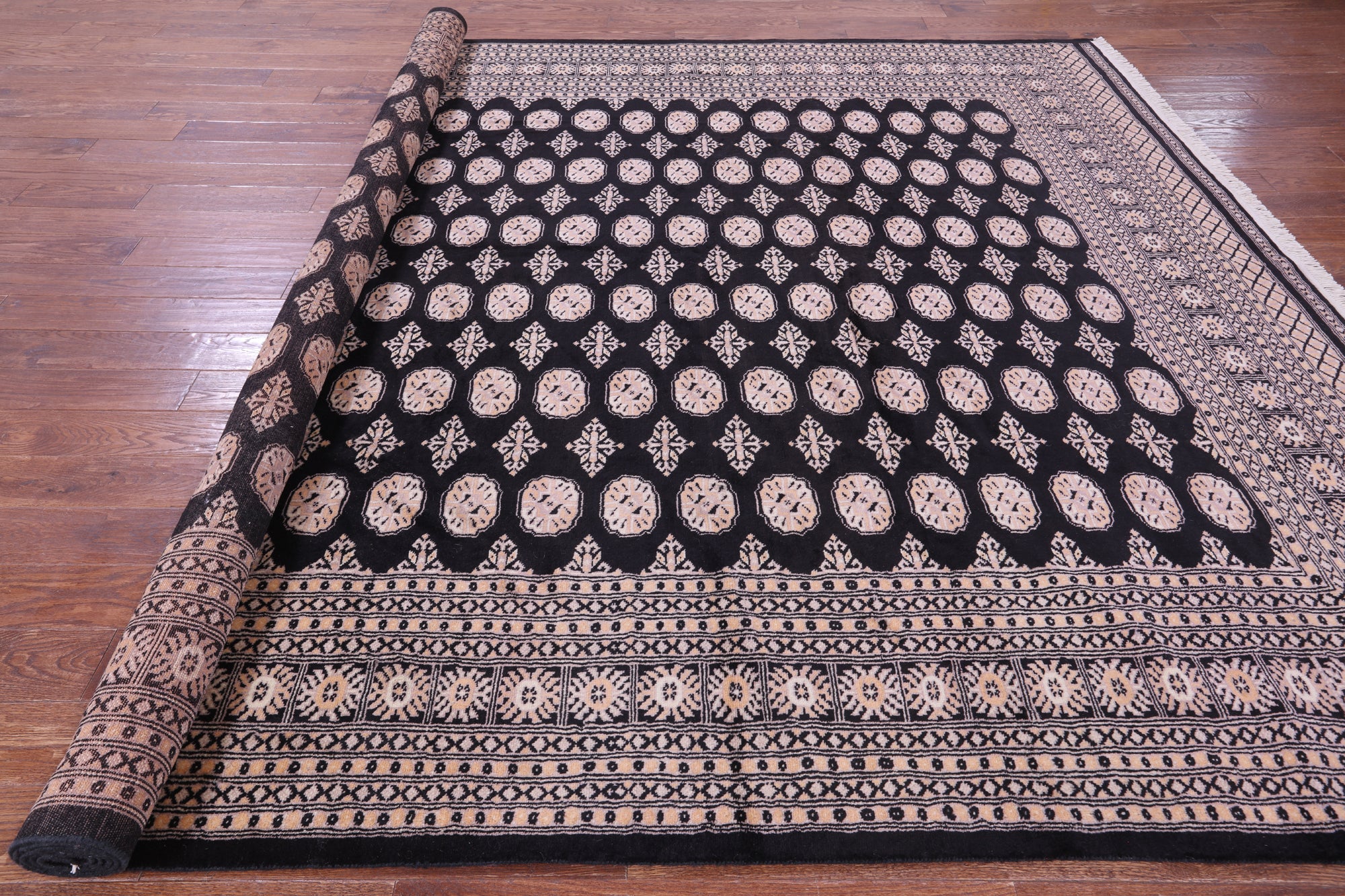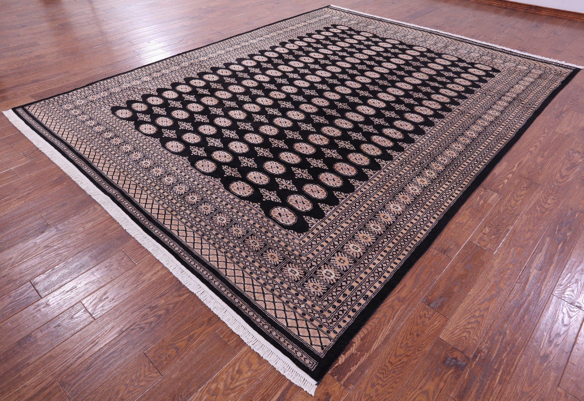 Black Silky Bokhara Hand-Knotted Wool Rug 9' 2" X 12' 0" - Q23763 is backordered and will ship as soon as it is back in stock.