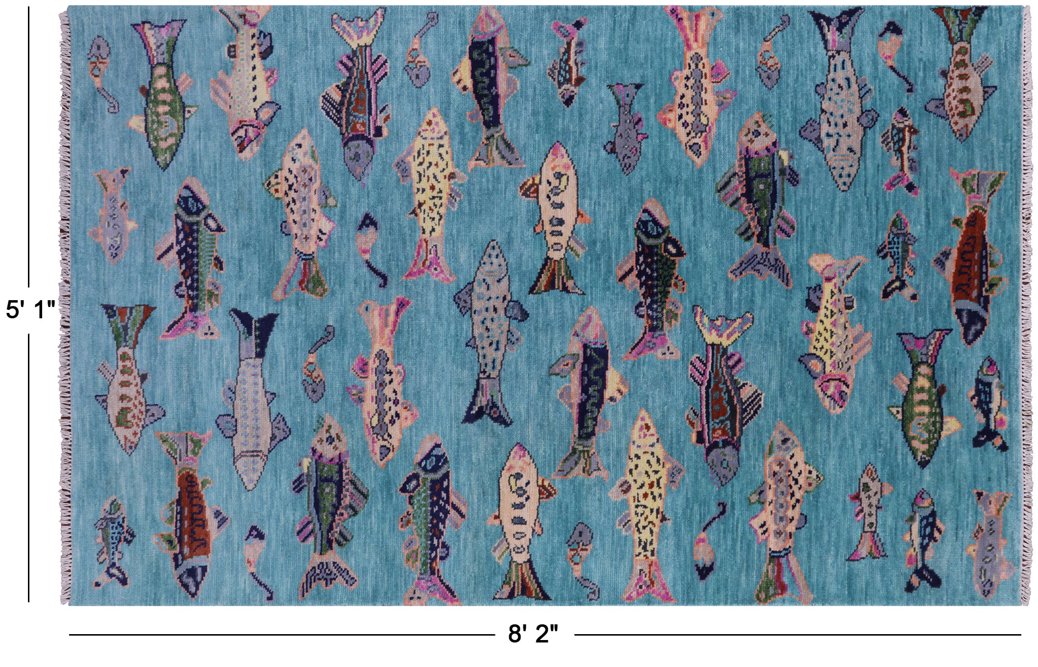 Blue 5' 1" X 8' 2" Gabbeh Fish Design Hand-Knotted Wool Rug - Q15349