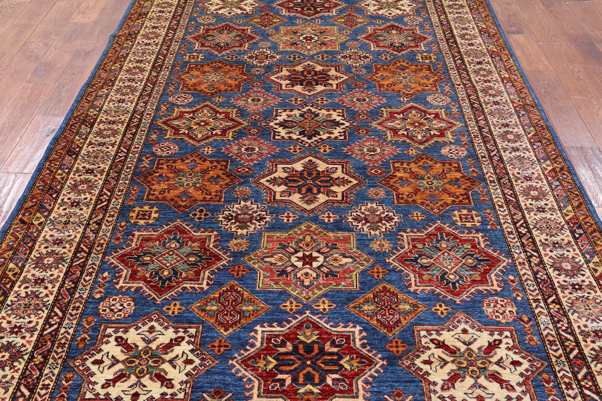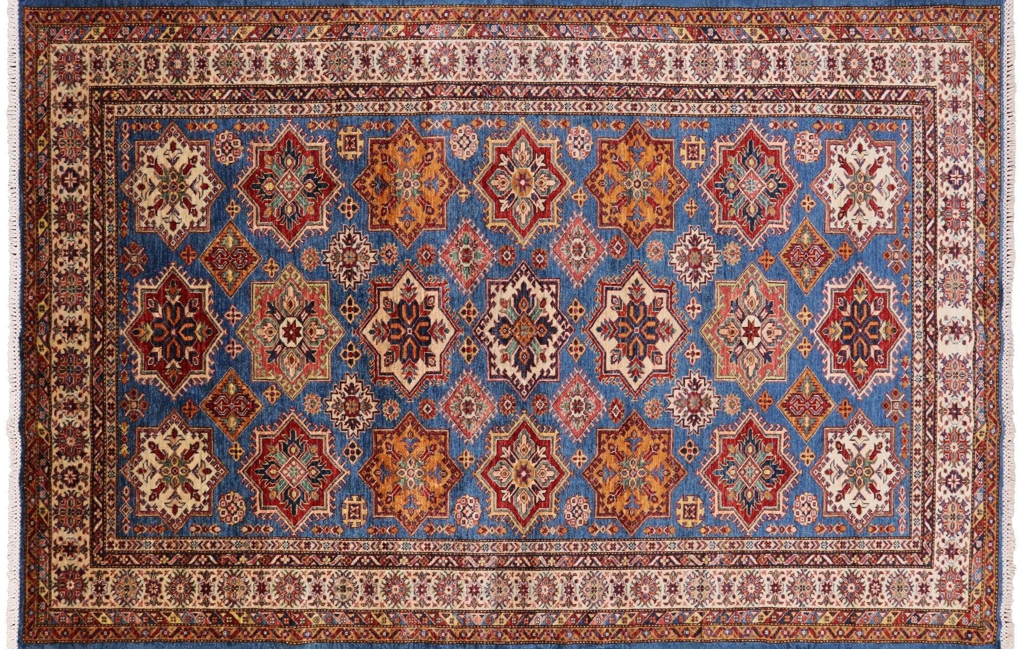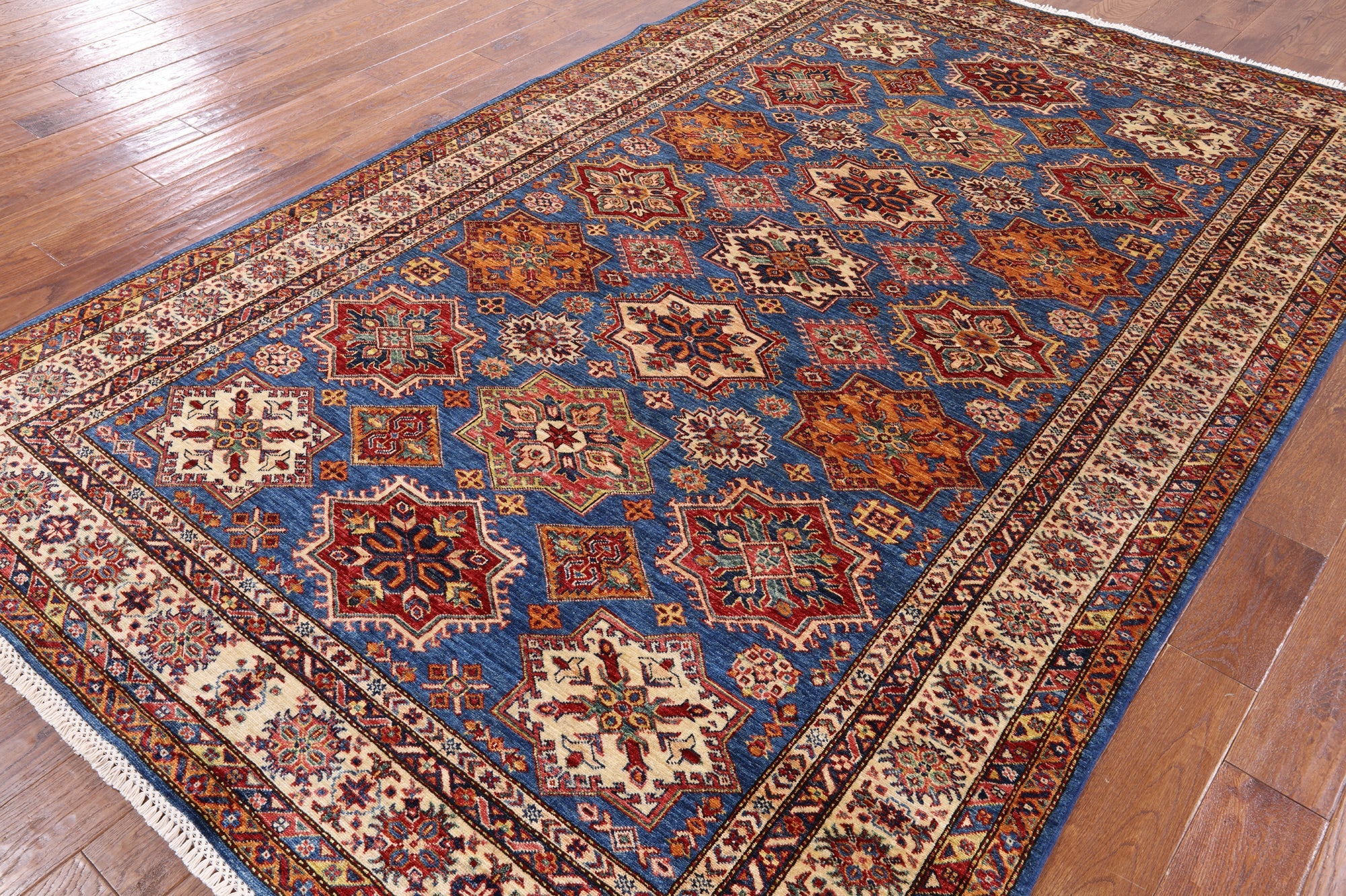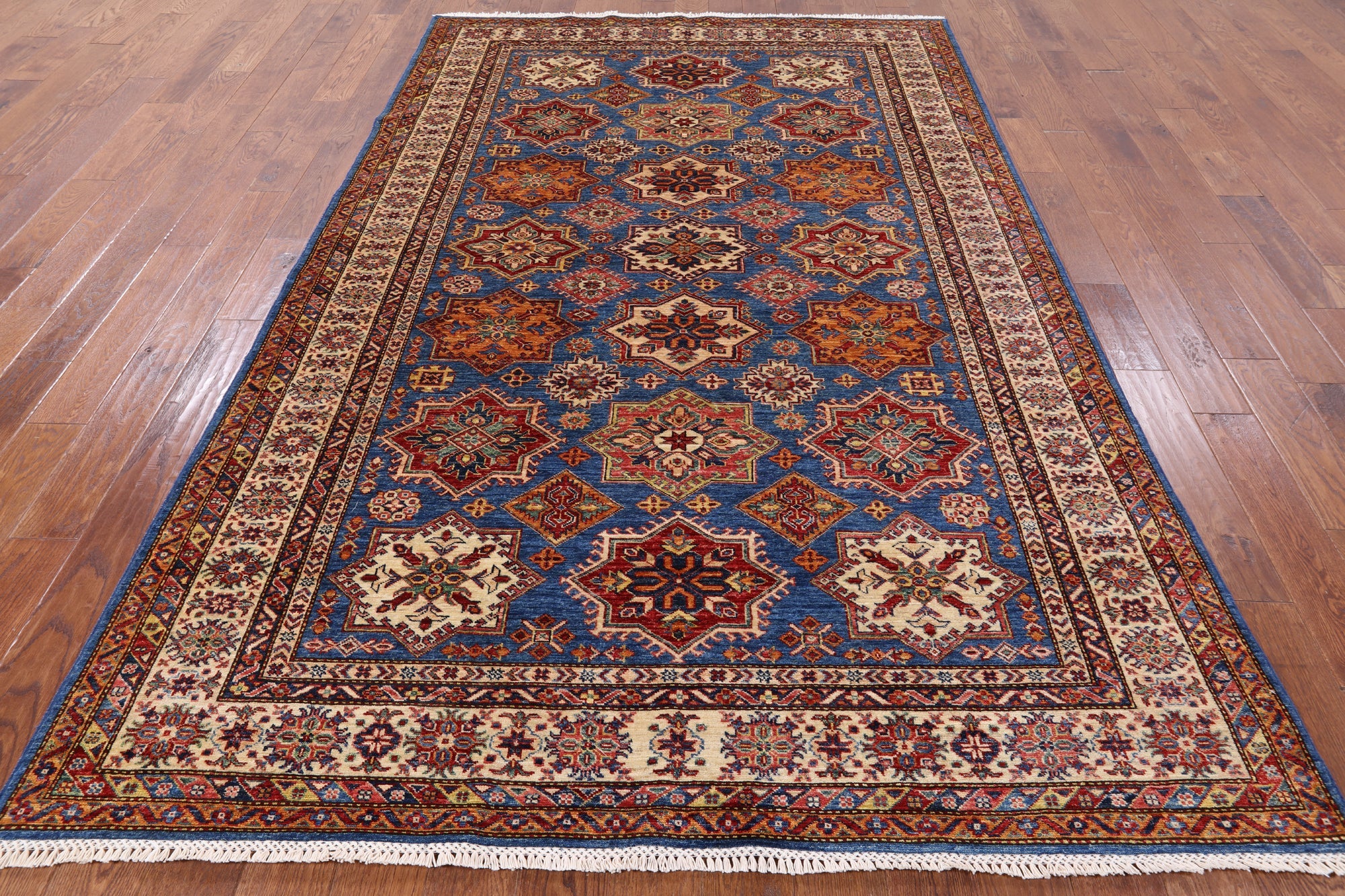 Blue Geometric Super Kazak Hand Knotted Area Rug 6' 3" X 9' 9" - P8986