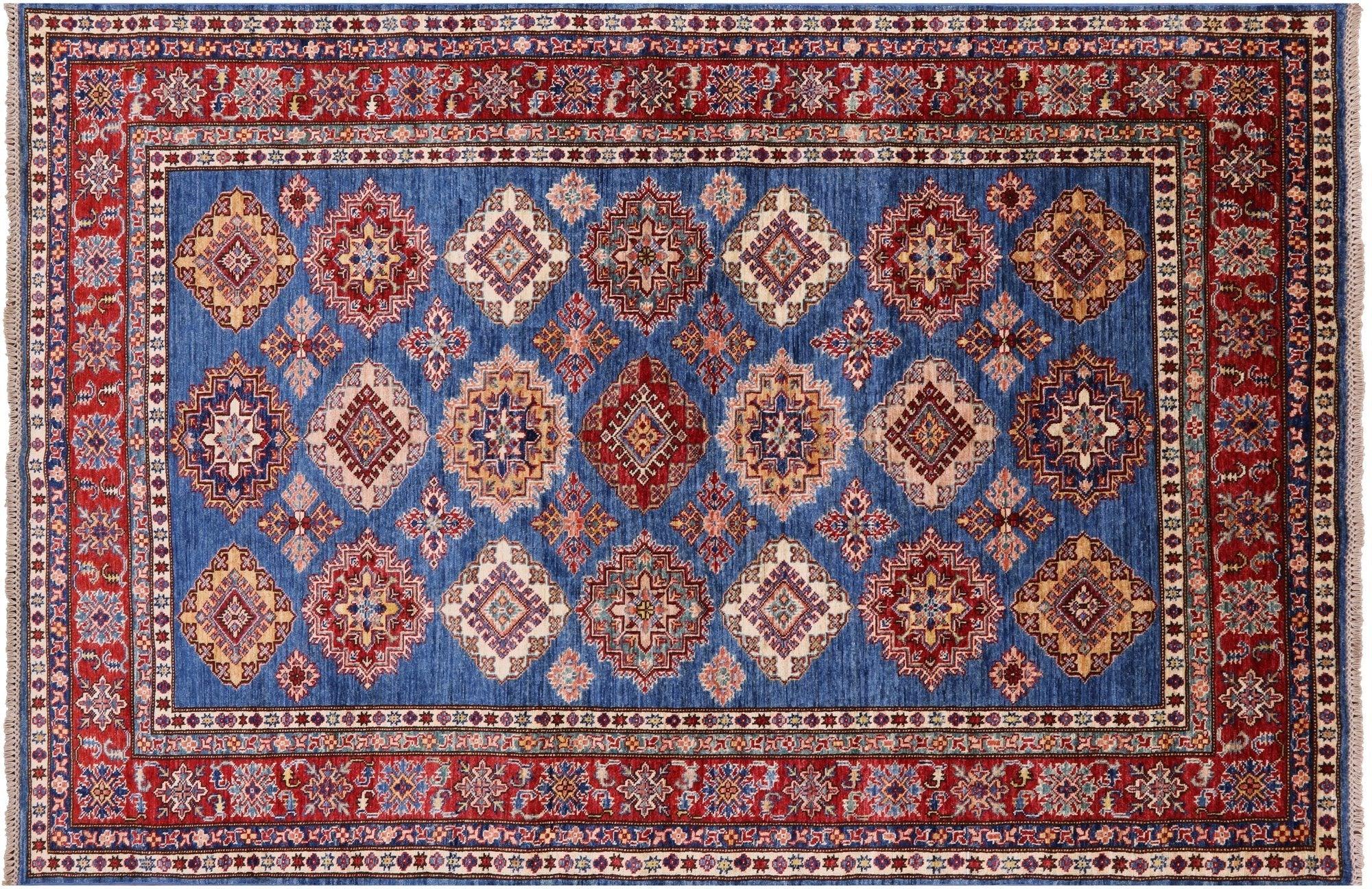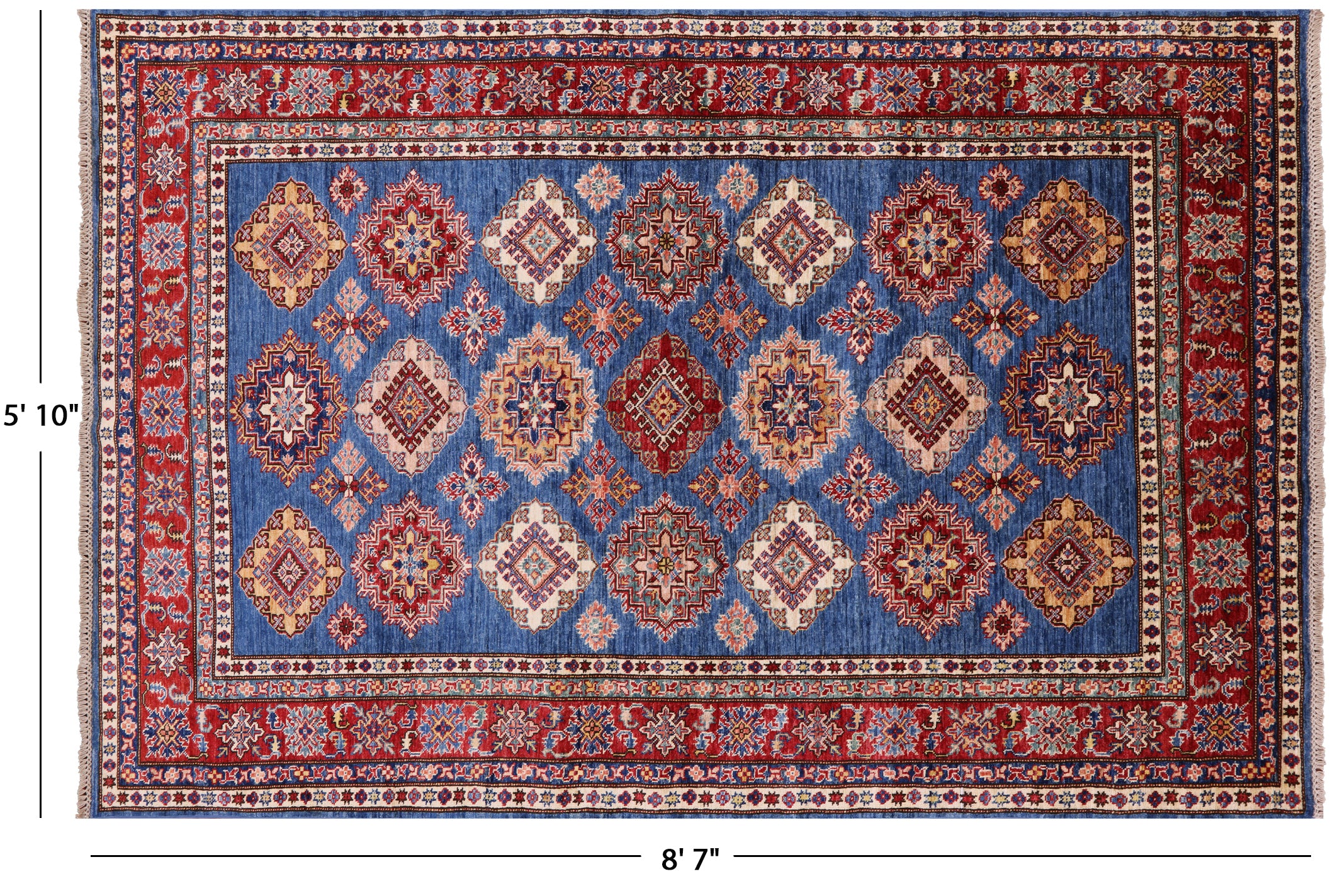 Blue 5' 10" X 8' 7" Geometric Super Kazak Hand-Knotted Wool Rug - Q12941