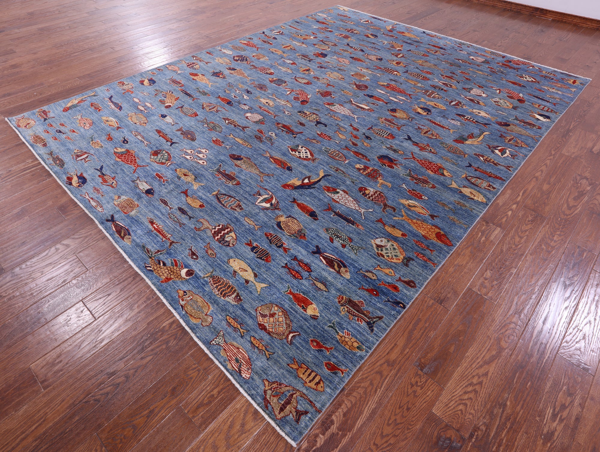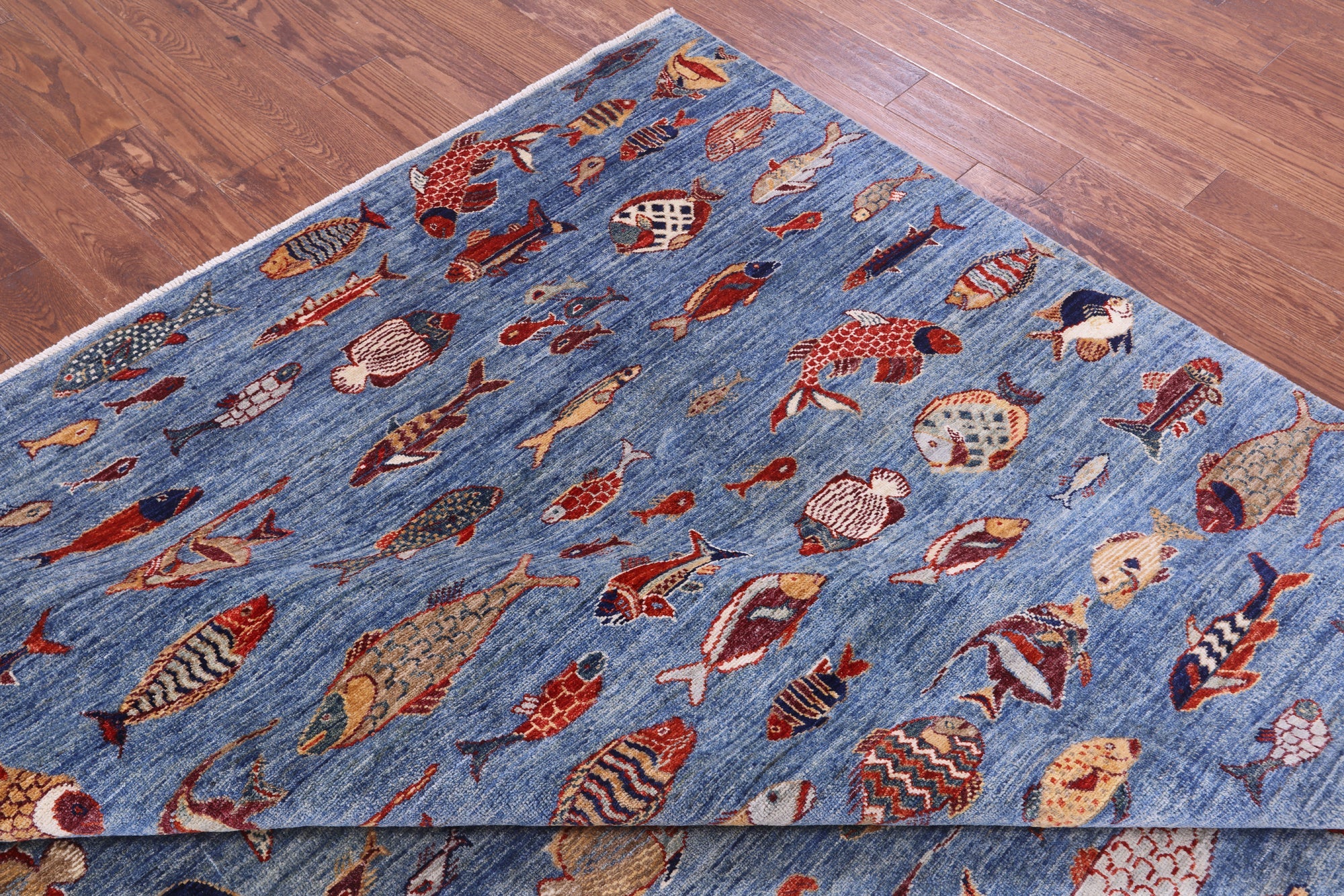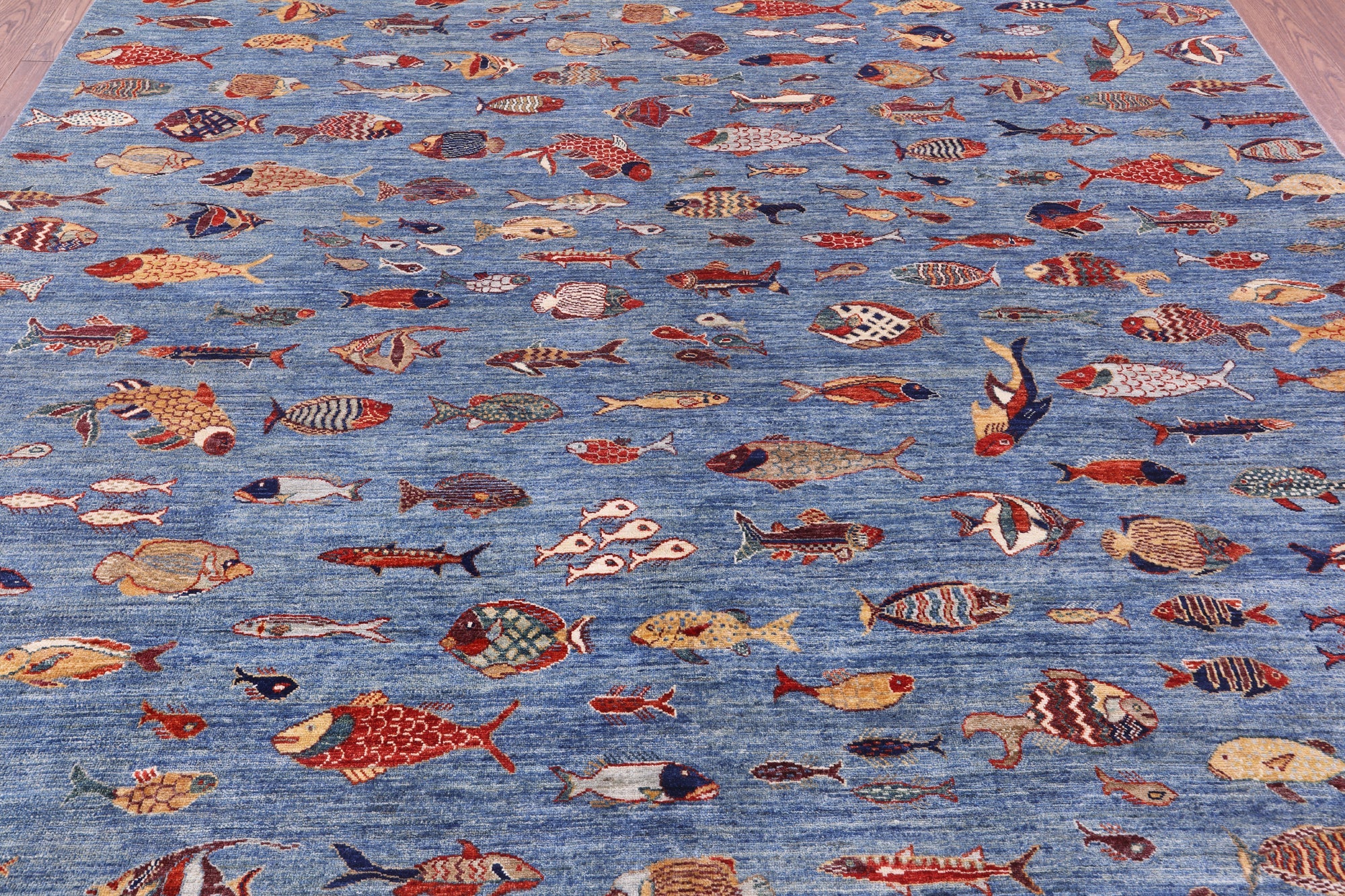 Blue 9' 0" X 11' 9" Hand-Knotted Gabbeh Fish Design Rug - Q20406 is backordered and will ship as soon as it is back in stock.