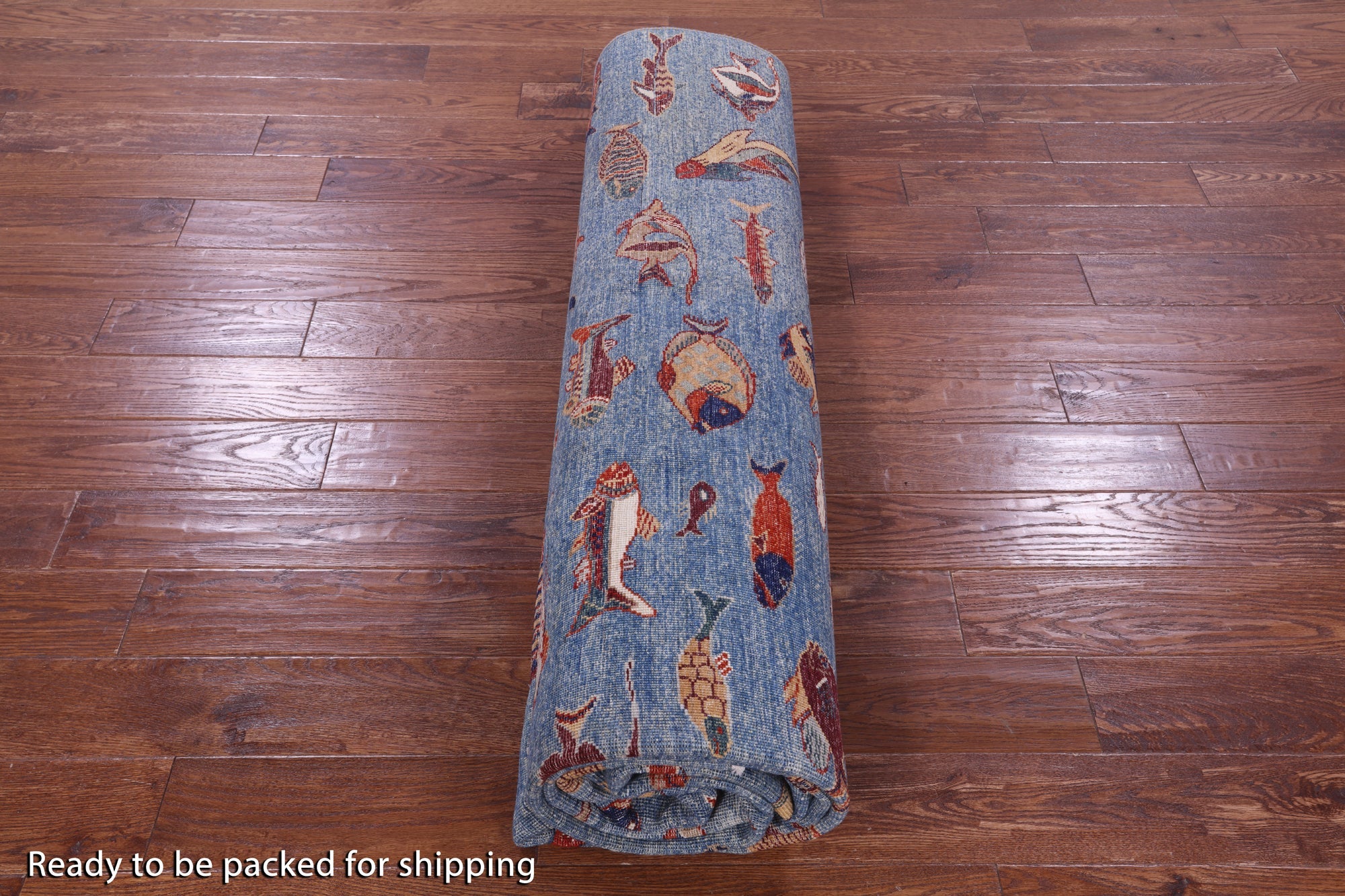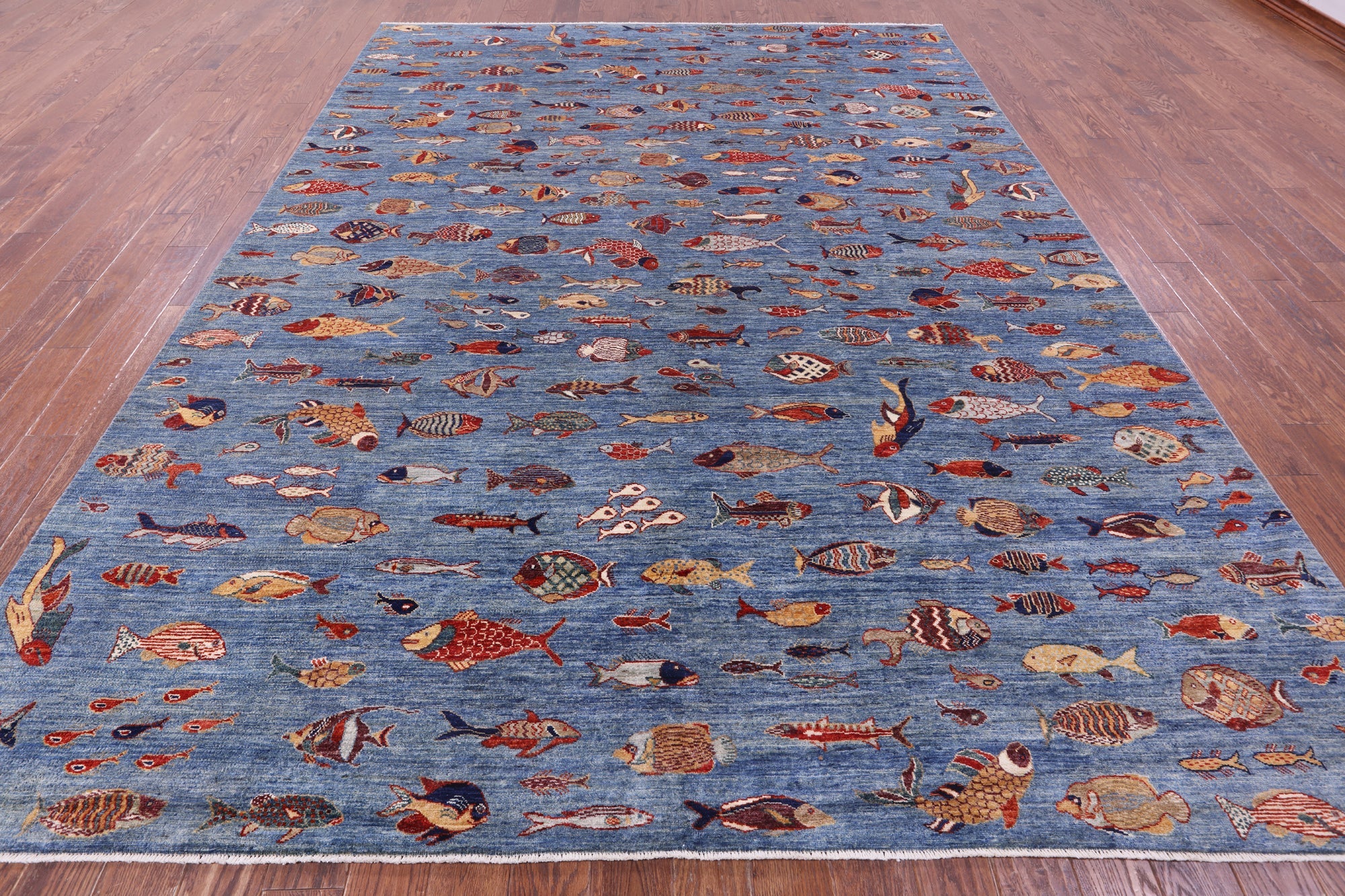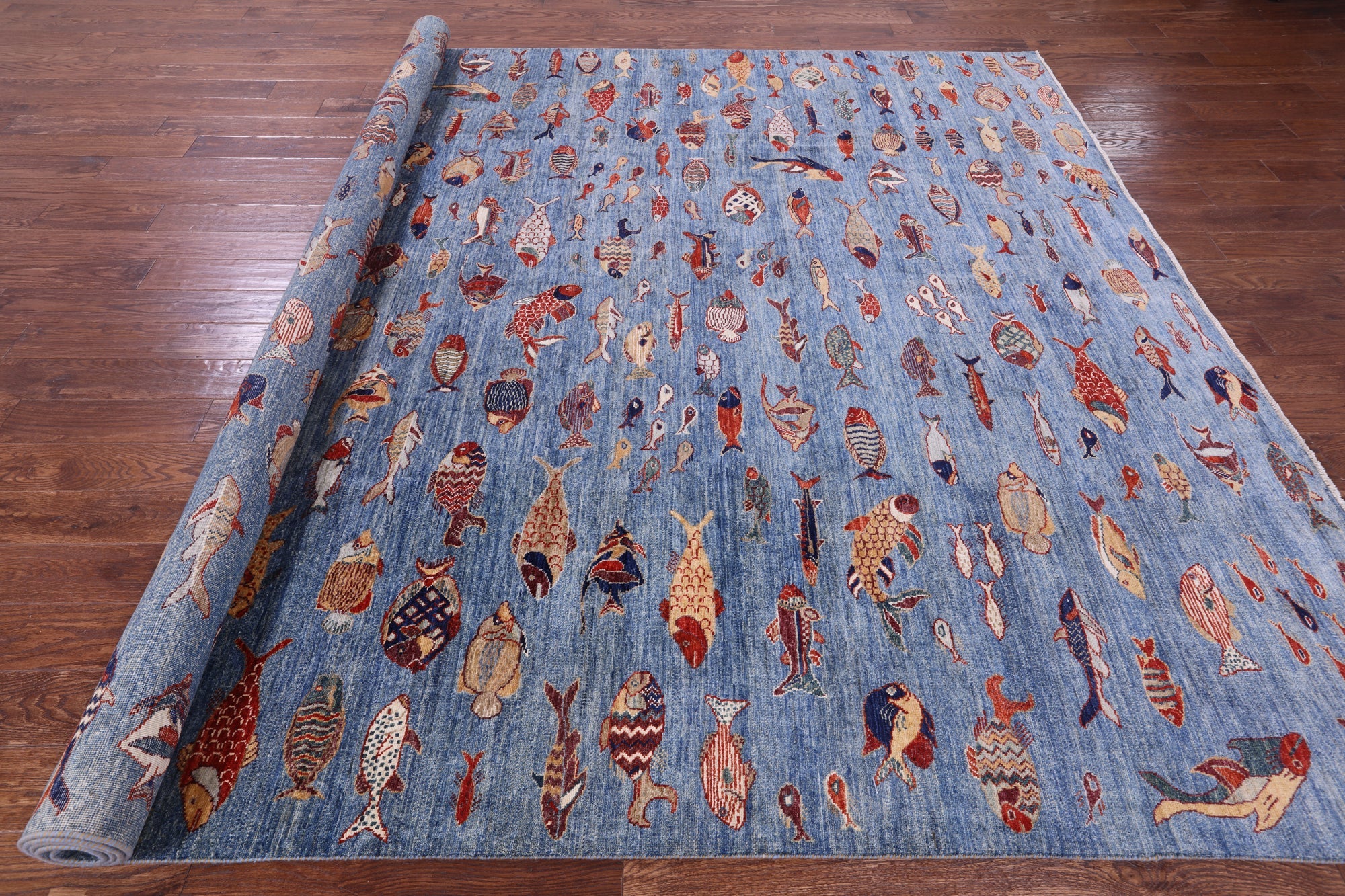 Blue 9' 0" X 11' 9" Hand-Knotted Gabbeh Fish Design Rug - Q20406 is backordered and will ship as soon as it is back in stock.