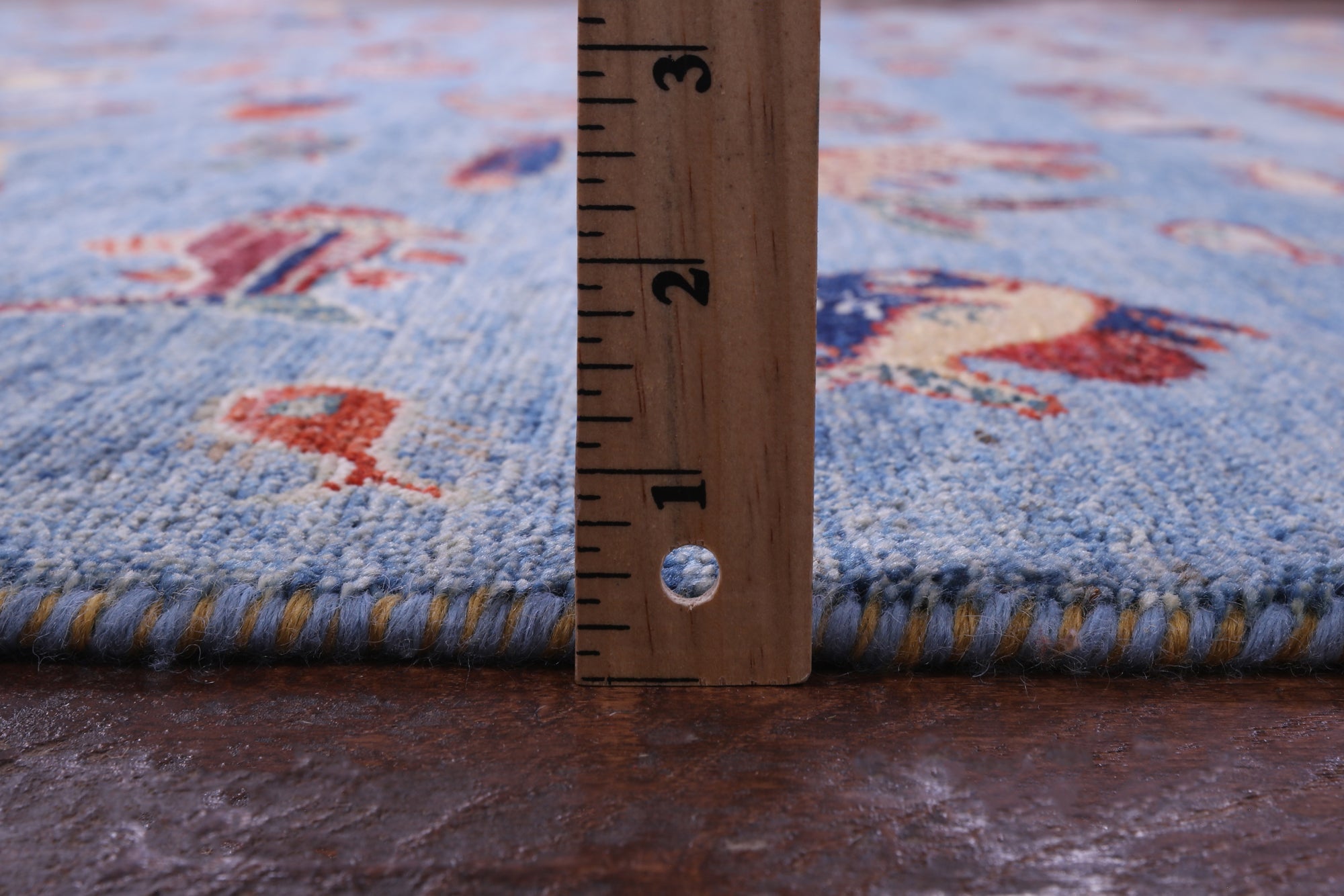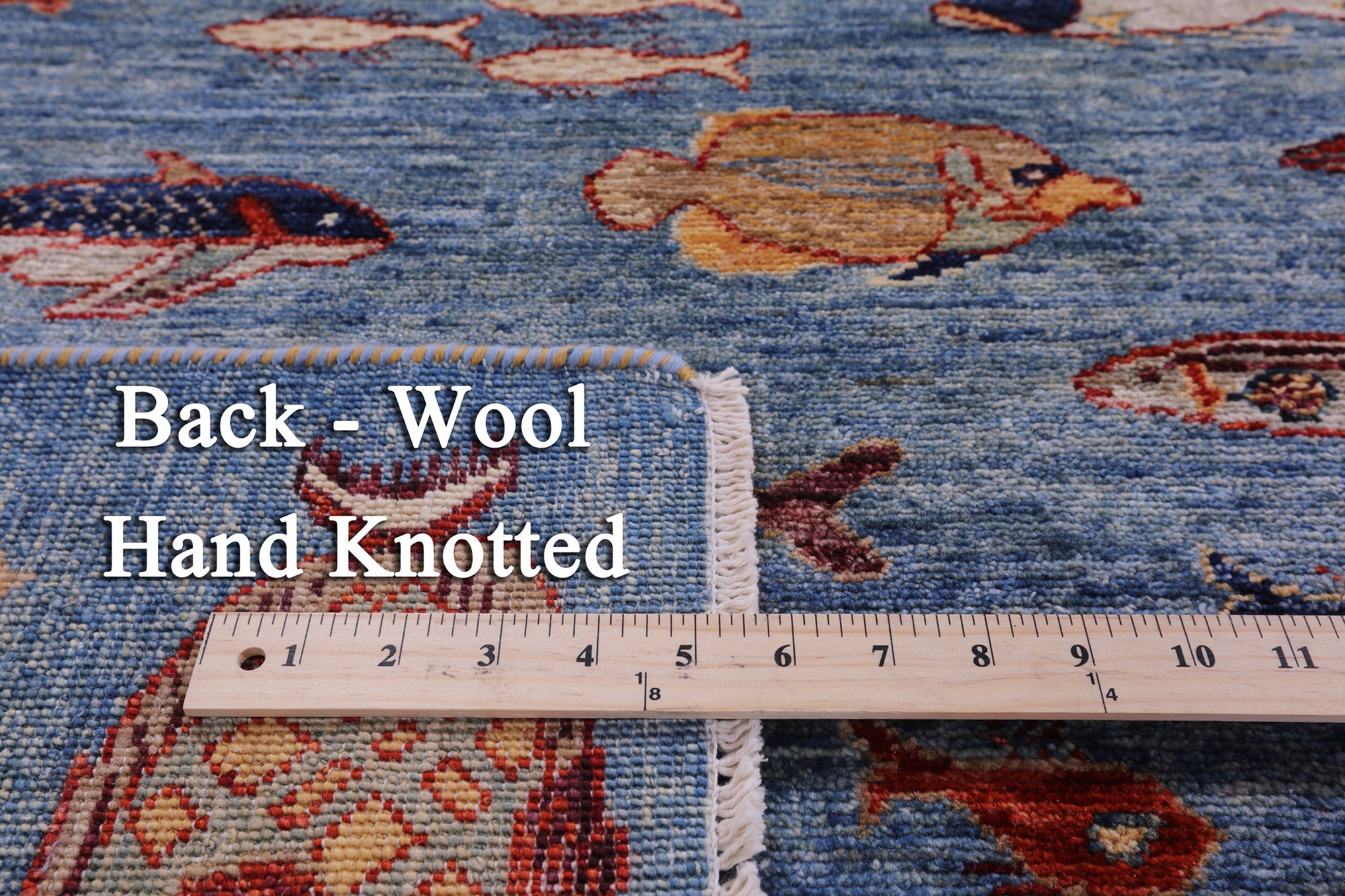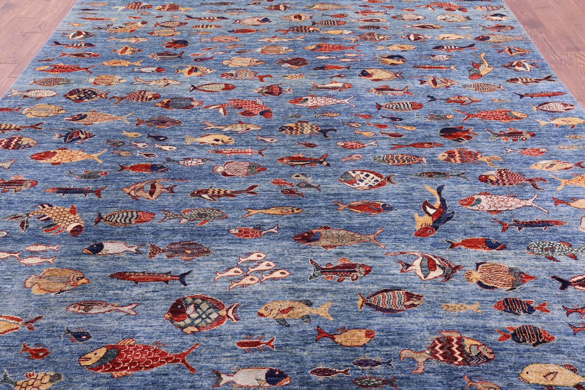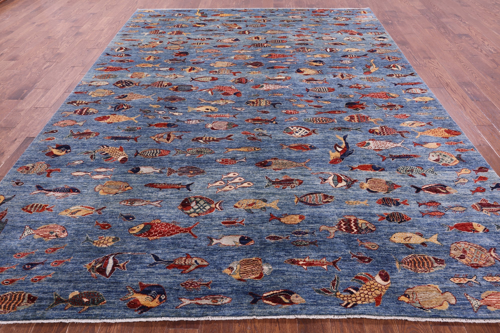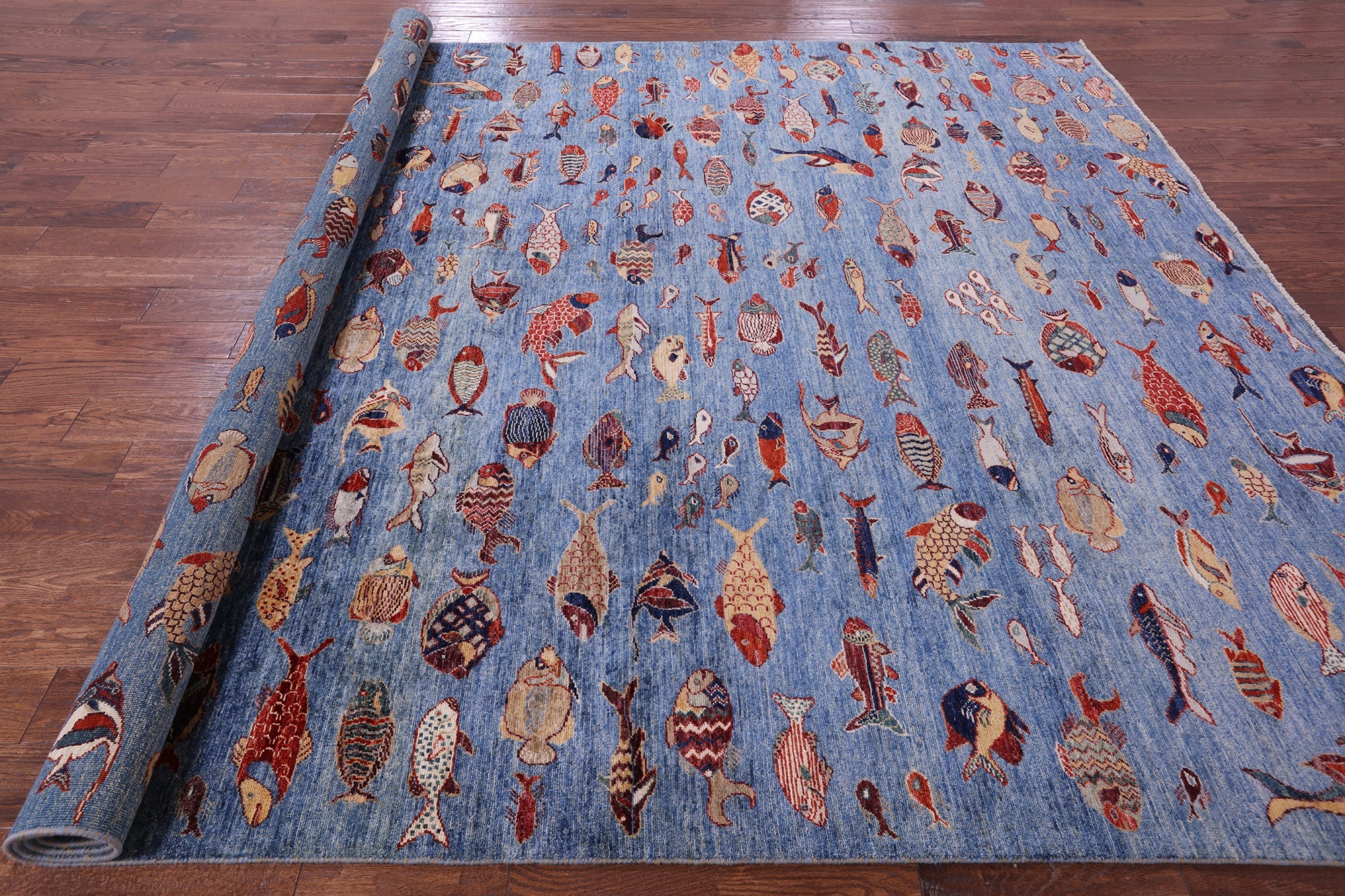 Blue Handmade Gabbeh Fish Design Wool Rug 9' 0" X 11' 9" - Q20404 is backordered and will ship as soon as it is back in stock.