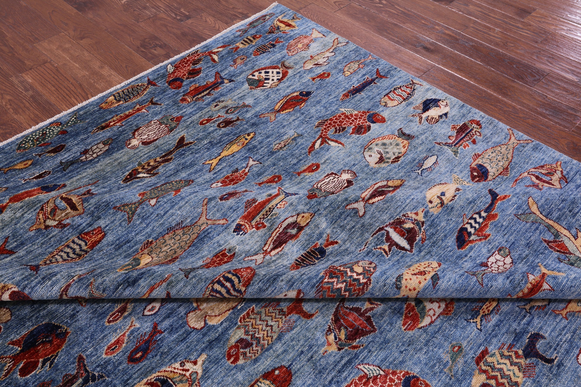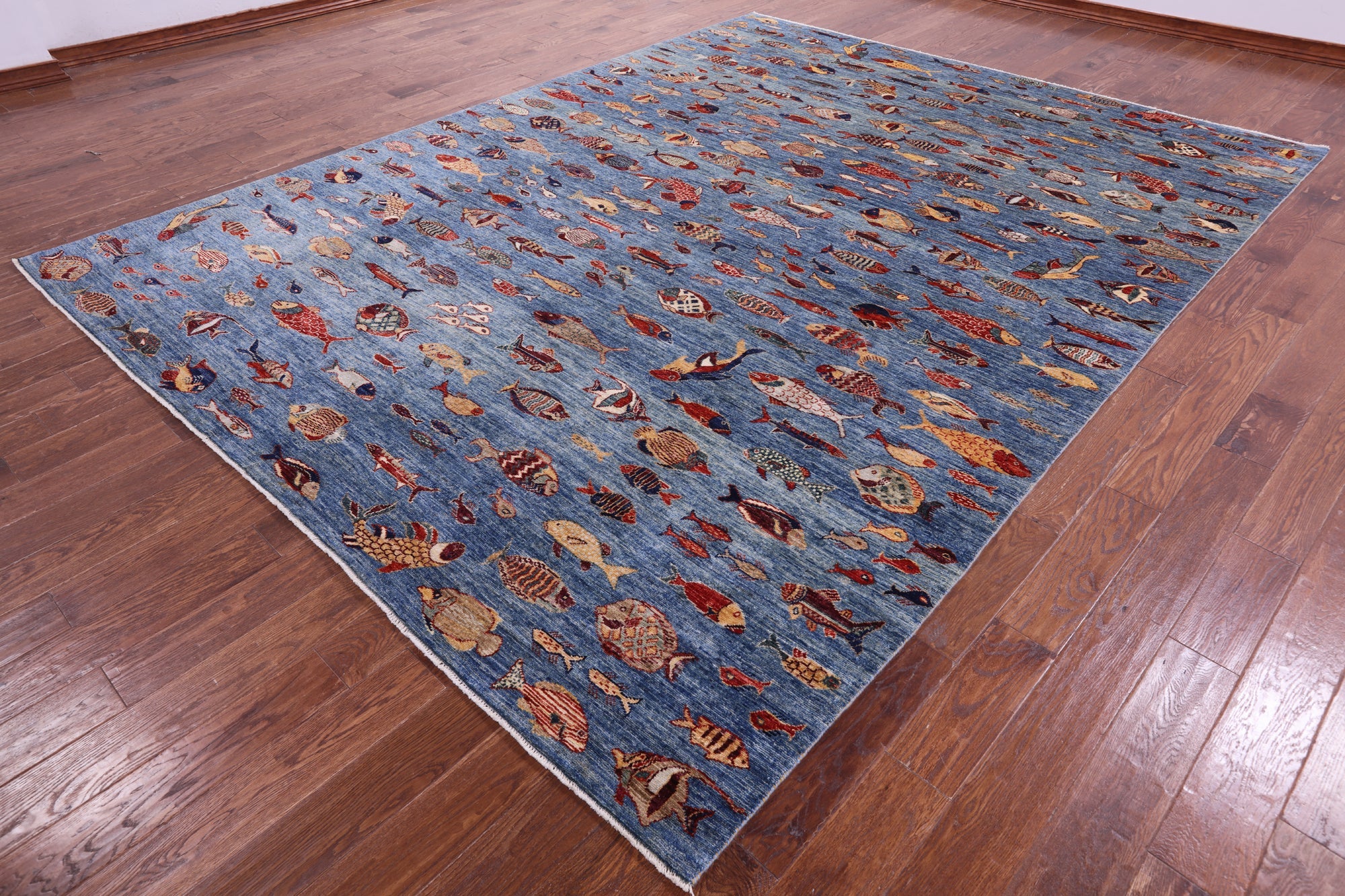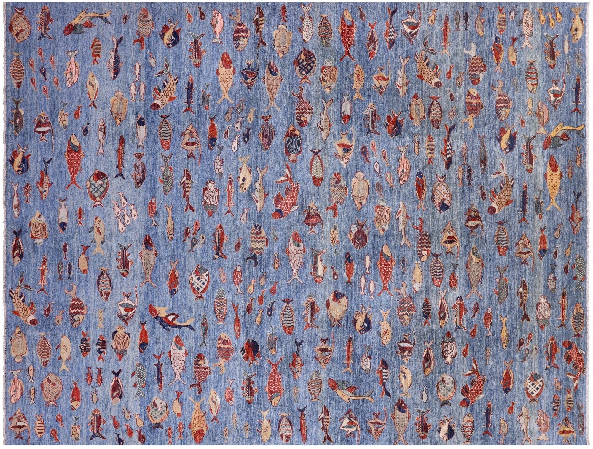 Blue Handmade Gabbeh Fish Design Wool Rug 9' 0" X 11' 9" - Q20404