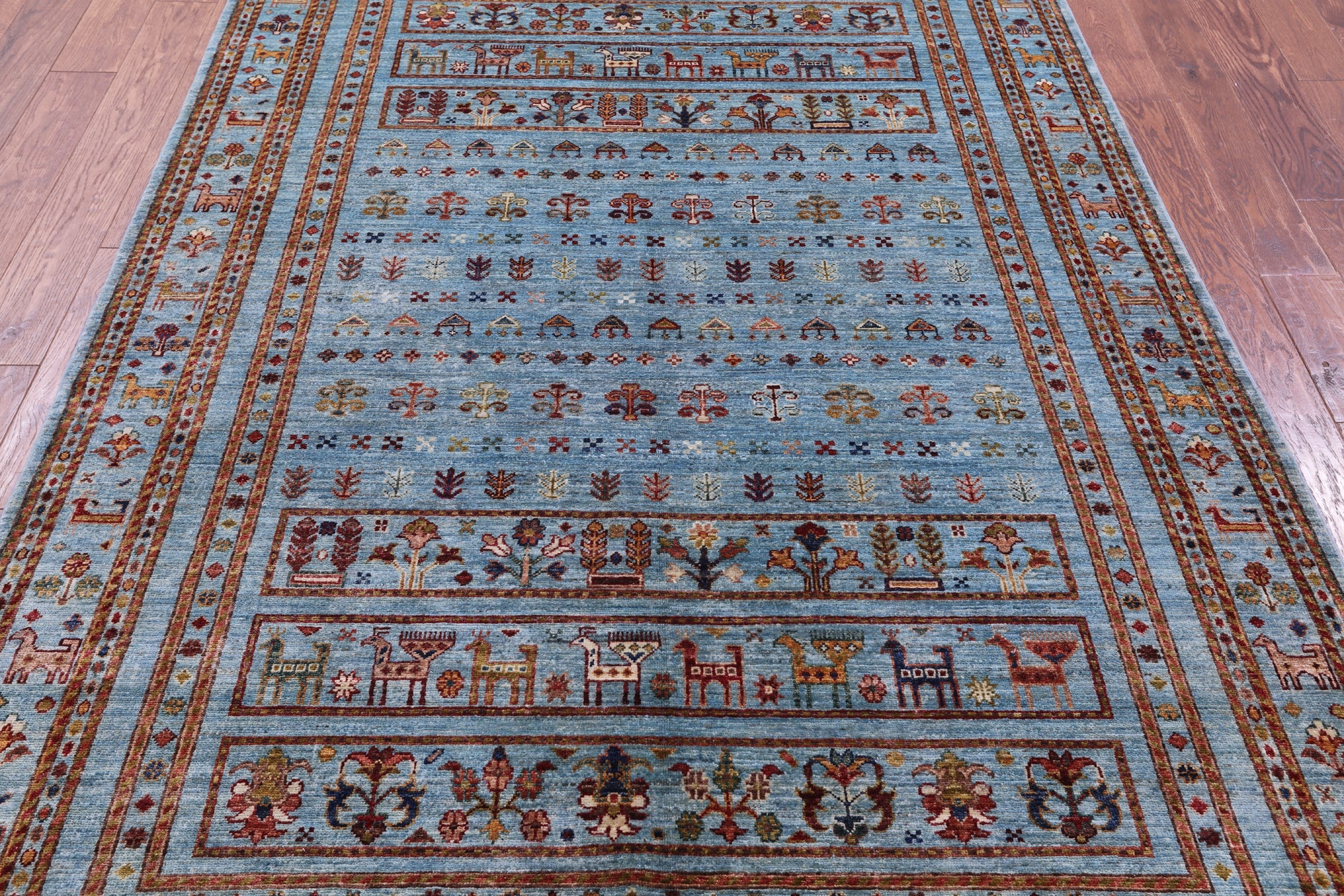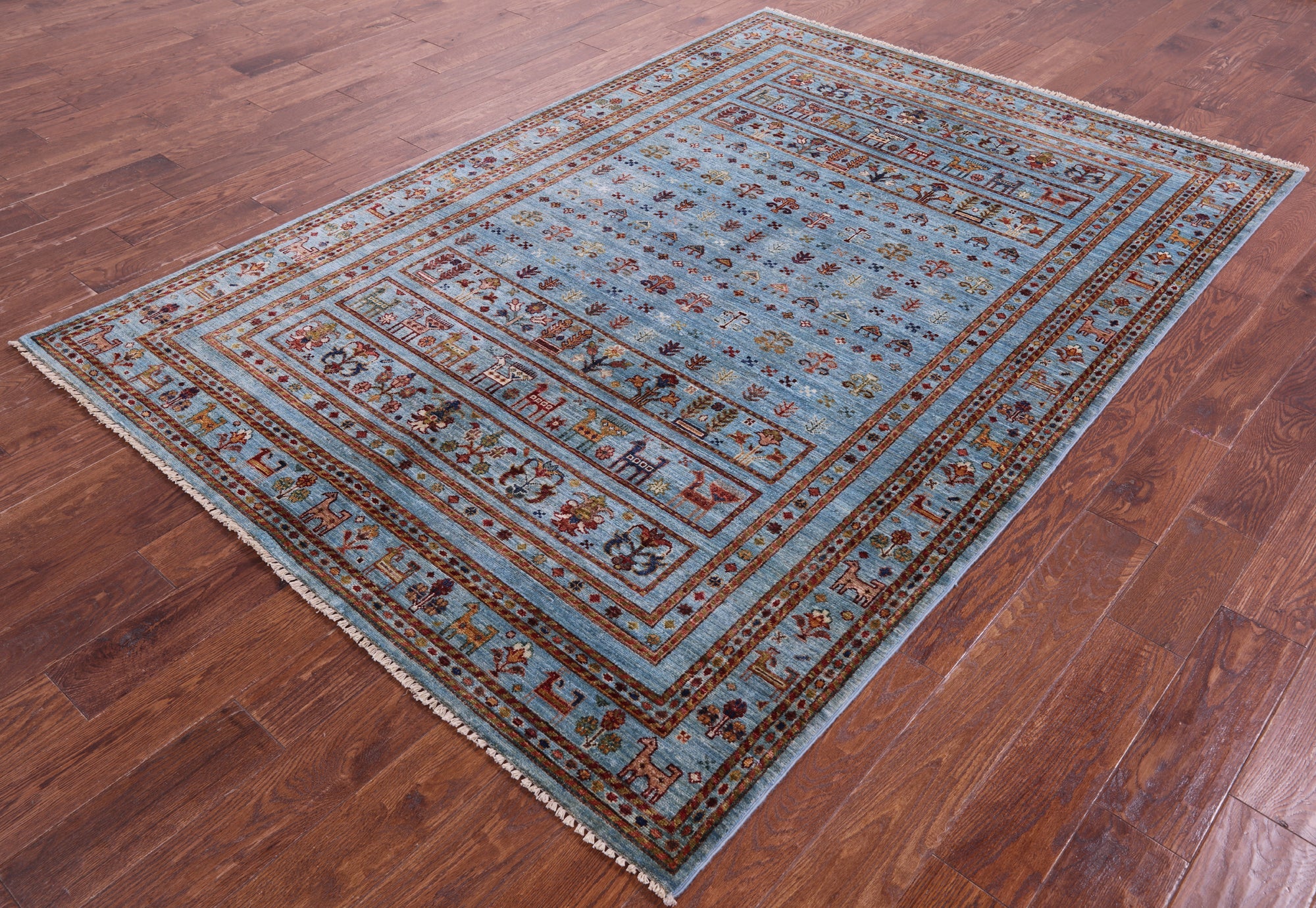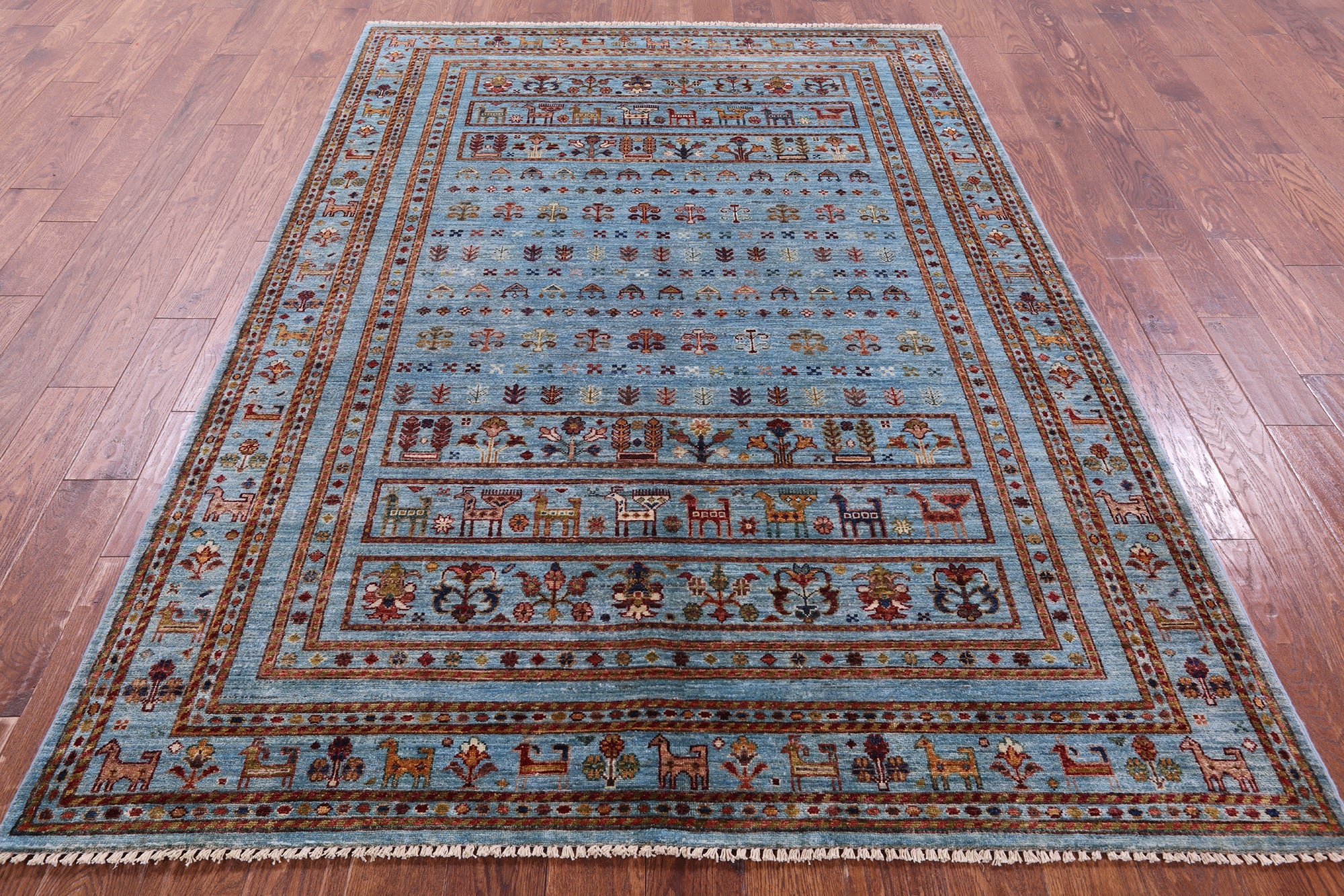 Blue Handmade Tribal Persian Gabbeh Wool Rug 5' 10" X 8' 5" - Q20992 is backordered and will ship as soon as it is back in stock.