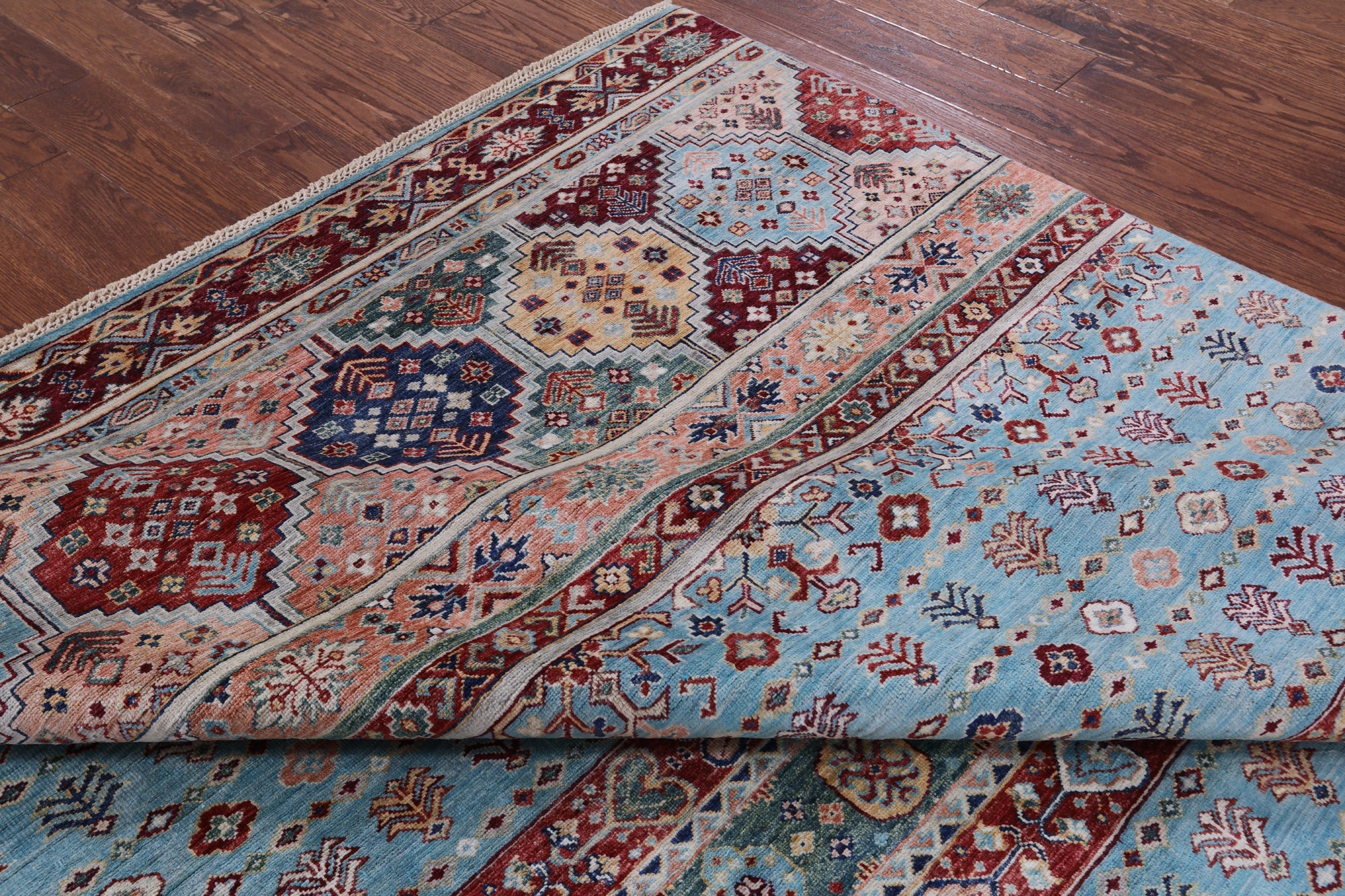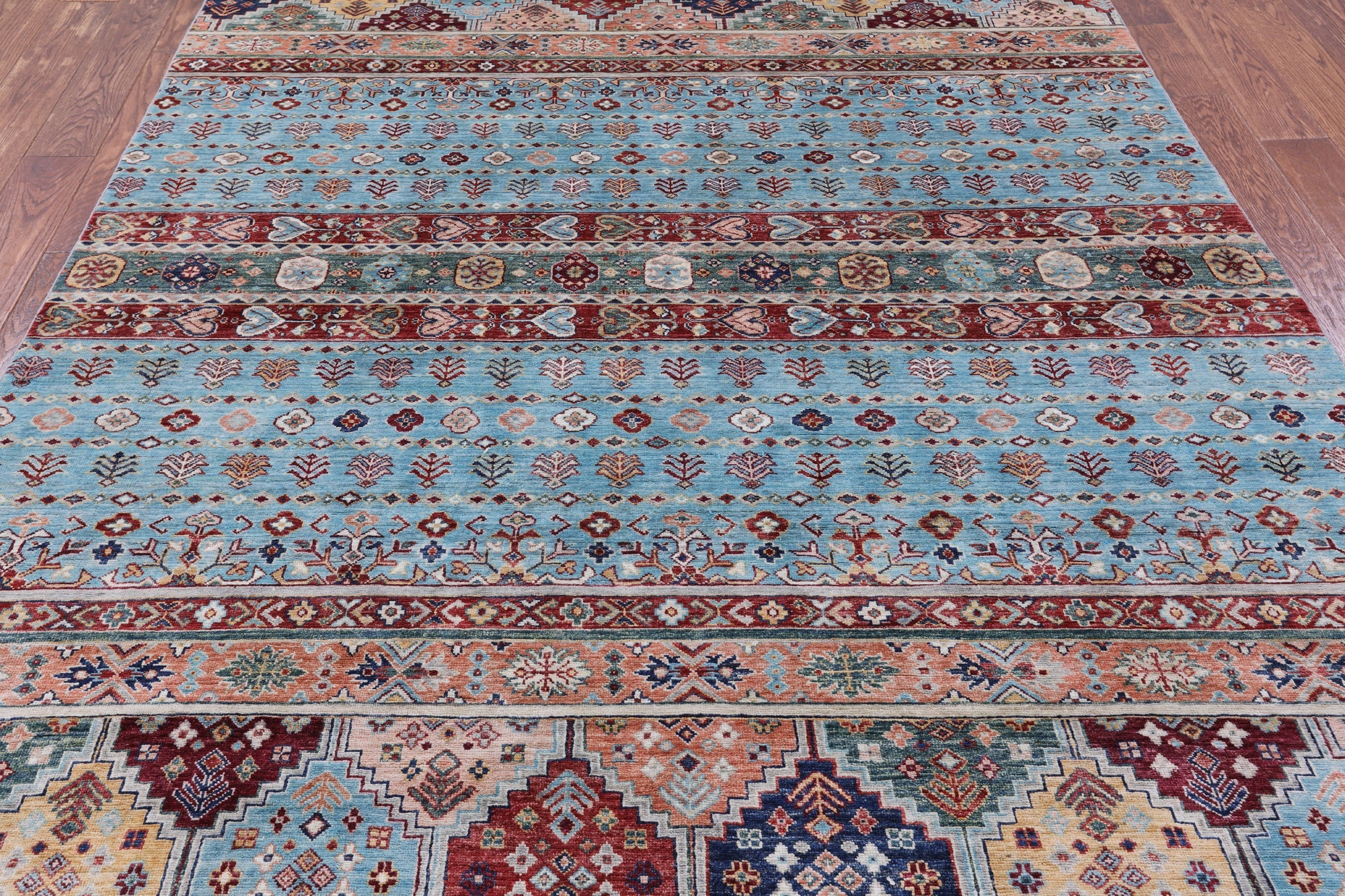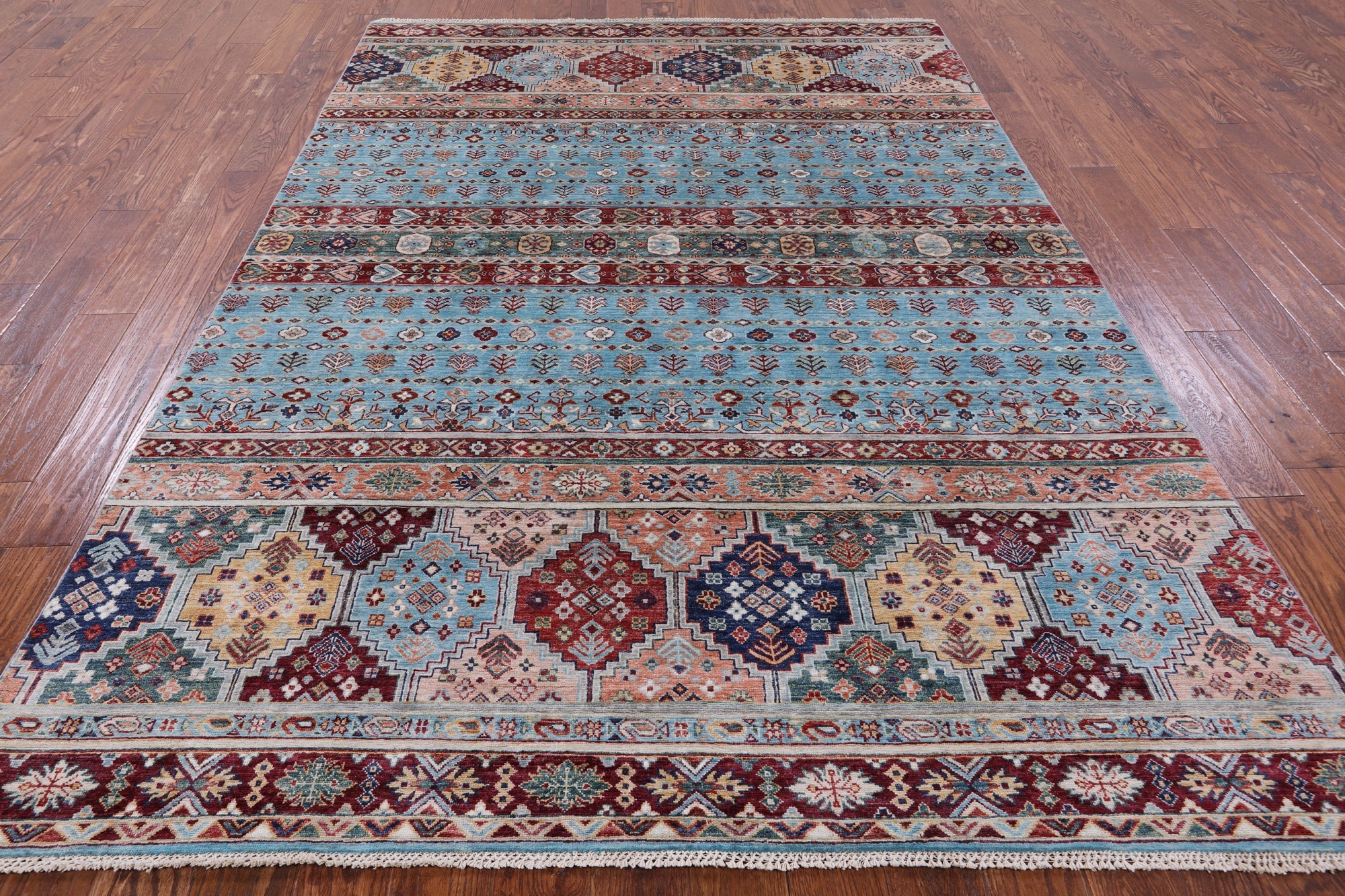 Blue 6' 7" X 9' 7" Khorjin Super Kazak Hand Knotted Wool Rug - Q7579 is backordered and will ship as soon as it is back in stock.