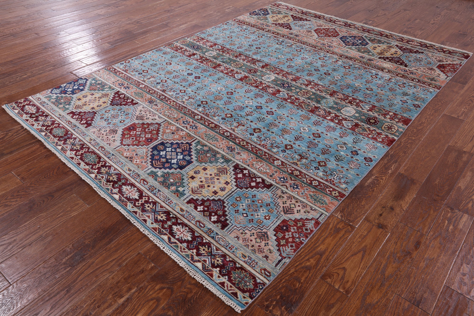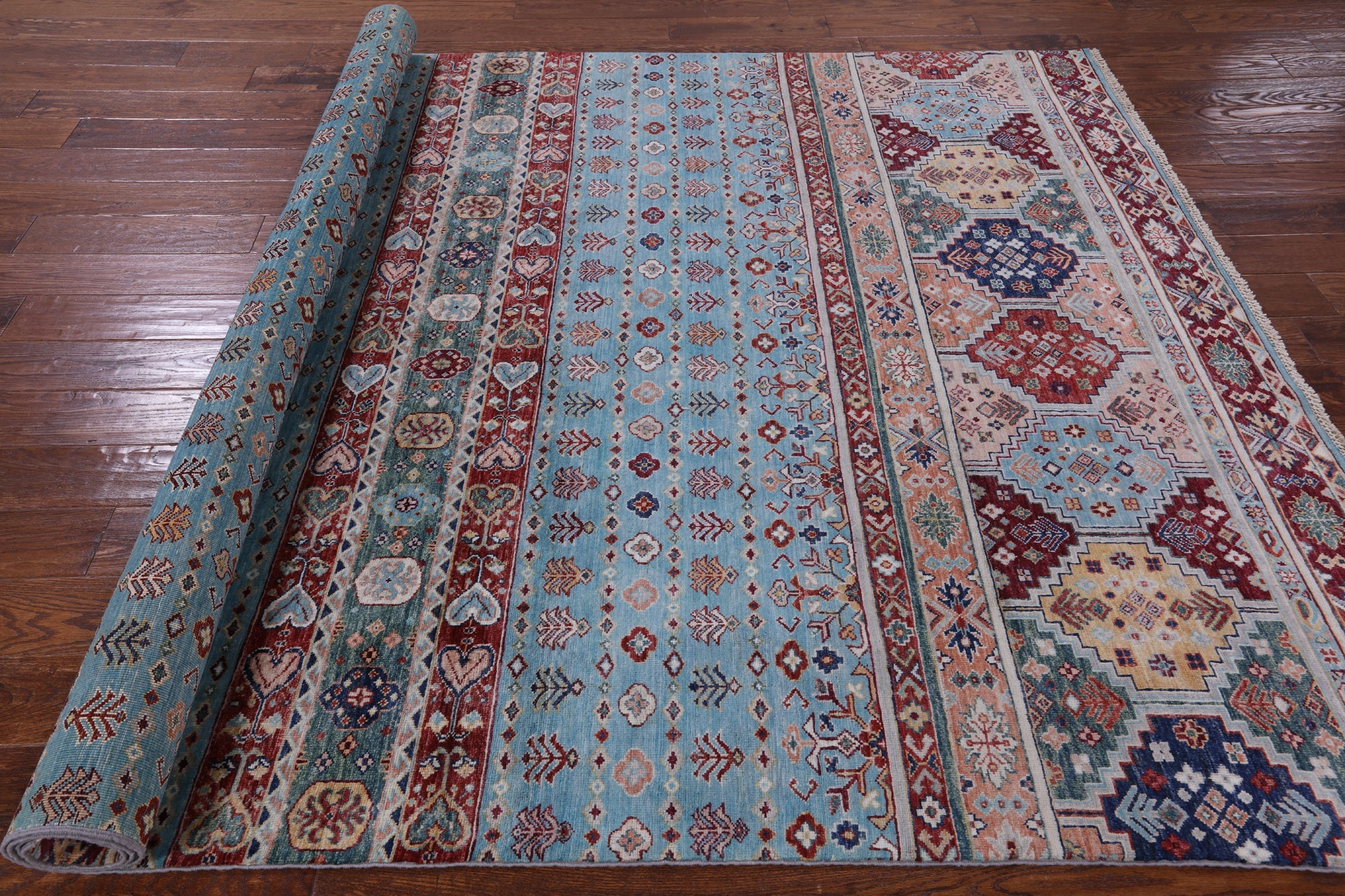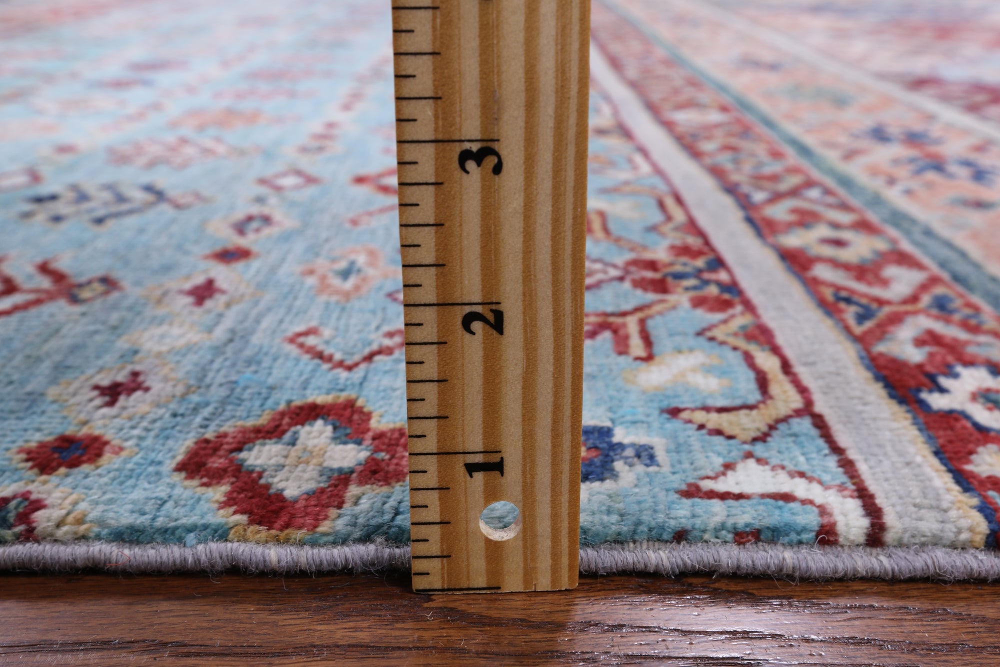 Blue 6' 7" X 9' 7" Khorjin Super Kazak Hand Knotted Wool Rug - Q7579 is backordered and will ship as soon as it is back in stock.