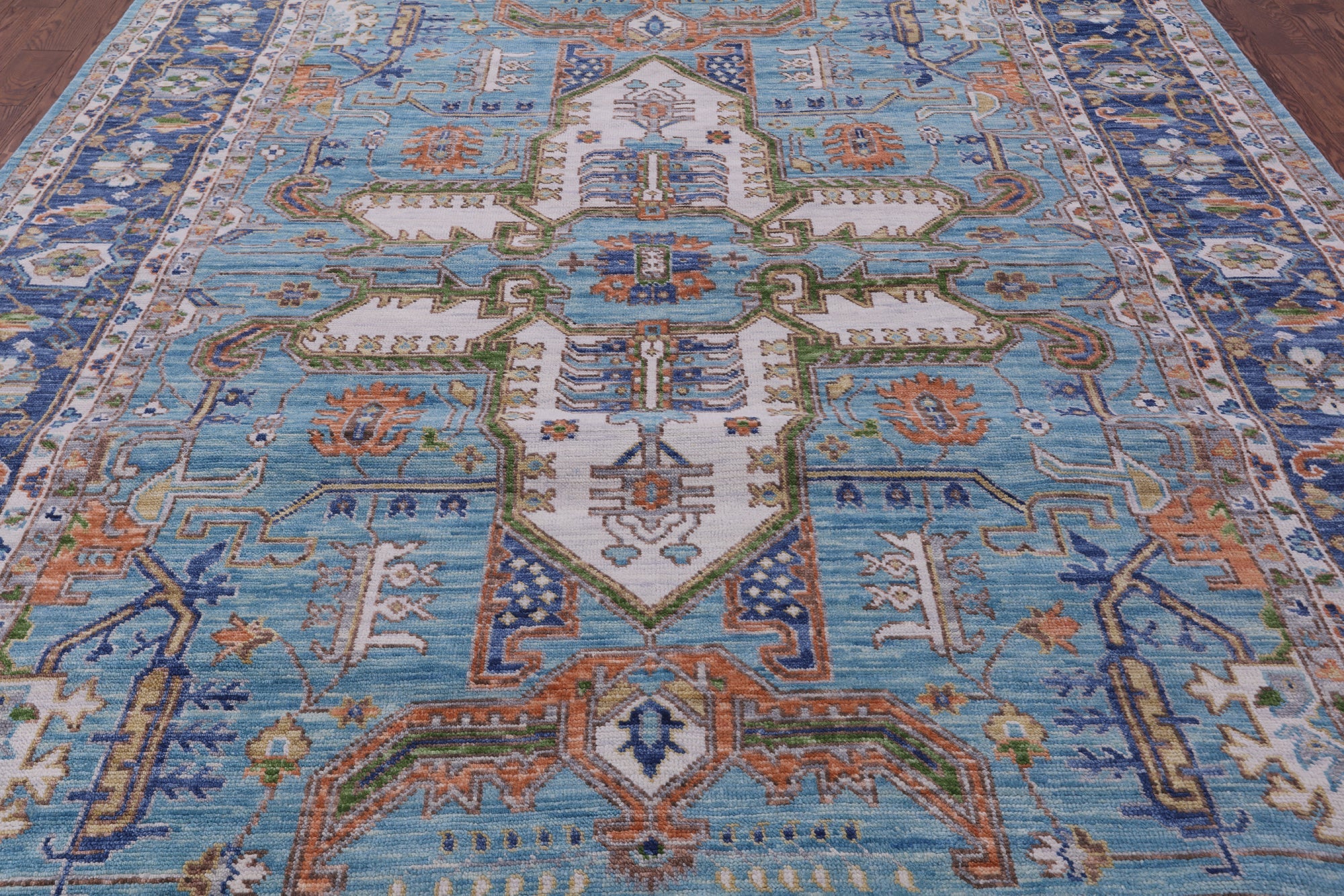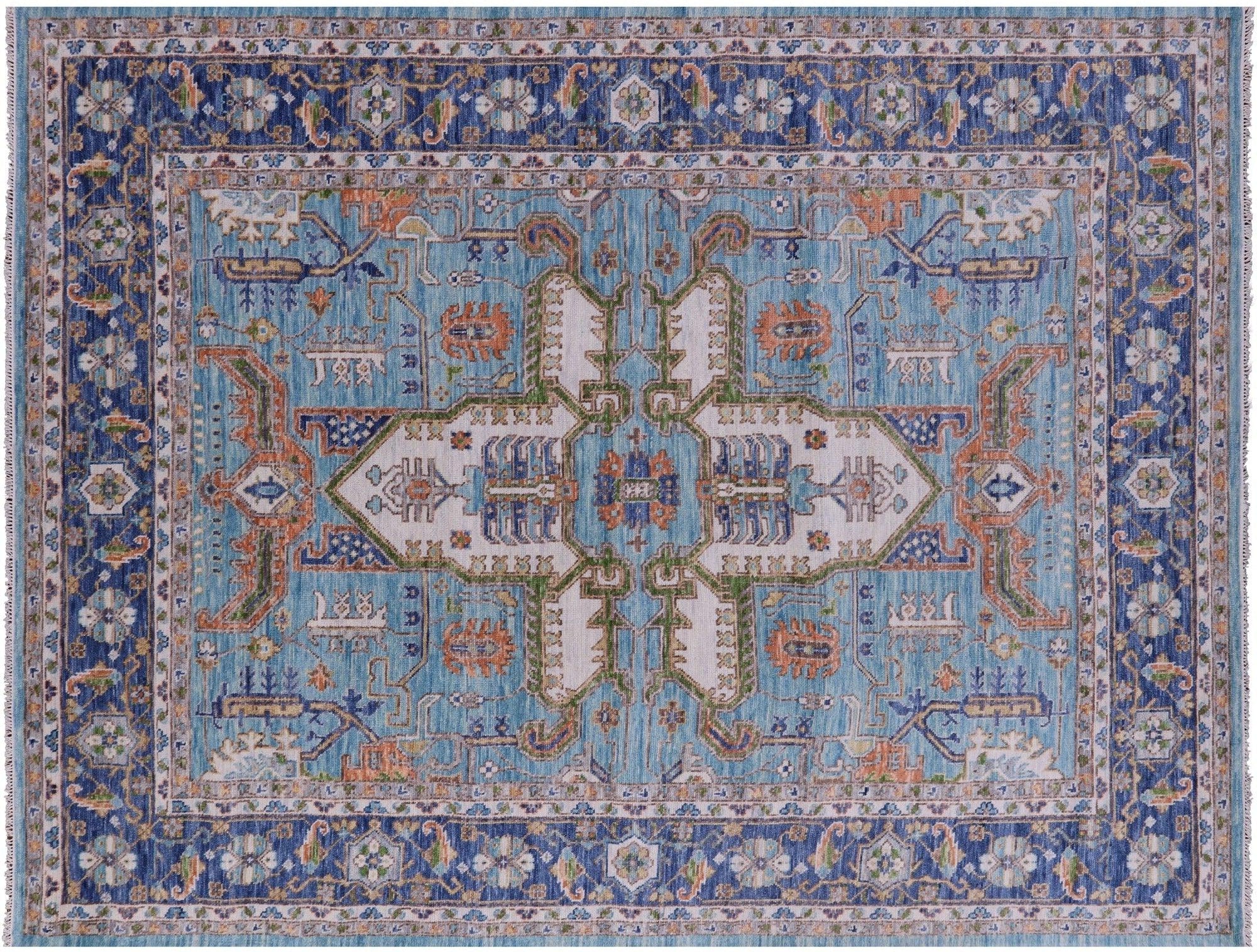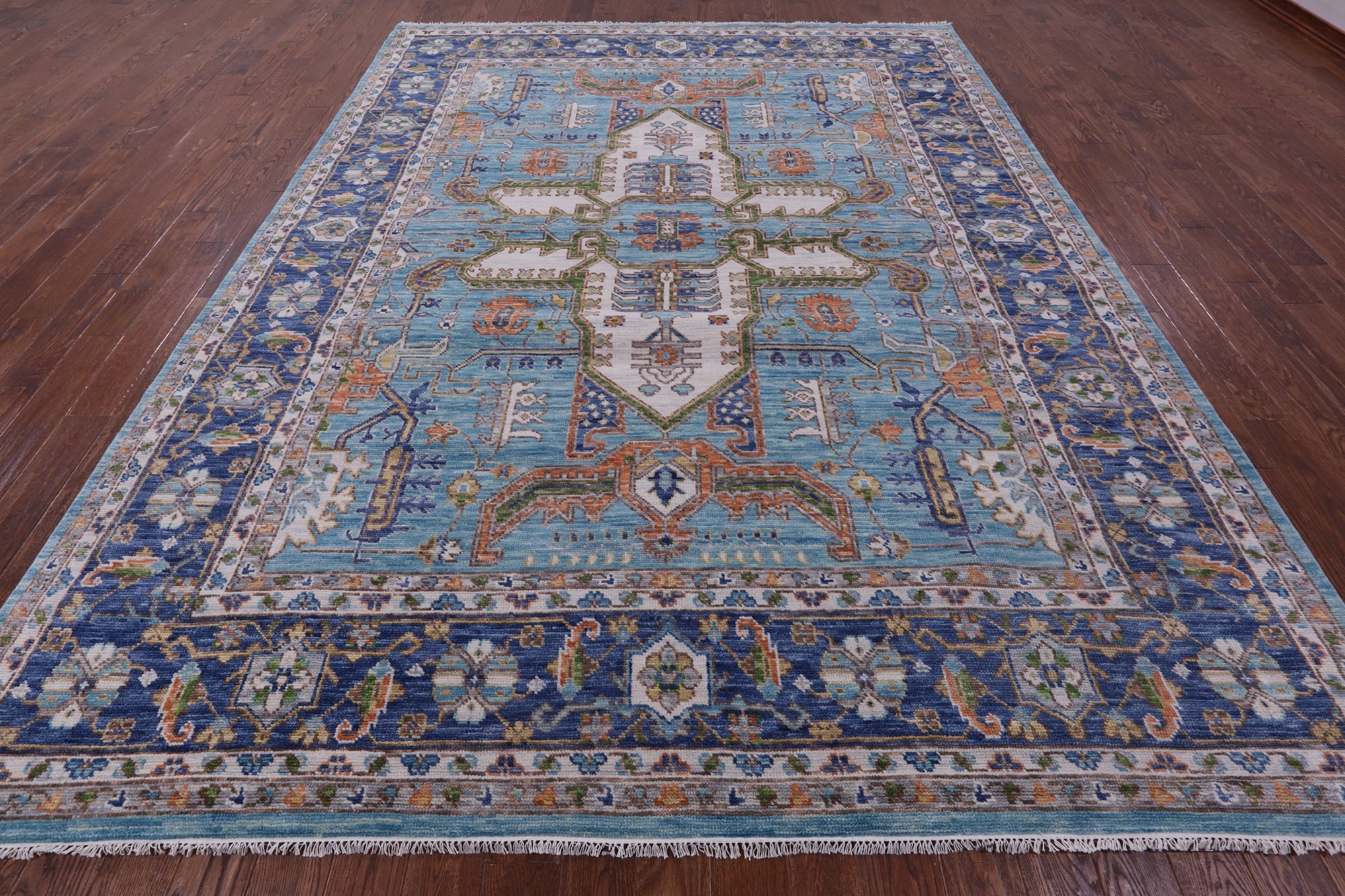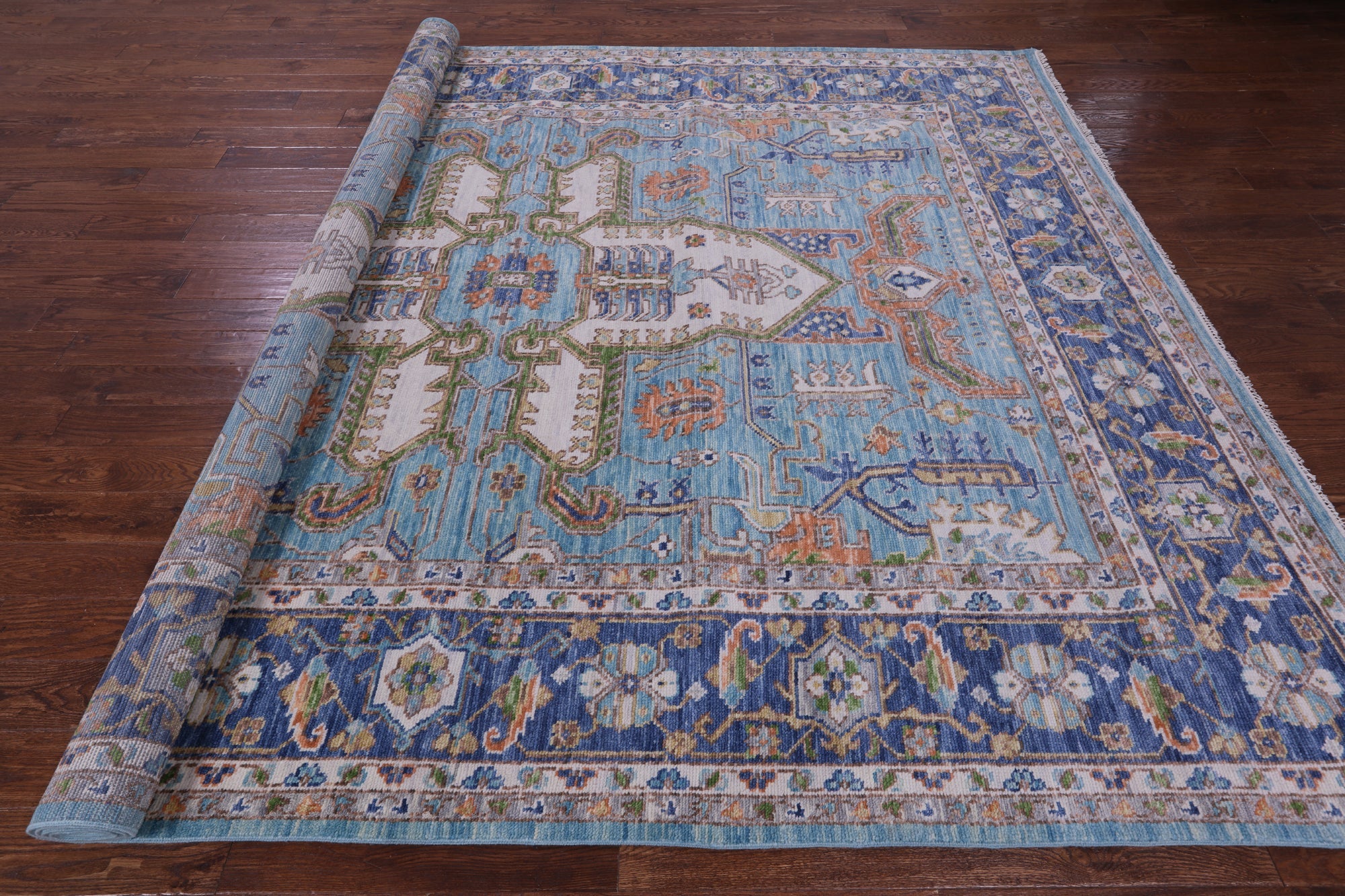 Heriz, Serapi rugs are well known for their bold and angular designs. Many being symmetric, they withhold boldly done geometric and floral-inspired shapes. These shapes are brought out with rich reds, blues, greens, and yellows contrasted against ivory. Heriz, Serapi rugs are very elegant and durable, perfect for a variety of different rooms and spaces within a home.