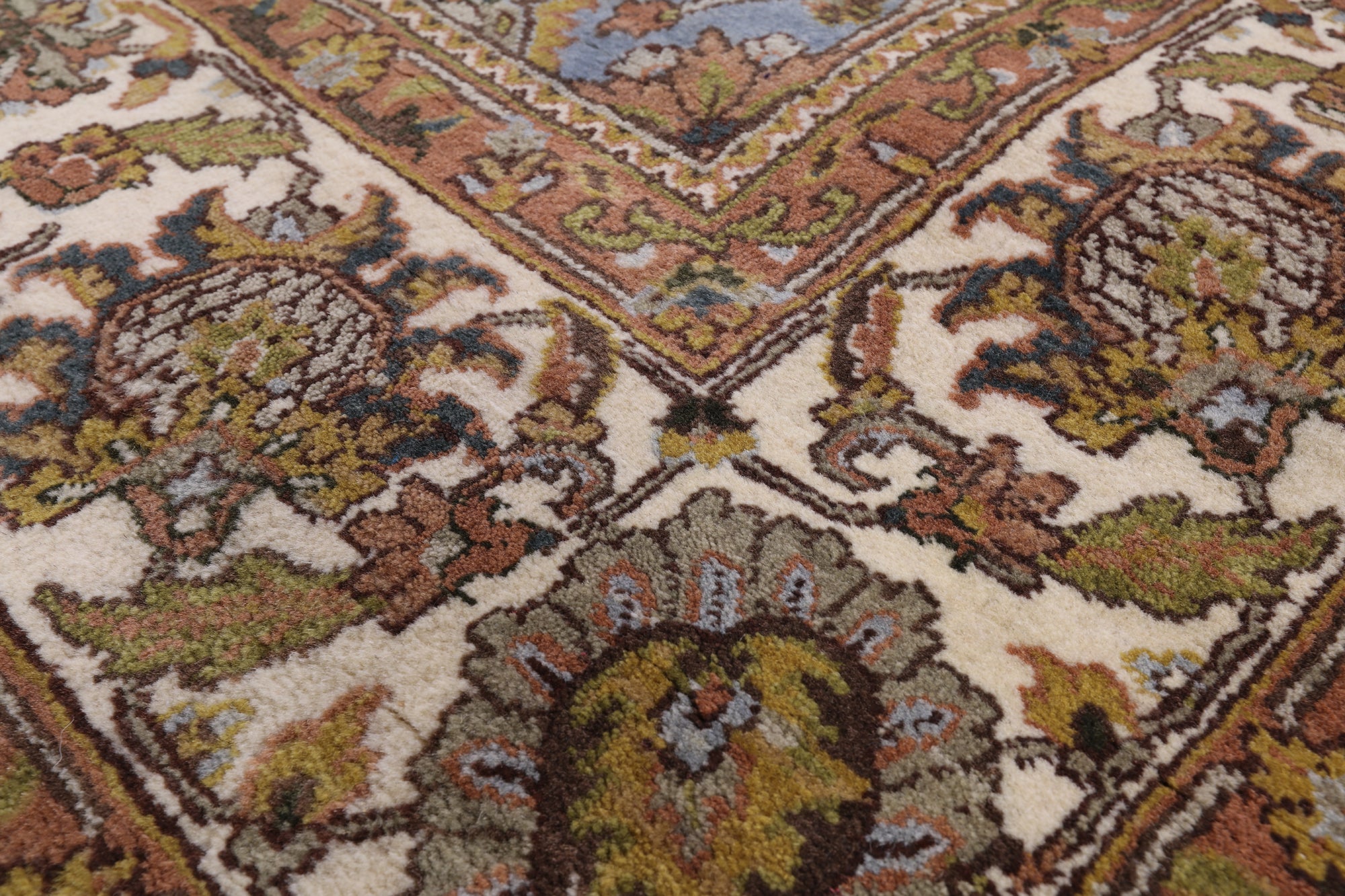Tabriz rugs have been in existence since the 9-10th century. For generations, Tabriz rugs have become known for their diverse designs, from medallion, Herati/Mahi, to figural, pictorial, and even 3-d shaped rugs. Antique Tabriz rugs, with picture images, are very desirable and are of high quality. Tabriz rugs come in different sizes, and many different colors, mostly blue, red, black and cream/ivory. Tabriz carpet represents various kinds of art such as ornamental patterns, scenes of falconry or images of a ferocious lion and images of fragments of palaces and mosques, scenes of battles.