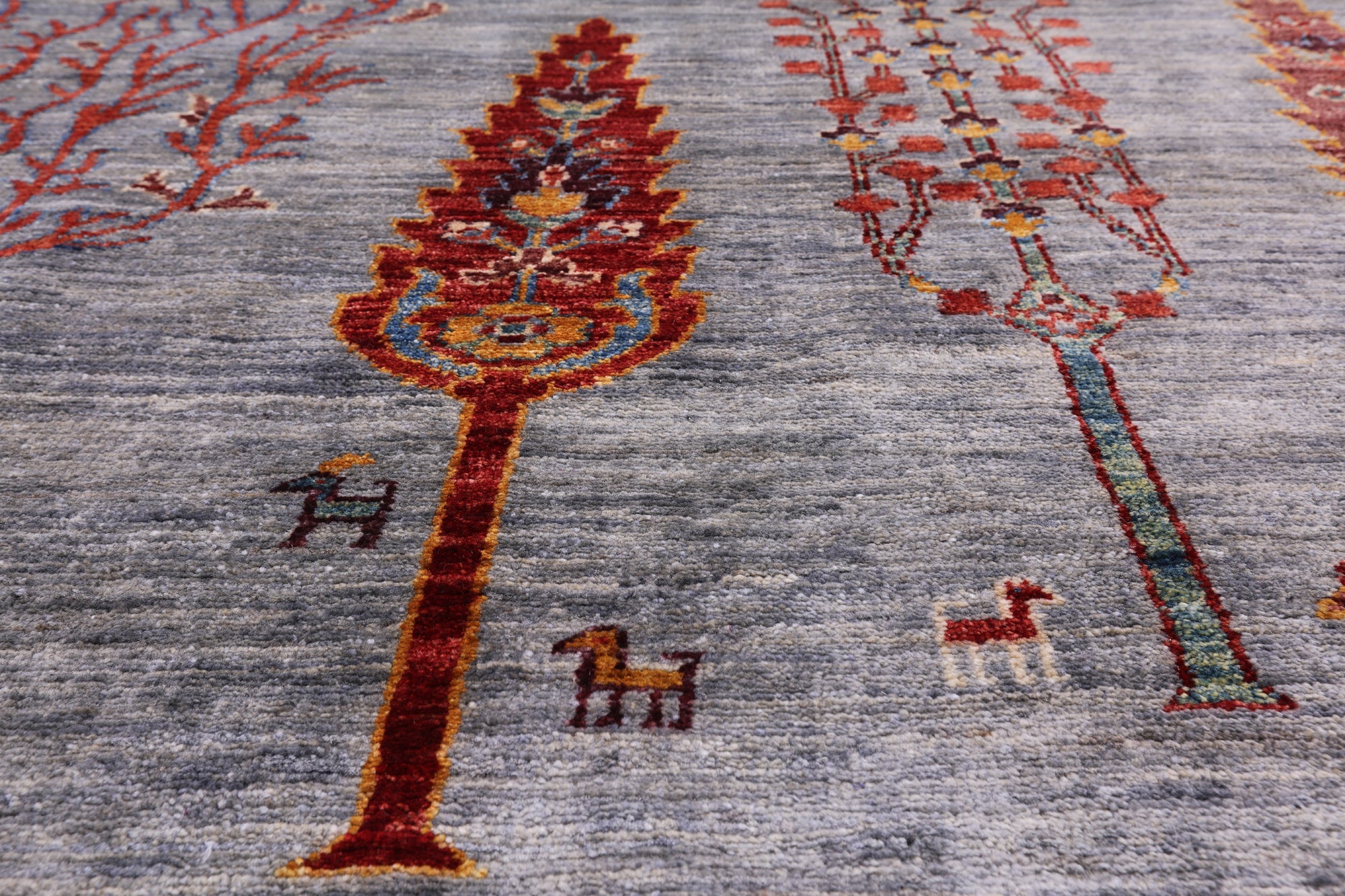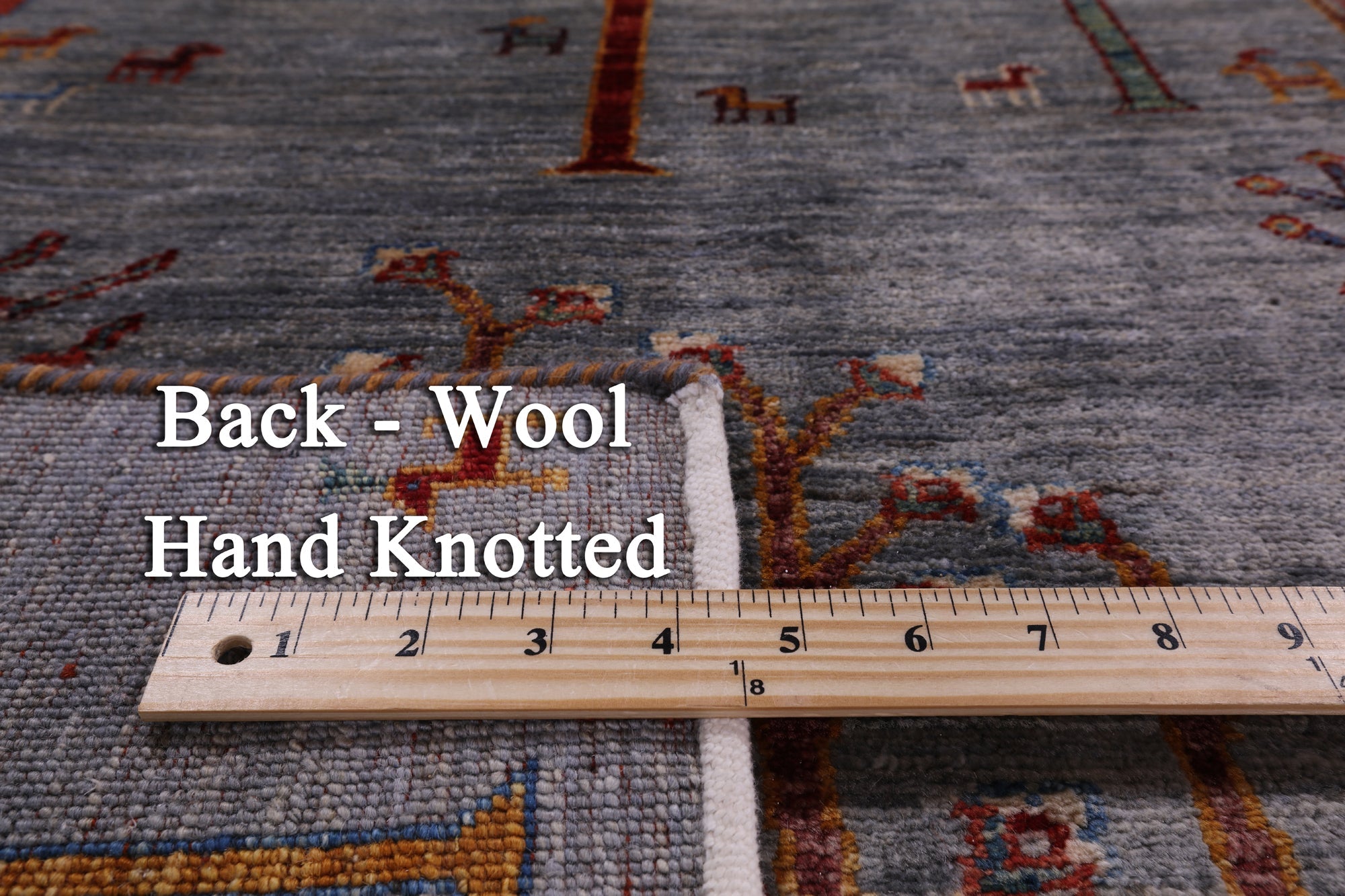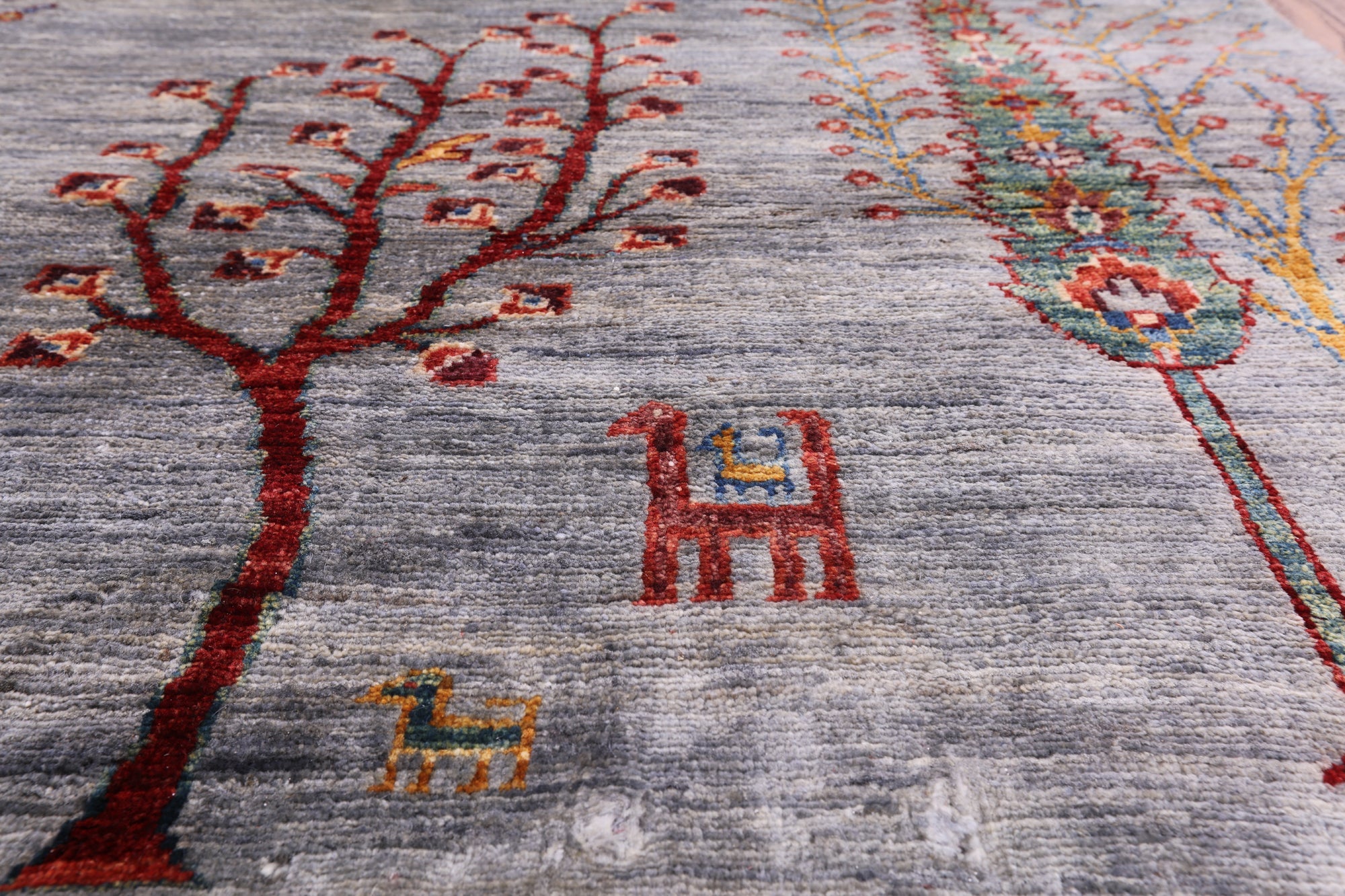 Gabbeh rugs are hand-spun wool in both the pile and the foundation, as well as all natural dyes. Simple, colorful geometric patterns, abstract scenery, child-like representations of people and animals, different colors, reds, blue, greens ,yellow, purple. Modern technology has improved the dye process to allow a wider range of colors as well as more stable and easier to care for colors.