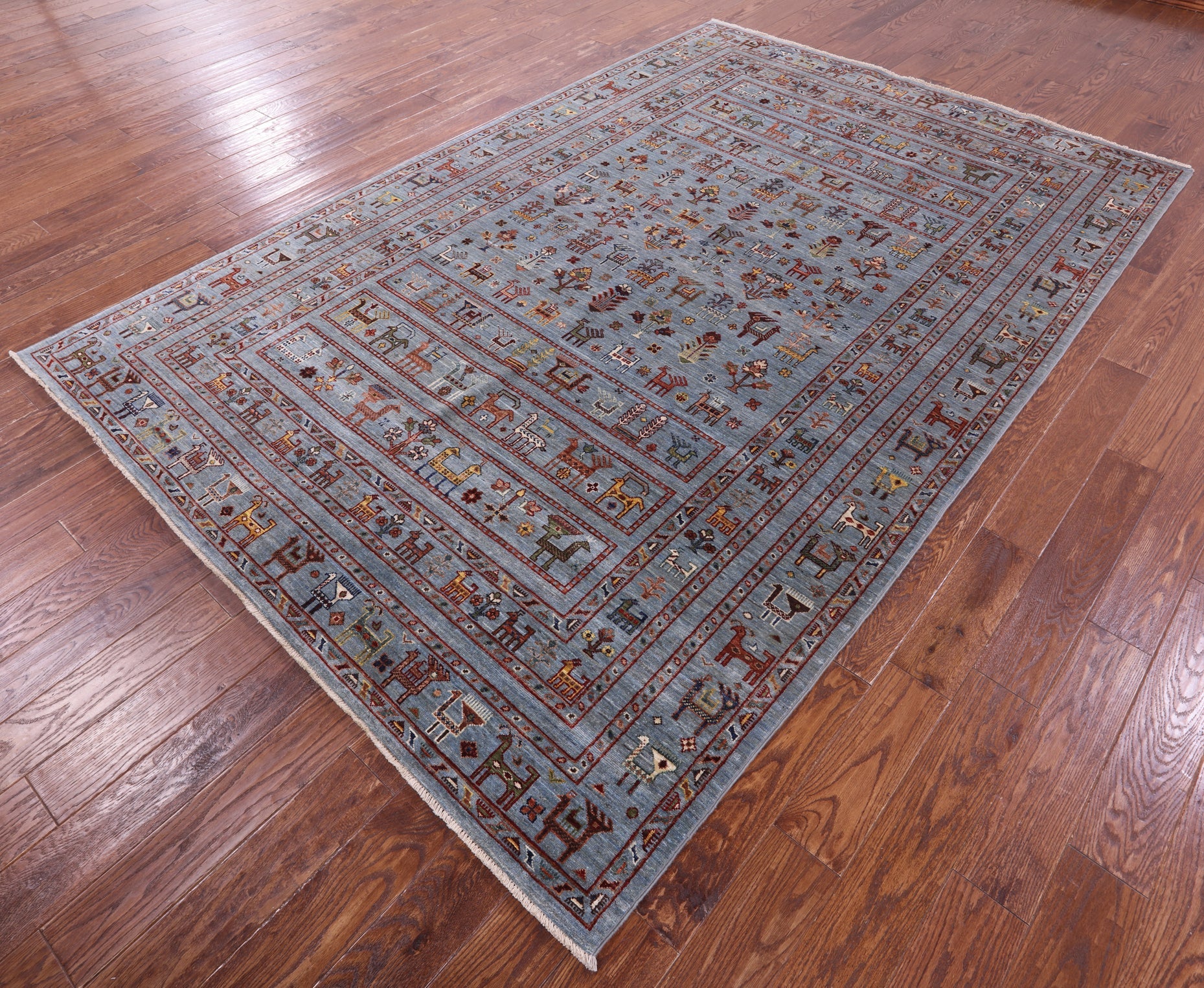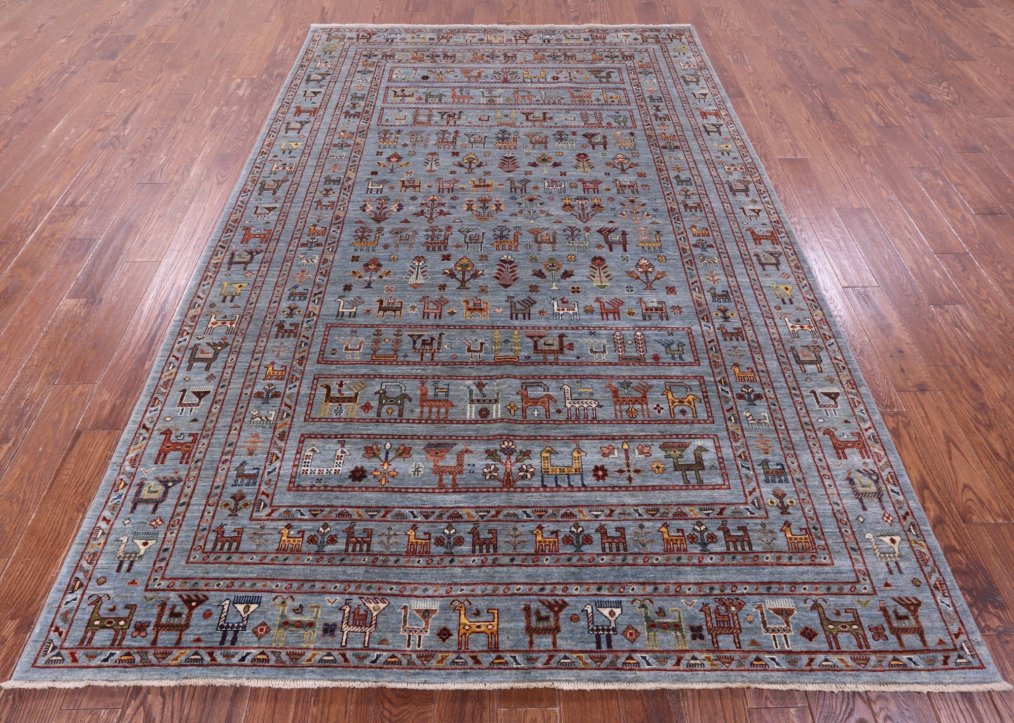 Gabbeh rugs are nothing short of simplistic and tribal, with designs consisting of primarily geometric shapes, animals, and plants. All done in a simplified way and based on the nomadic observation. Commonly brightly colored, these rugs are fun and beautiful and will add a warm touch to any home.