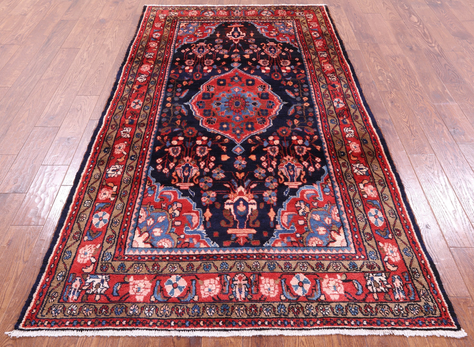 Nahavand rugs comes from the city of Nahavand in Persia. These rugs have a tribal style look, often using floral medallions and a variety of vegetable dyed colors such as reds, blues, greens and different shades of ivory. Nahavand rugs are made with very high quality wool, which gives it a shine. They are very durable rugs that will last a lifetime.