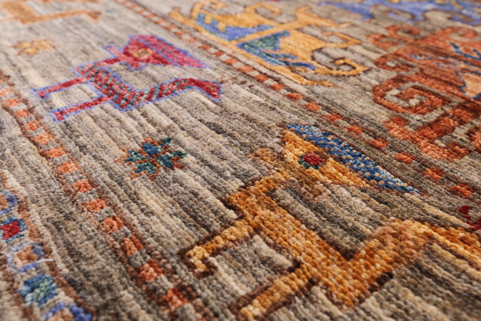 Gabbeh rugs are hand-spun wool in both the pile and the foundation, as well as all natural dyes. Simple, colorful geometric patterns, abstract scenery, child-like representations of people and animals, different colors, reds, blue, greens ,yellow, purple. Modern technology has improved the dye process to allow a wider range of colors as well as more stable and easier to care for colors.