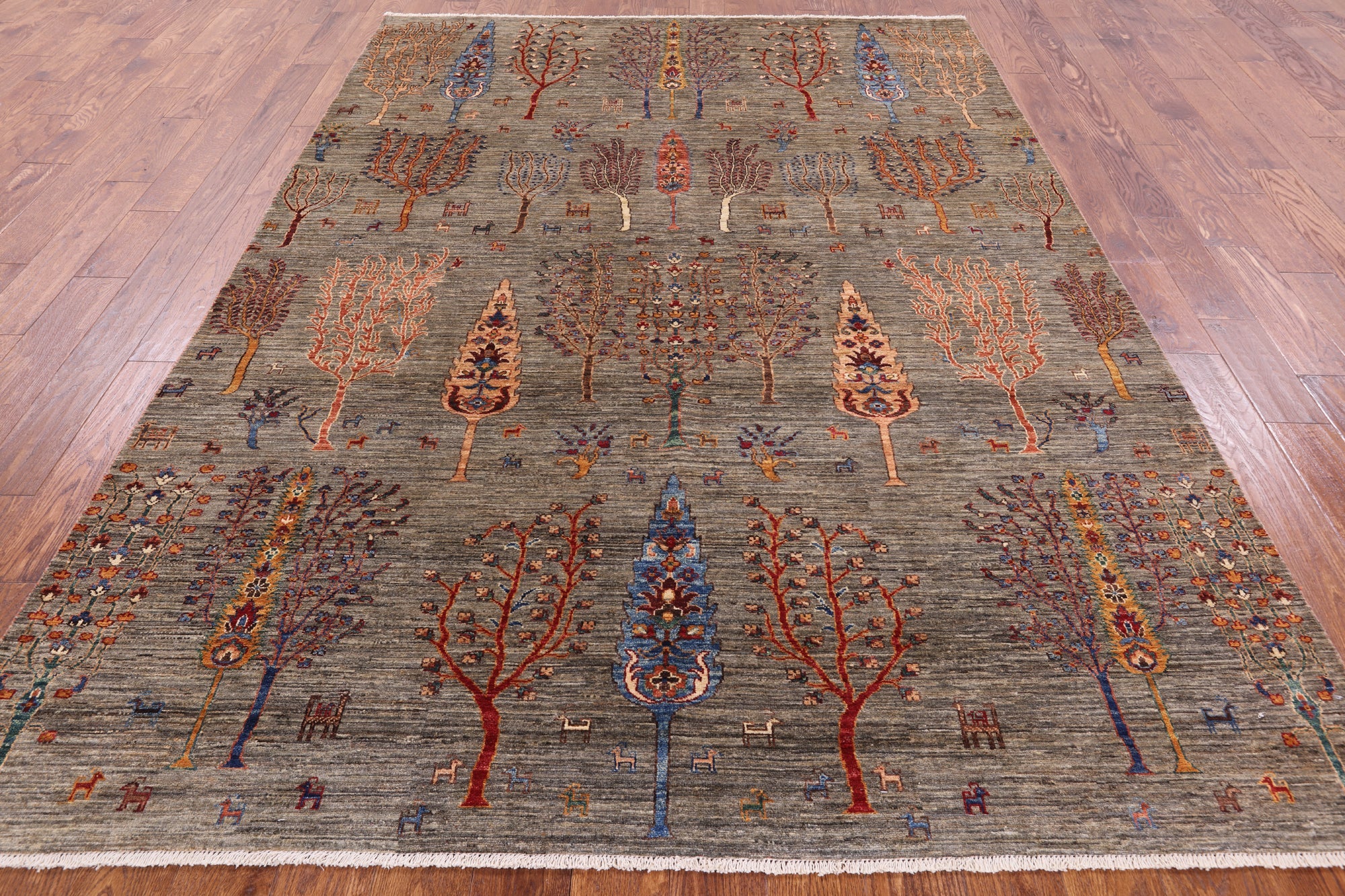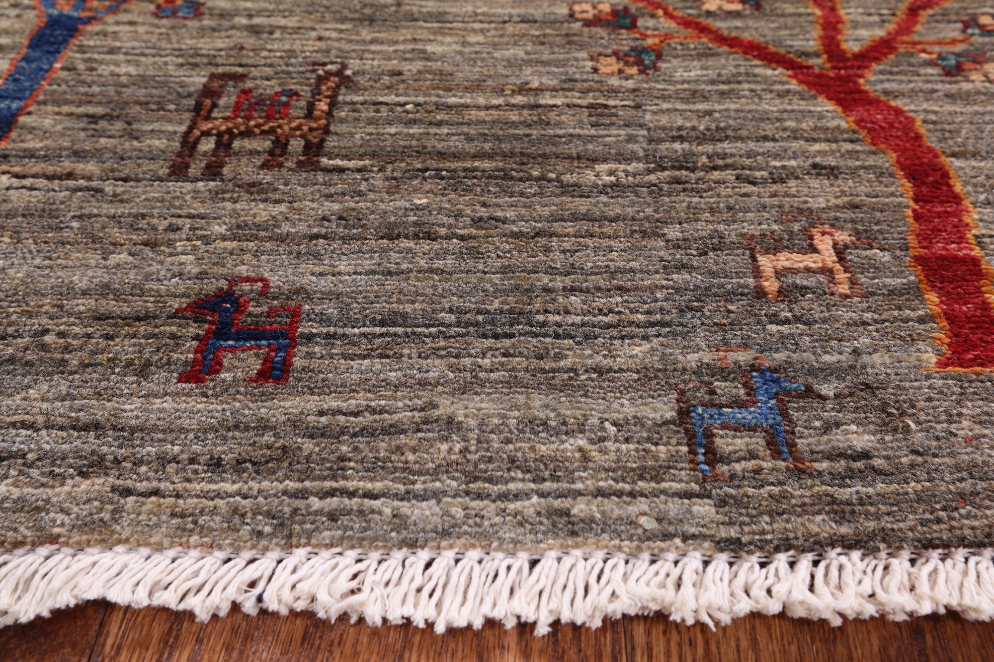 Gabbeh rugs are hand-spun wool in both the pile and the foundation, as well as all natural dyes. Simple, colorful geometric patterns, abstract scenery, child-like representations of people and animals, different colors, reds, blue, greens ,yellow, purple. Modern technology has improved the dye process to allow a wider range of colors as well as more stable and easier to care for colors.