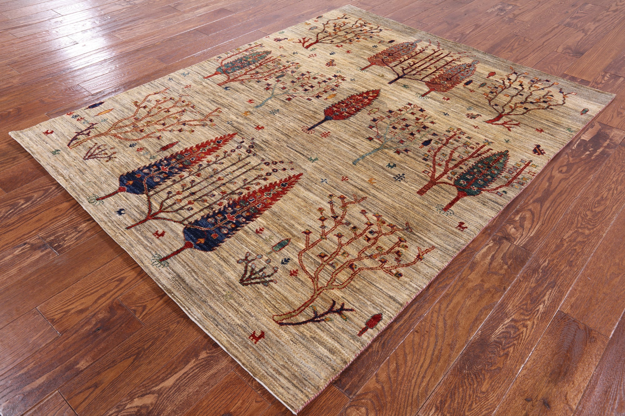 Gabbeh rugs are hand-spun wool in both the pile and the foundation, as well as all natural dyes. Simple, colorful geometric patterns, abstract scenery, child-like representations of people and animals, different colors, reds, blue, greens ,yellow, purple. Modern technology has improved the dye process to allow a wider range of colors as well as more stable and easier to care for colors.