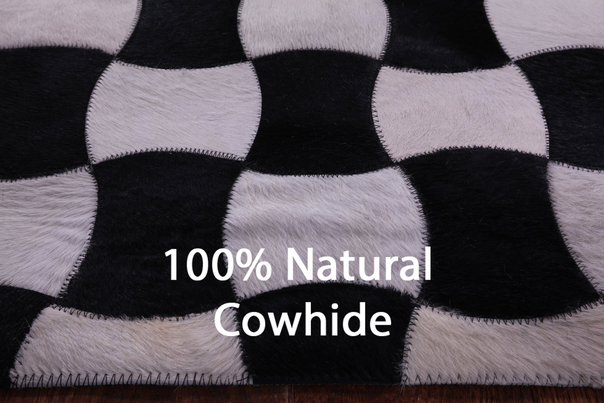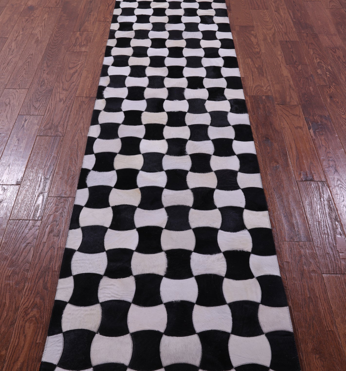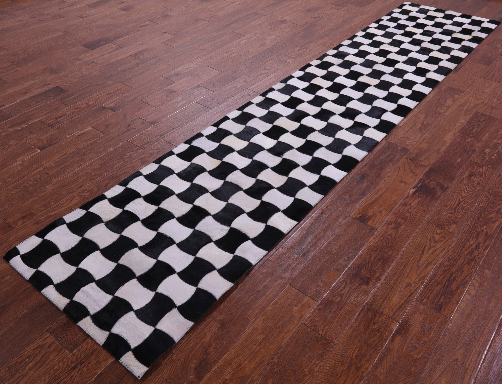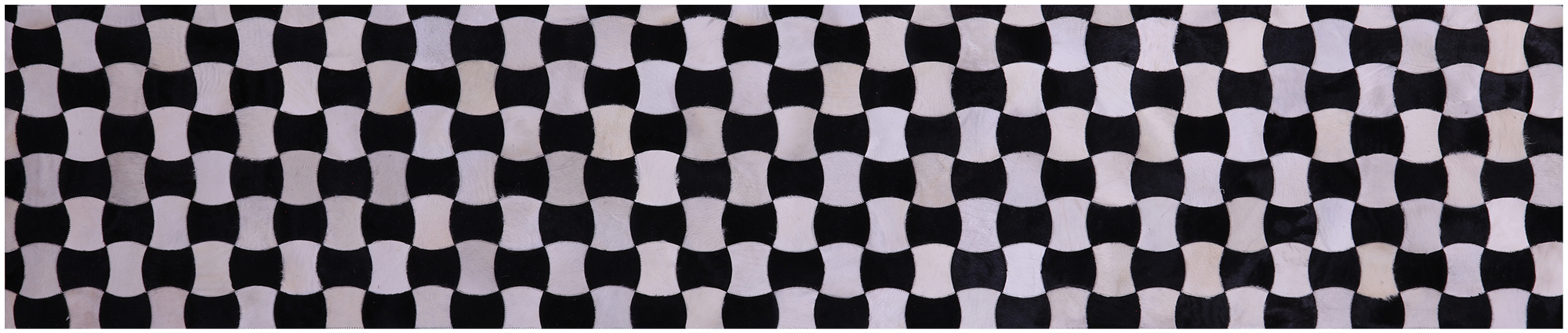 2' 6" X 12' 0" Black & White Natural Cowhide Hand Stitched Runner Rug - C5813 is backordered and will ship as soon as it is back in stock.