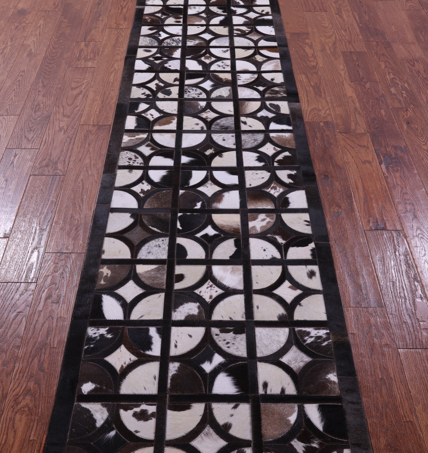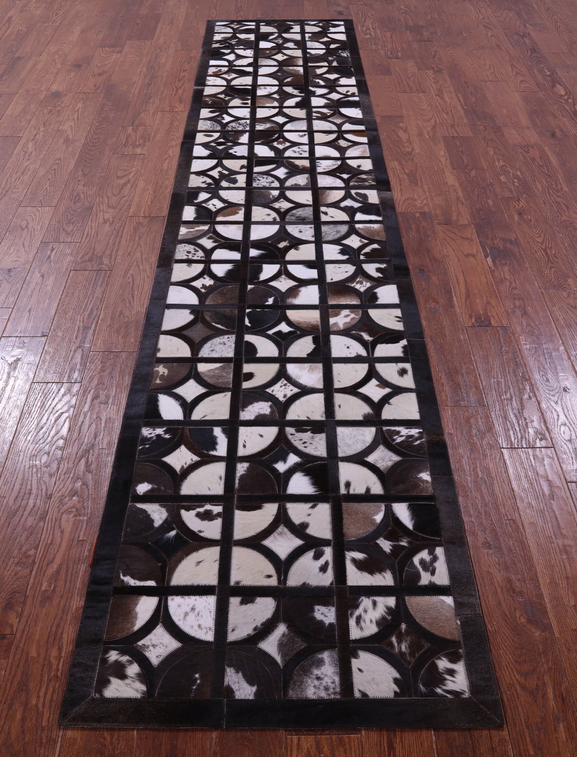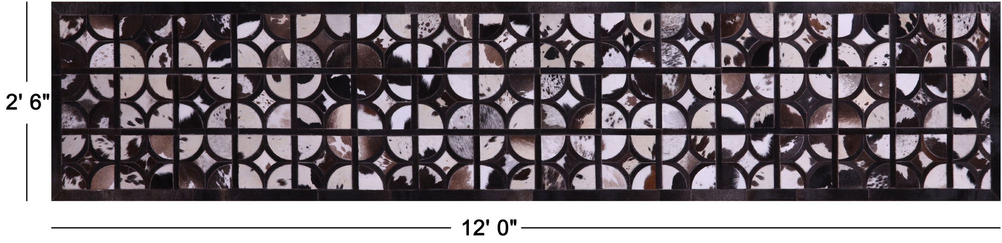 2' 6" X 12' 0" Brown & White Natural Cowhide Hand Stitched Runner Rug - C5817 is backordered and will ship as soon as it is back in stock.