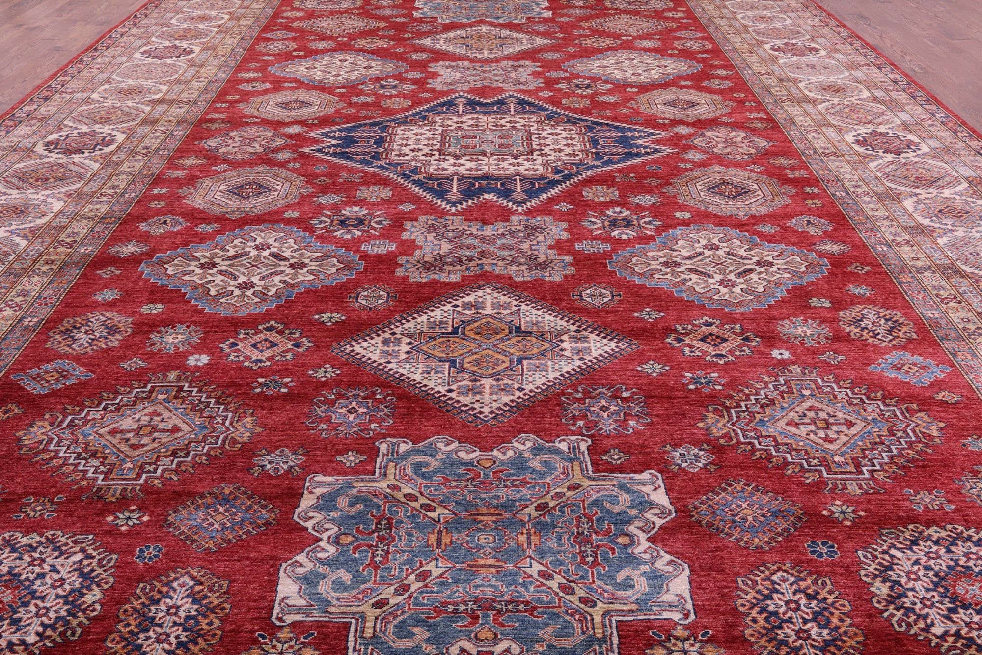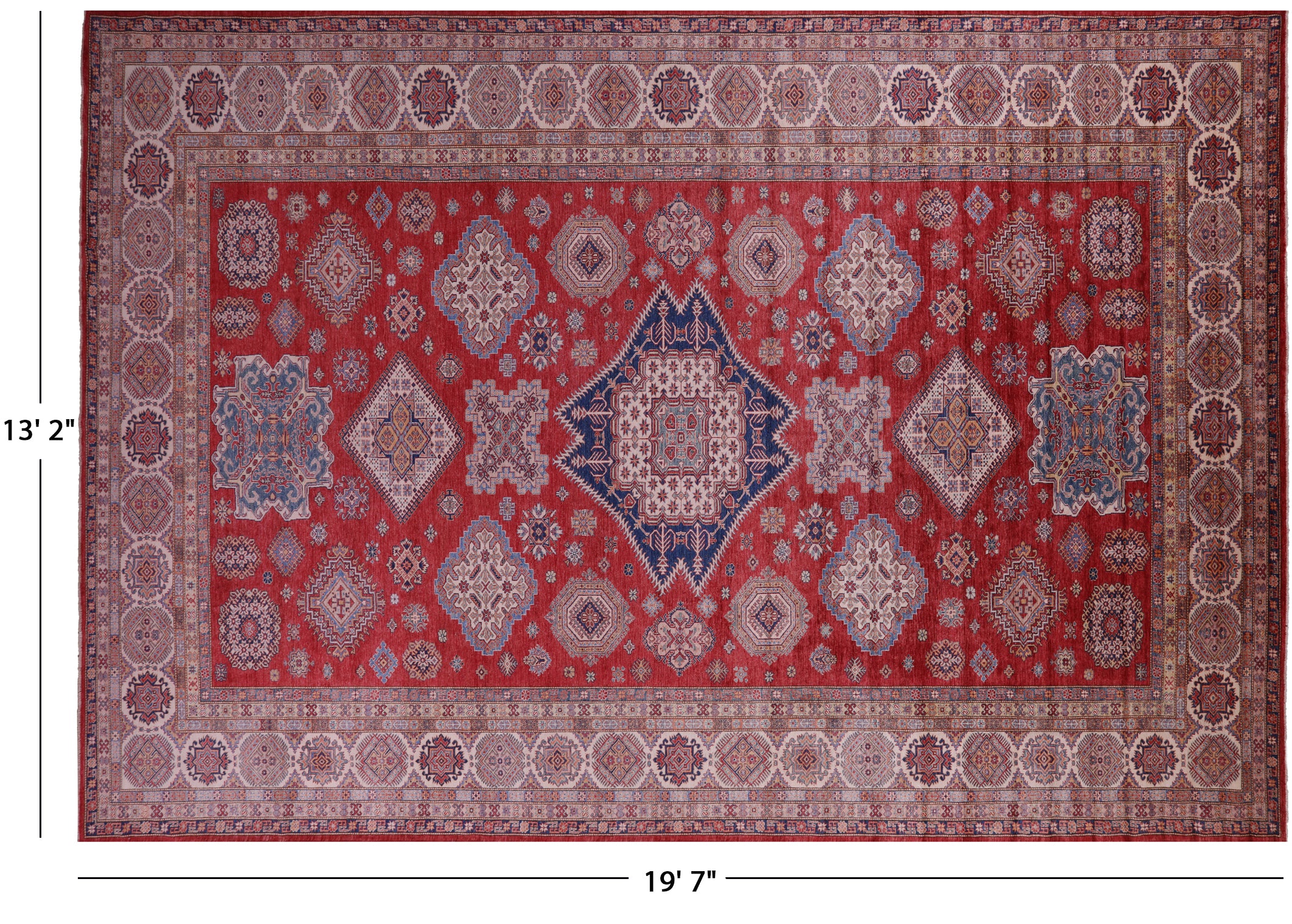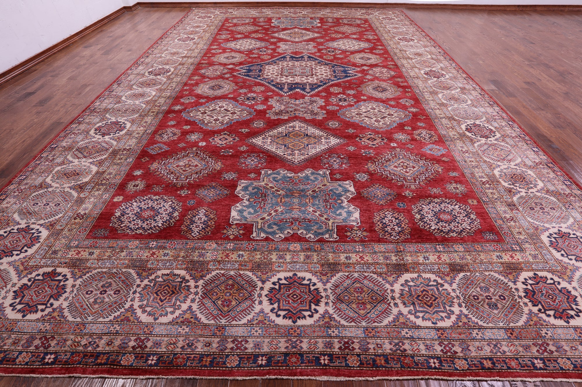 Red 13' 2" X 19' 7" Super Kazak Hand-Knotted Wool Rug - Q18397 is backordered and will ship as soon as it is back in stock.