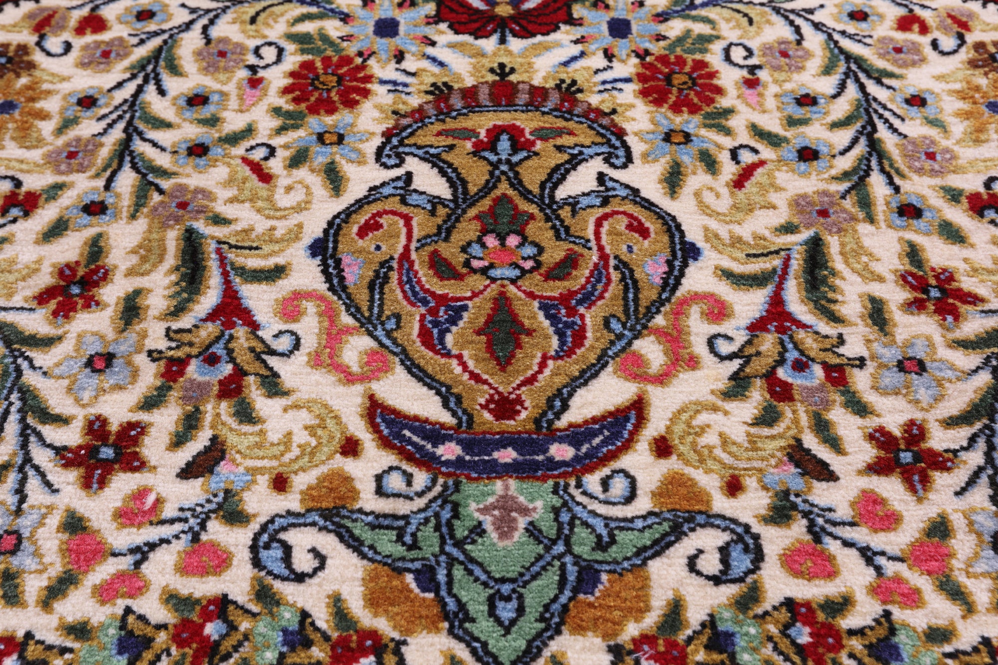 Qum rugs are known for their fine craftsmanship, intricate patterns, and exceptional detail. Typically woven with high-quality wool, these rugs often feature graceful floral or medallion designs in shades of red, blue, ivory, and other soft tones. Their refined look and precise weaving make them a popular choice for adding elegance and character to any space.