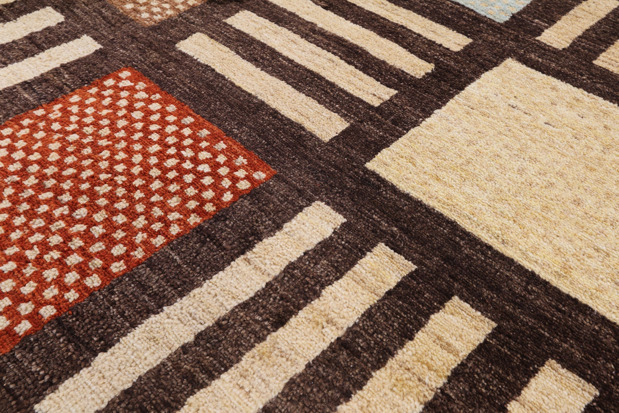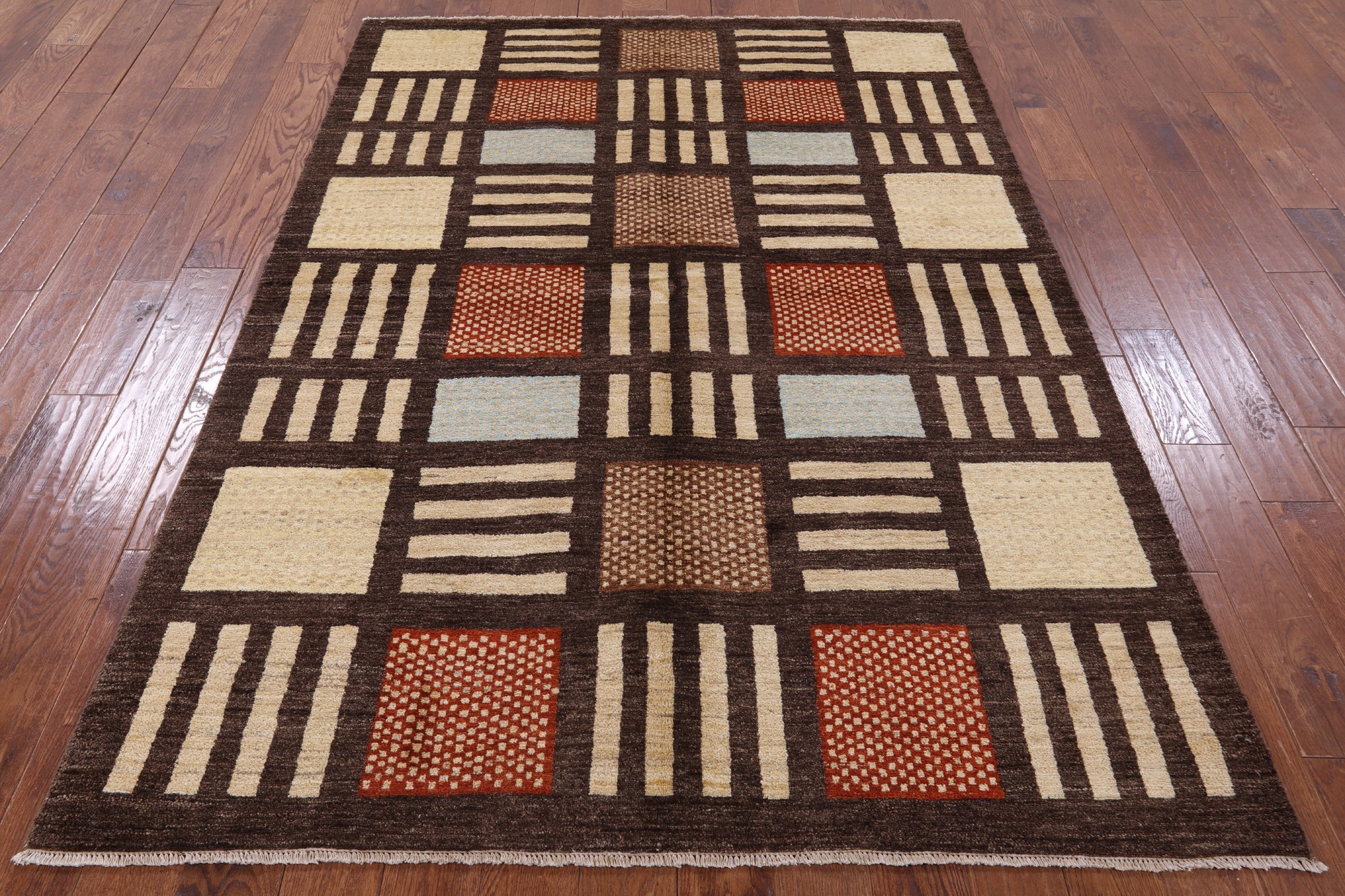 Gabbeh rugs are hand-spun wool in both the pile and the foundation, as well as all natural dyes. Simple, colorful geometric patterns, abstract scenery, child-like representations of people and animals, different colors, reds, blue, greens ,yellow, purple. Modern technology has improved the dye process to allow a wider range of colors as well as more stable and easier to care for colors.
