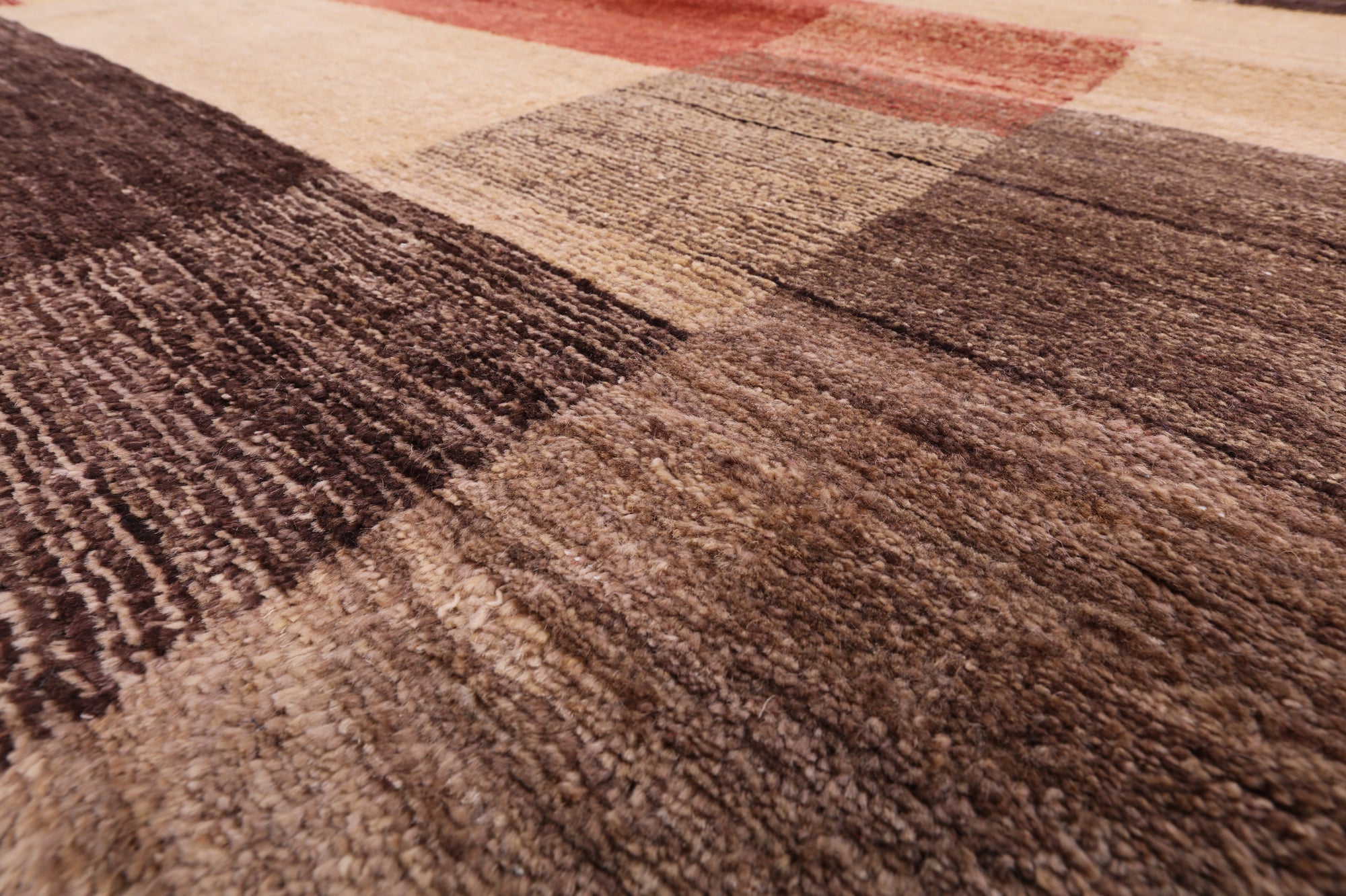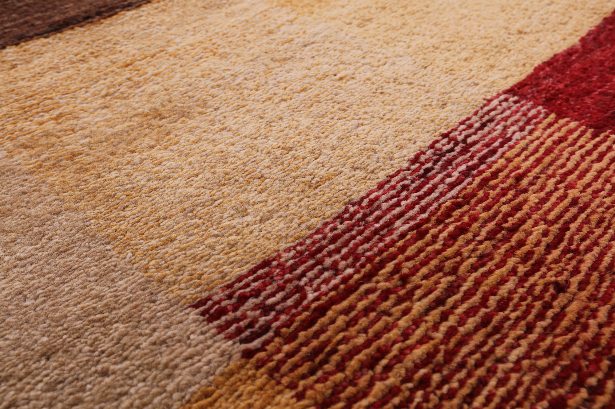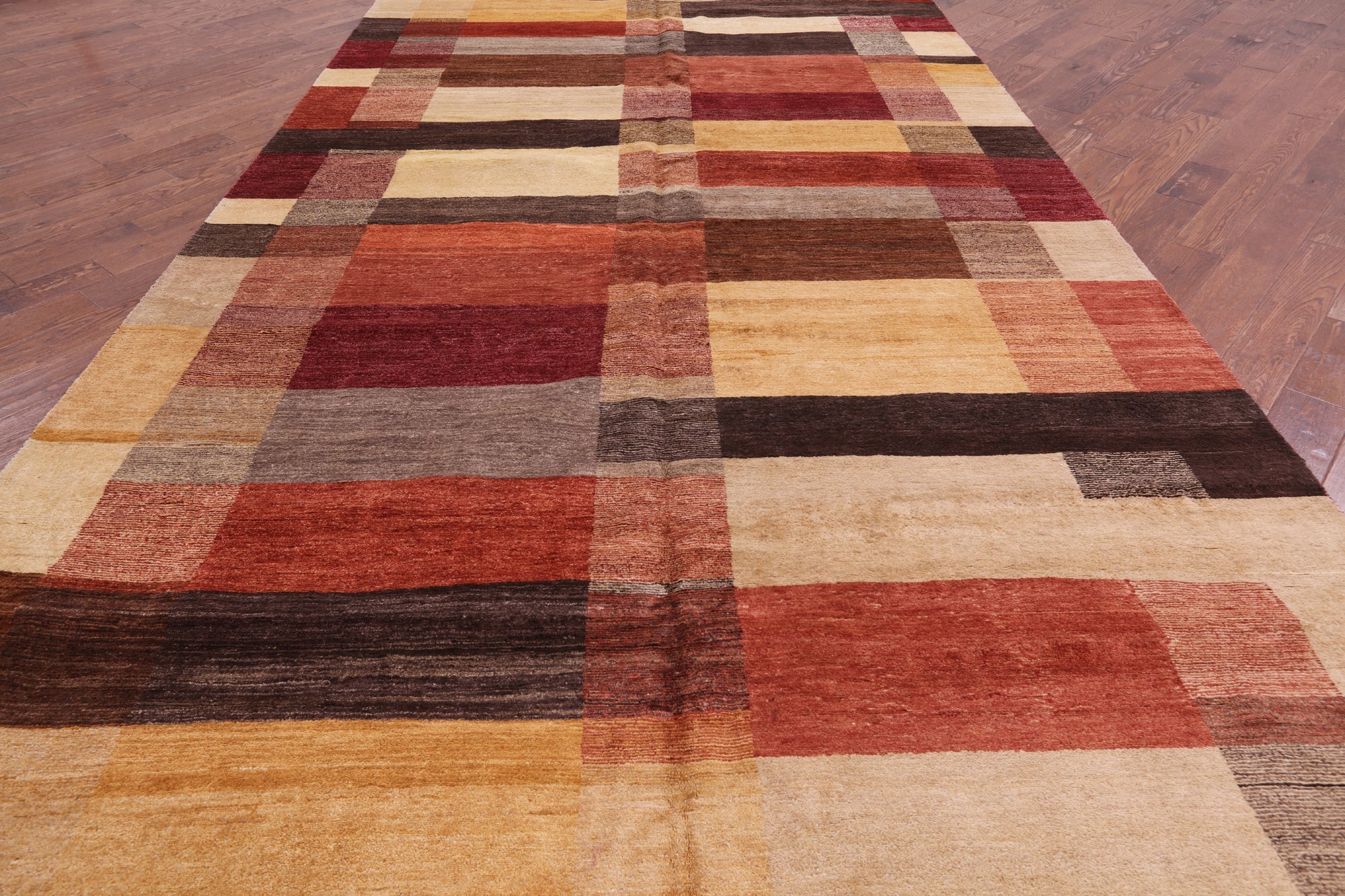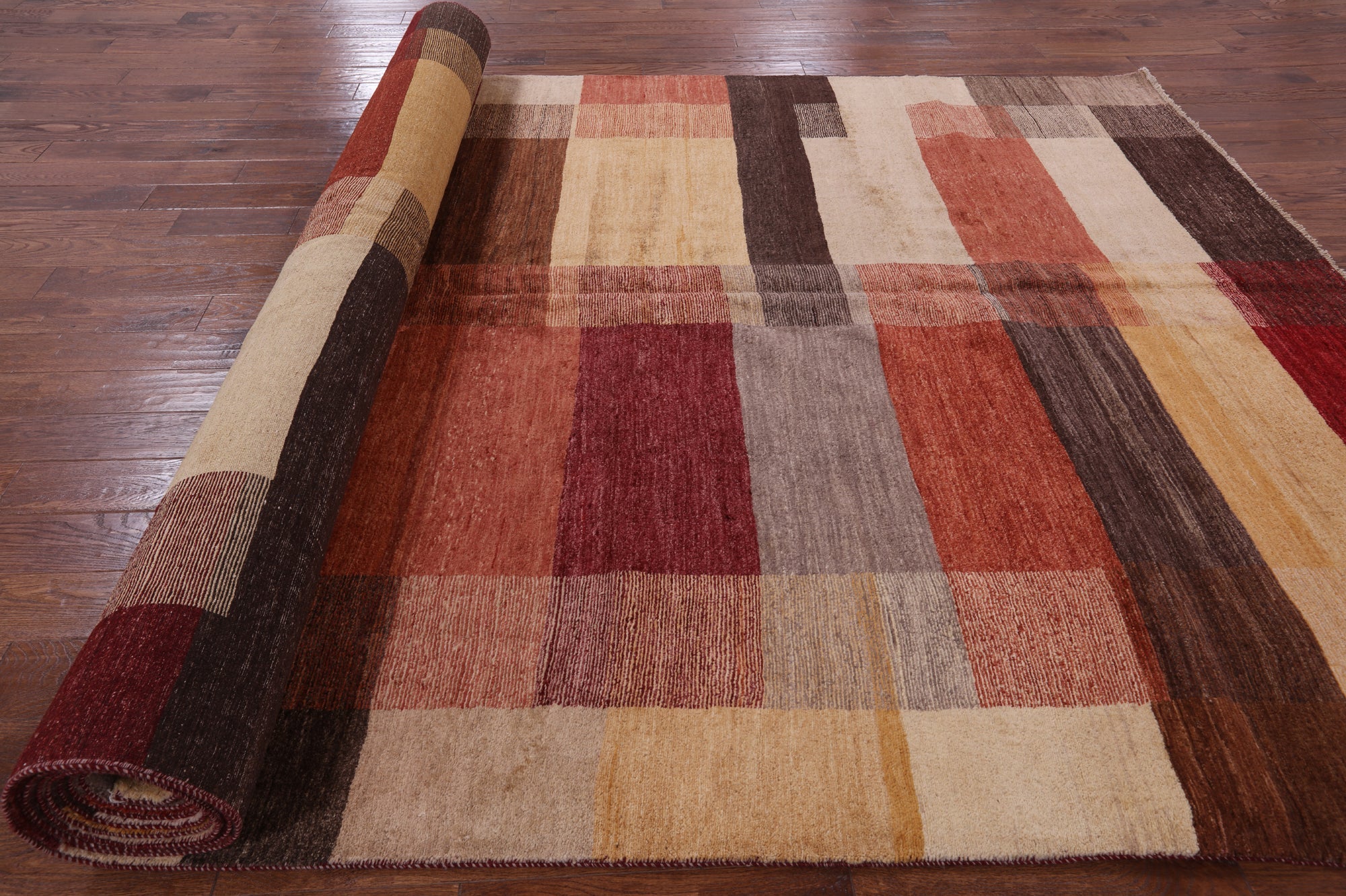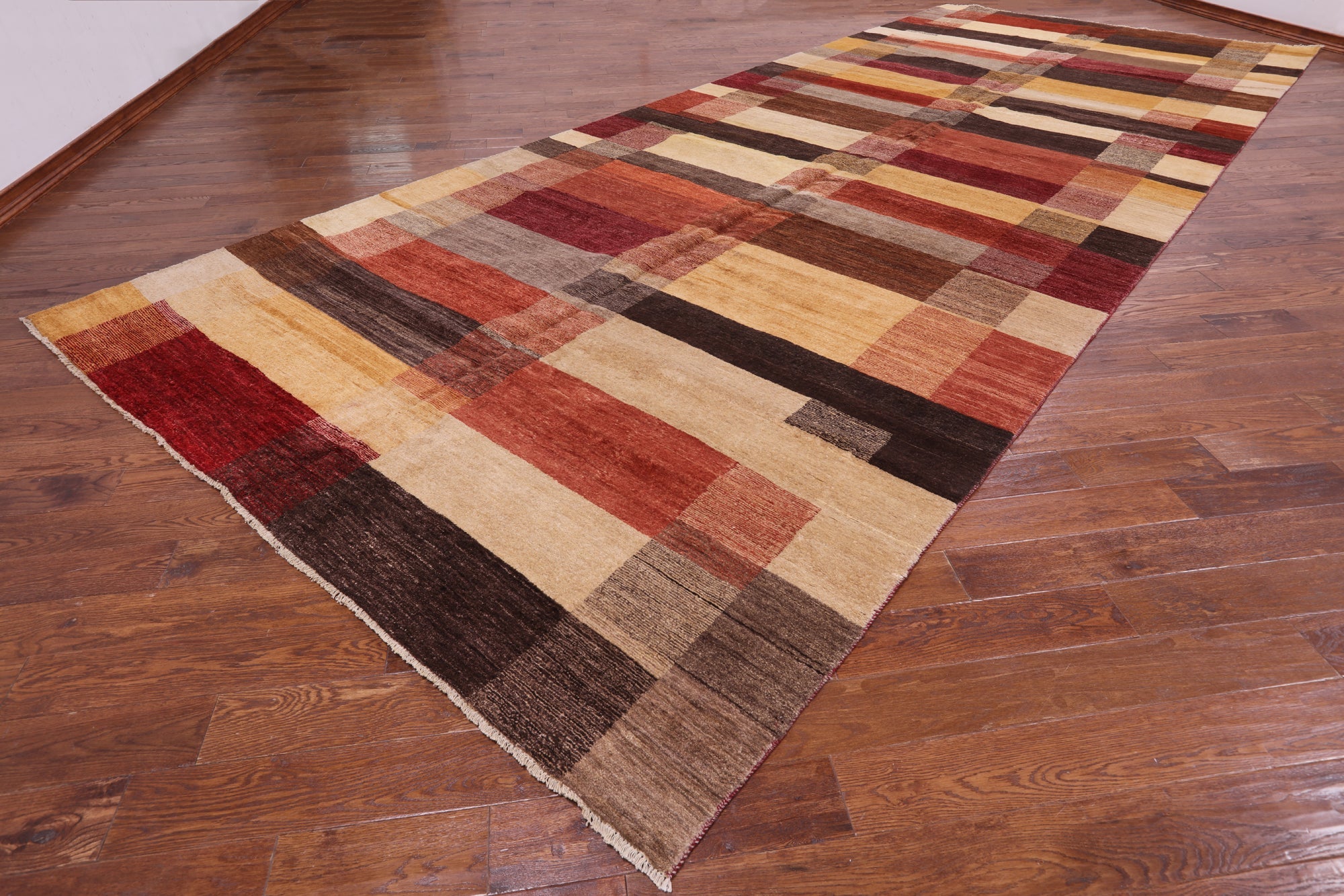 Gabbeh rugs are hand-spun wool in both the pile and the foundation, as well as all natural dyes. Simple, colorful geometric patterns, abstract scenery, child-like representations of people and animals, different colors, reds, blue, greens ,yellow, purple. Modern technology has improved the dye process to allow a wider range of colors as well as more stable and easier to care for colors.