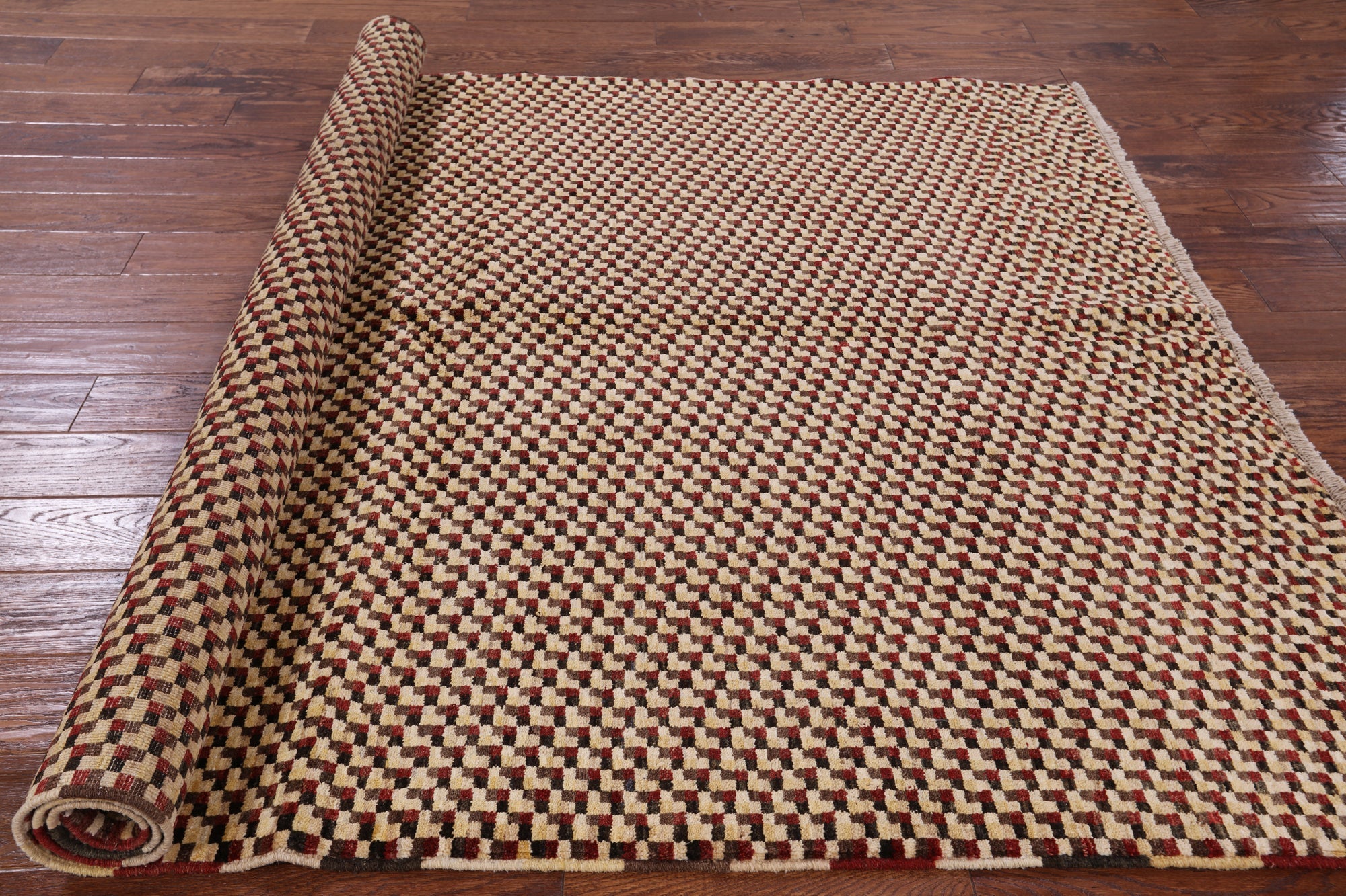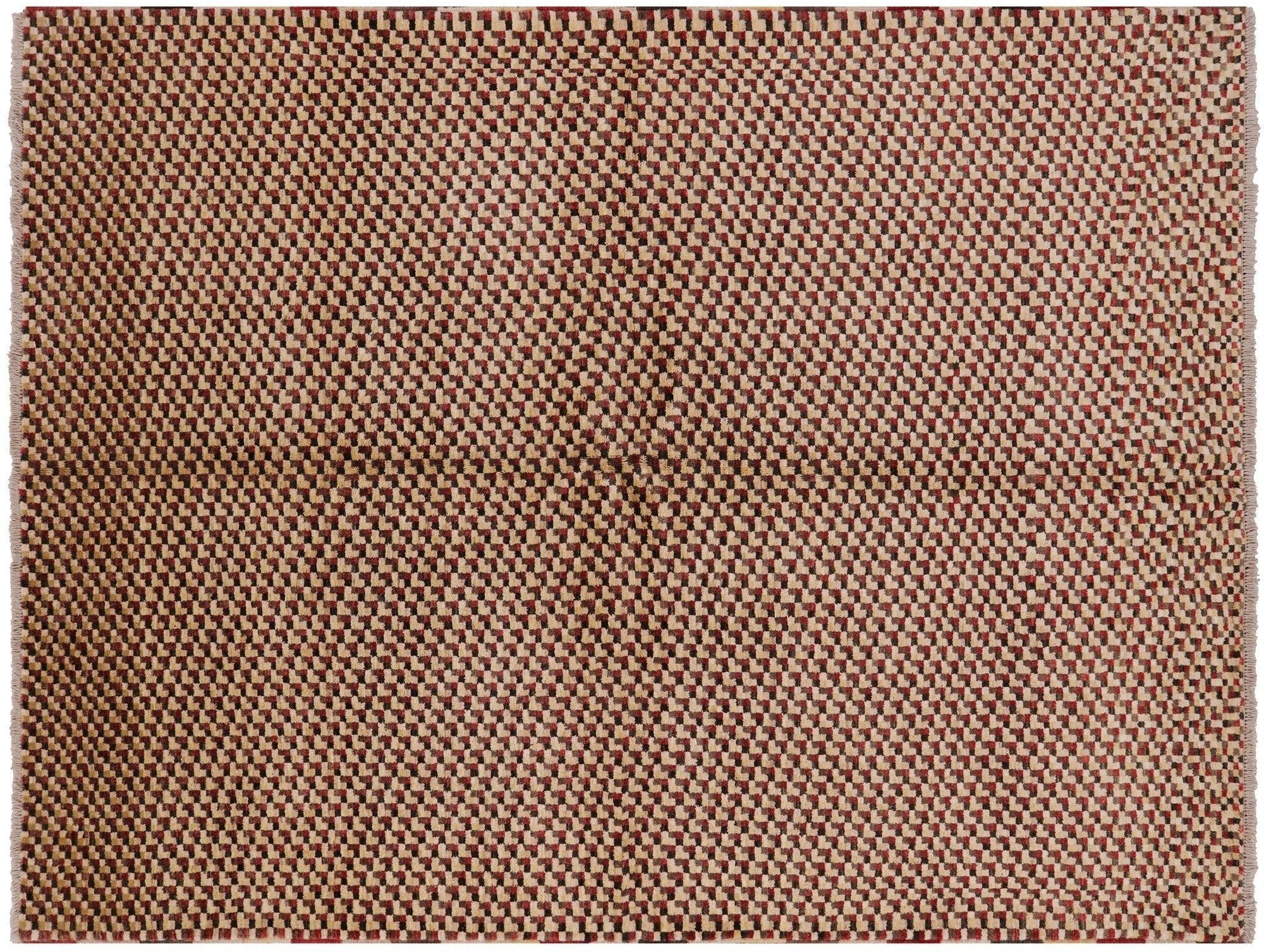 Gabbeh rugs are hand-spun wool in both the pile and the foundation, as well as all natural dyes. Simple, colorful geometric patterns, abstract scenery, child-like representations of people and animals, different colors, reds, blue, greens ,yellow, purple. Modern technology has improved the dye process to allow a wider range of colors as well as more stable and easier to care for colors.