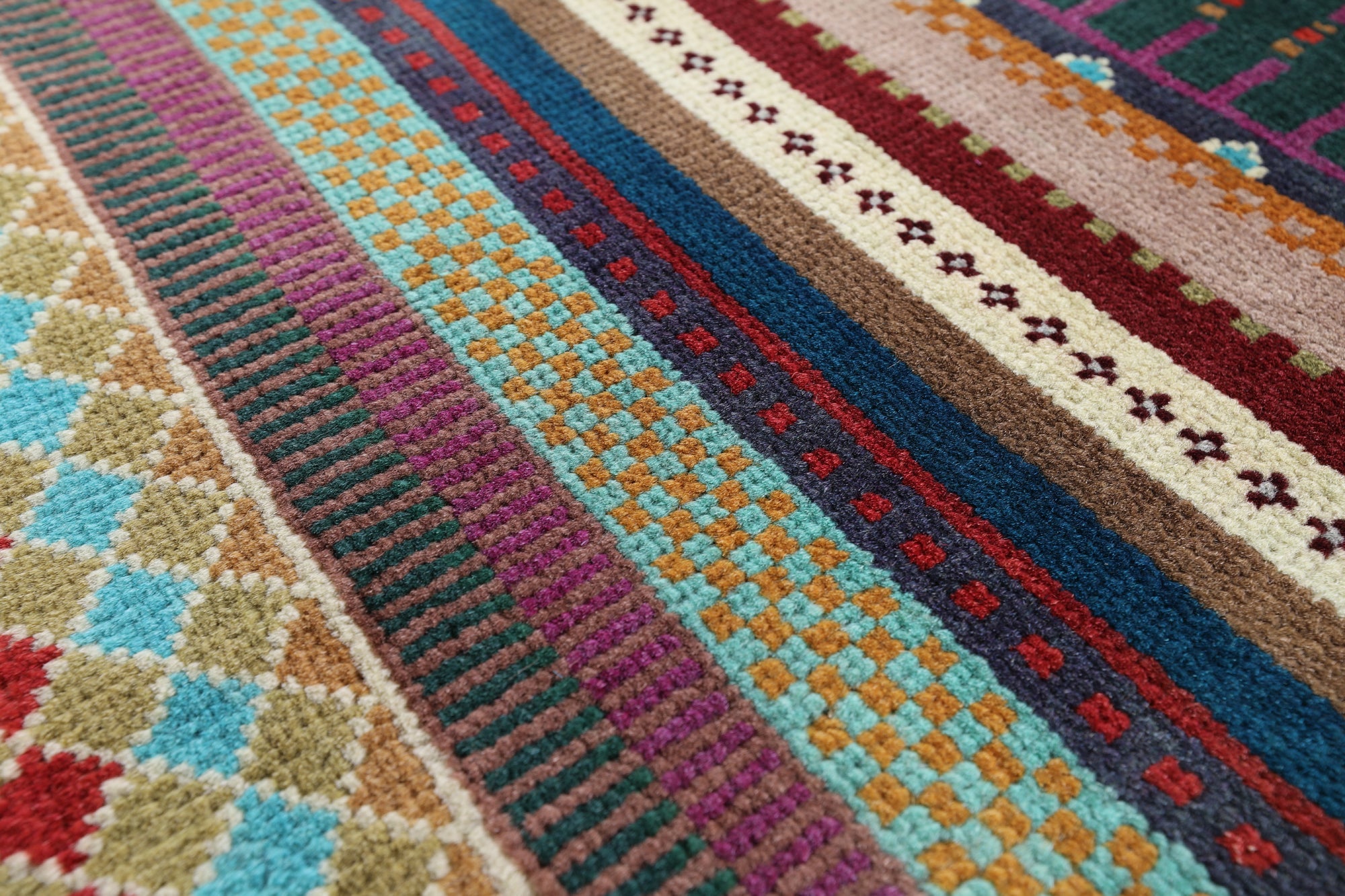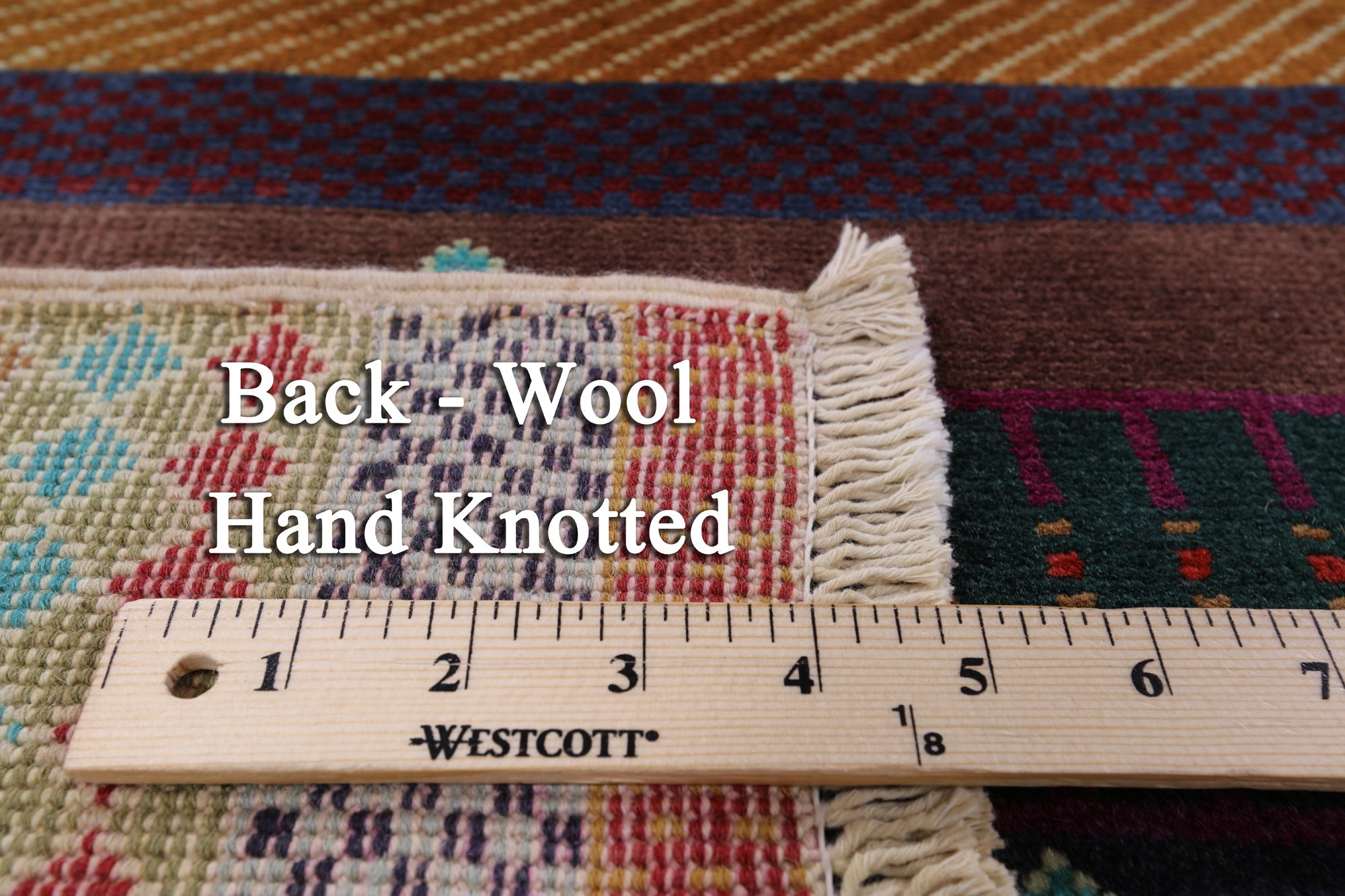 Gabbeh rugs are hand knotted to reflect tribal and other patterns such as solids, and nomadic designs. The simplistic "child-like" bold designs of Gabbeh rugs is what makes them perfectly suitable for any decor. Gabbeh rugs are made from high-quality wool and have a high density of knots. Gabbeh rugs are hand-knotted and eco-friendly, because only natural dyes are used in their production.