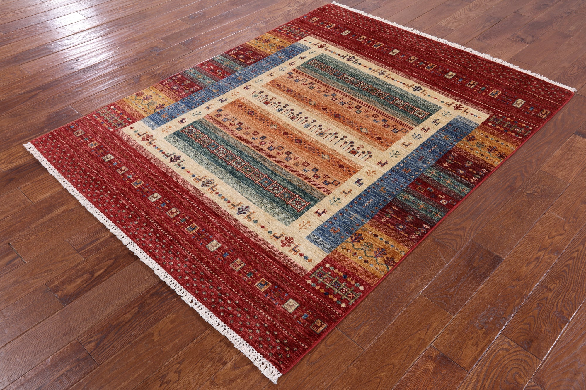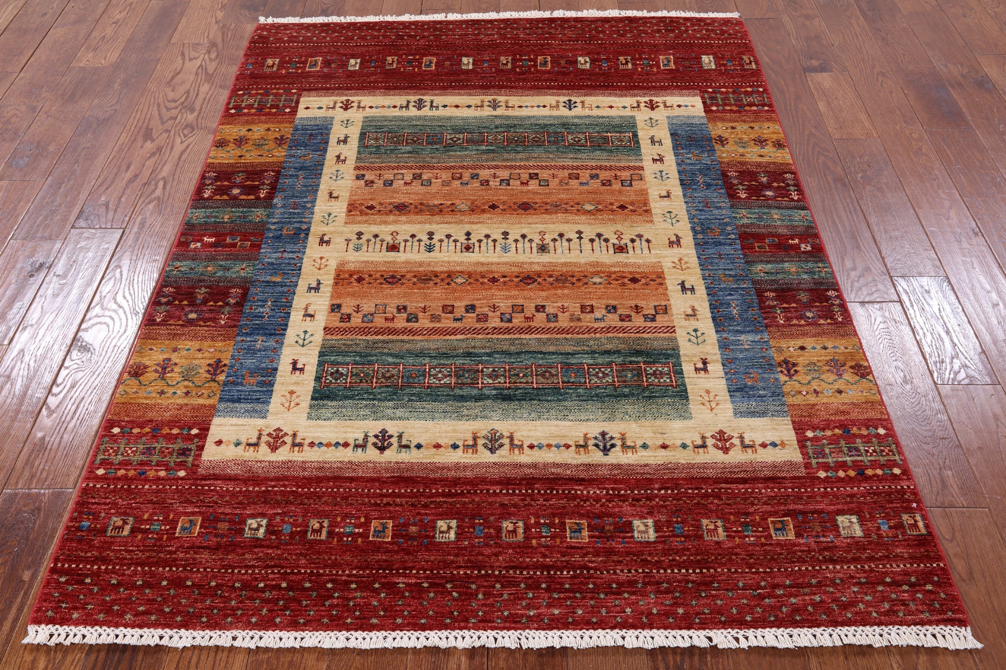 Gabbeh rugs are hand-spun wool in both the pile and the foundation, as well as all natural dyes. Simple, colorful geometric patterns, abstract scenery, child-like representations of people and animals, different colors, reds, blue, greens ,yellow, purple. Modern technology has improved the dye process to allow a wider range of colors as well as more stable and easier to care for colors.