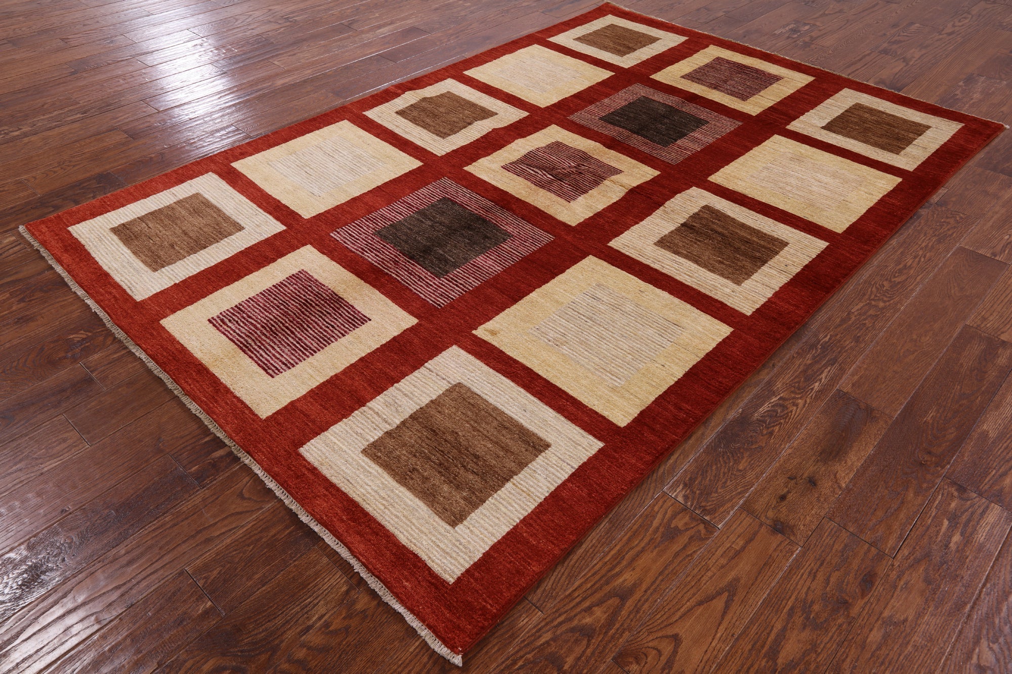 Gabbeh rugs are hand-spun wool in both the pile and the foundation, as well as all natural dyes. Simple, colorful geometric patterns, abstract scenery, child-like representations of people and animals, different colors, reds, blue, greens ,yellow, purple. Modern technology has improved the dye process to allow a wider range of colors as well as more stable and easier to care for colors.