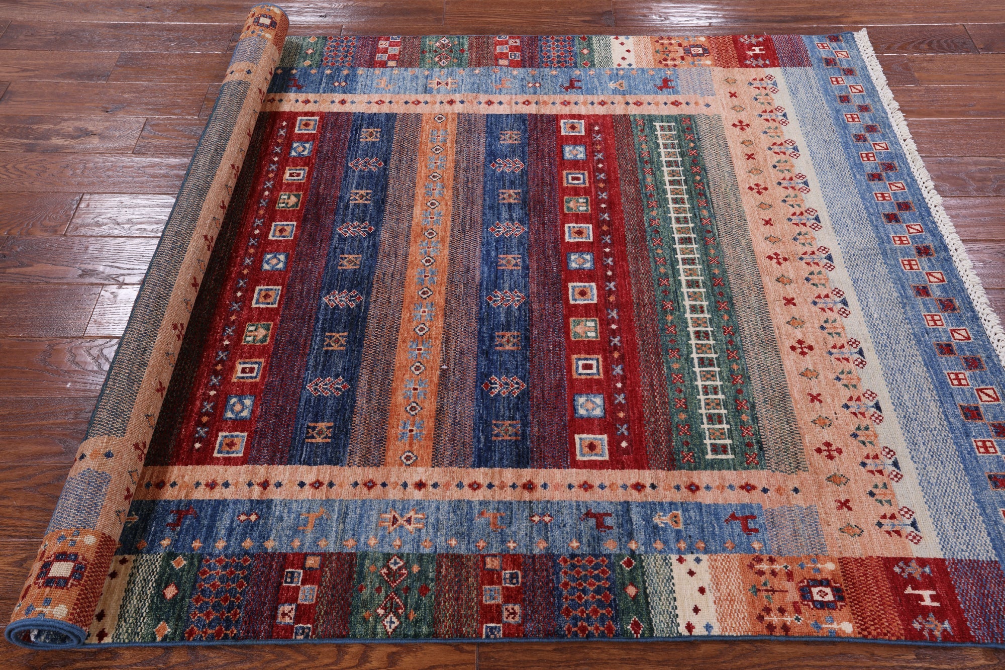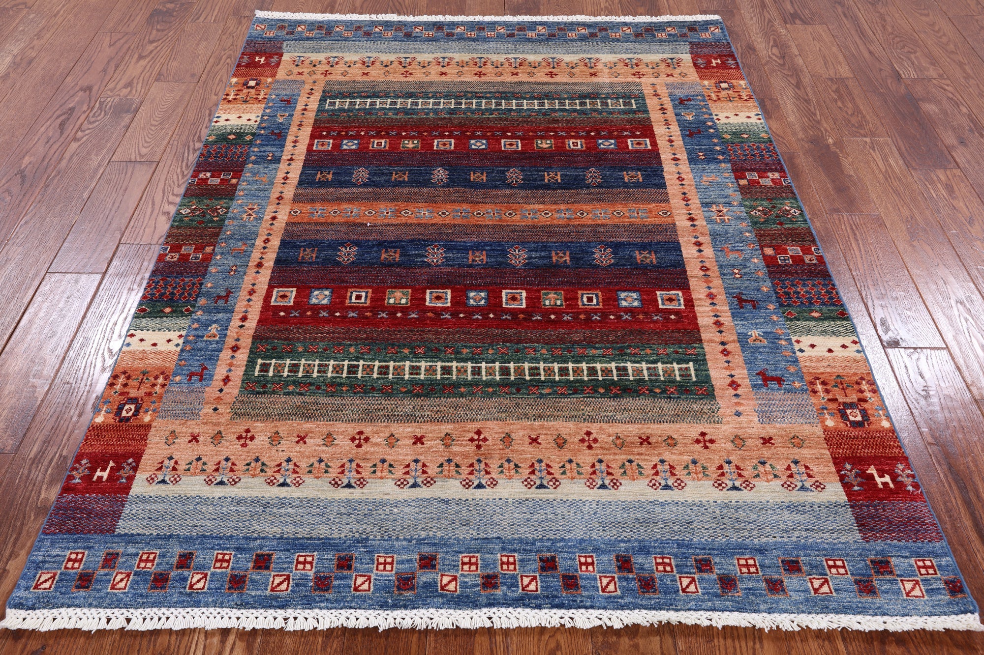 Gabbeh rugs are hand-spun wool in both the pile and the foundation, as well as all natural dyes. Simple, colorful geometric patterns, abstract scenery, child-like representations of people and animals, different colors, reds, blue, greens ,yellow, purple. Modern technology has improved the dye process to allow a wider range of colors as well as more stable and easier to care for colors.