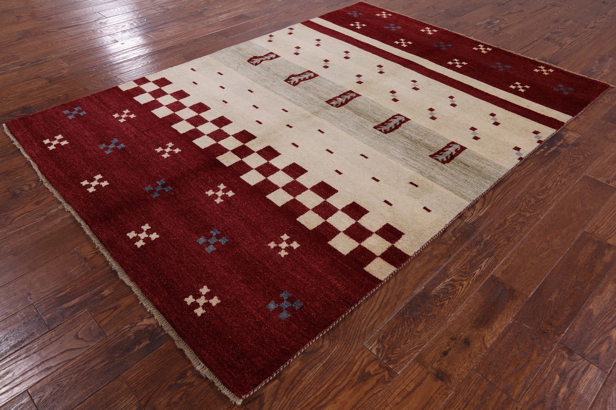 Gabbeh rugs are hand-spun wool in both the pile and the foundation, as well as all natural dyes. Simple, colorful geometric patterns, abstract scenery, child-like representations of people and animals, different colors, reds, blue, greens ,yellow, purple. Modern technology has improved the dye process to allow a wider range of colors as well as more stable and easier to care for colors.