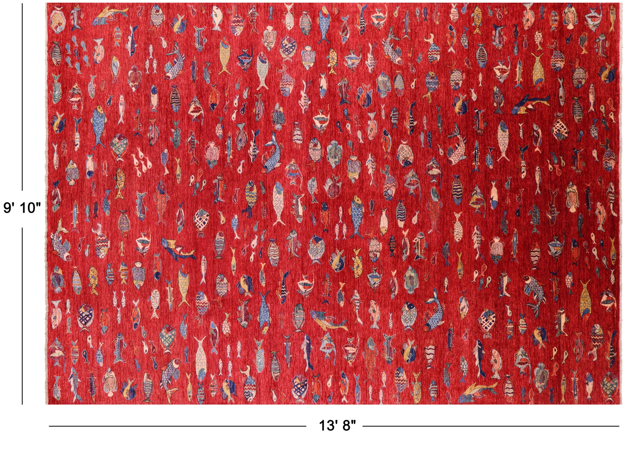 Red 9' 10" X 13' 8" Gabbeh Fish Design Hand Knotted Wool Rug - Q22862