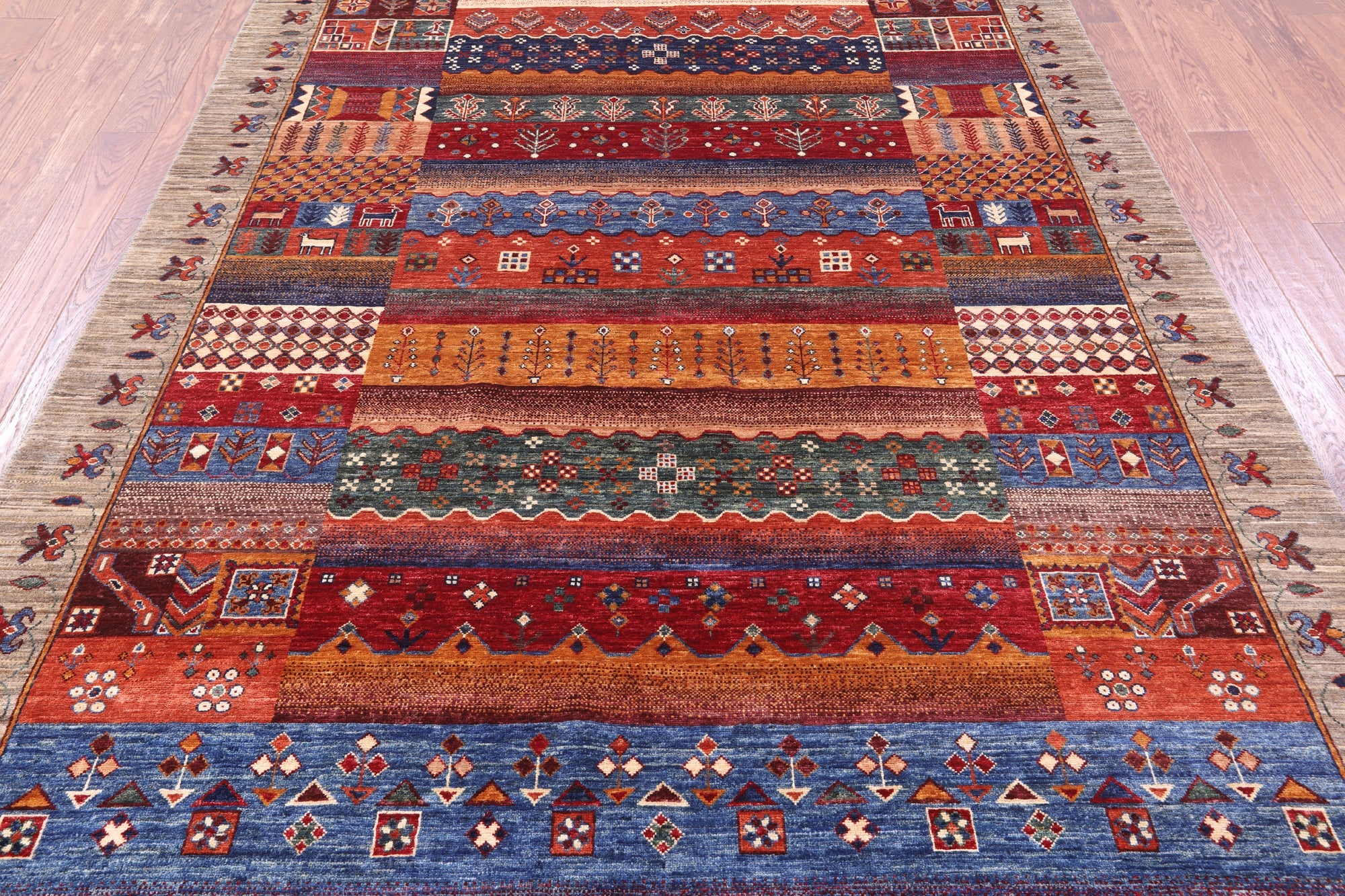Gabbeh rugs are nothing short of simplistic and tribal, with designs consisting of primarily geometric shapes, animals, and plants. All done in a simplified way and based on the nomadic observation. Commonly brightly colored, these rugs are fun and beautiful and will add a warm touch to any home.