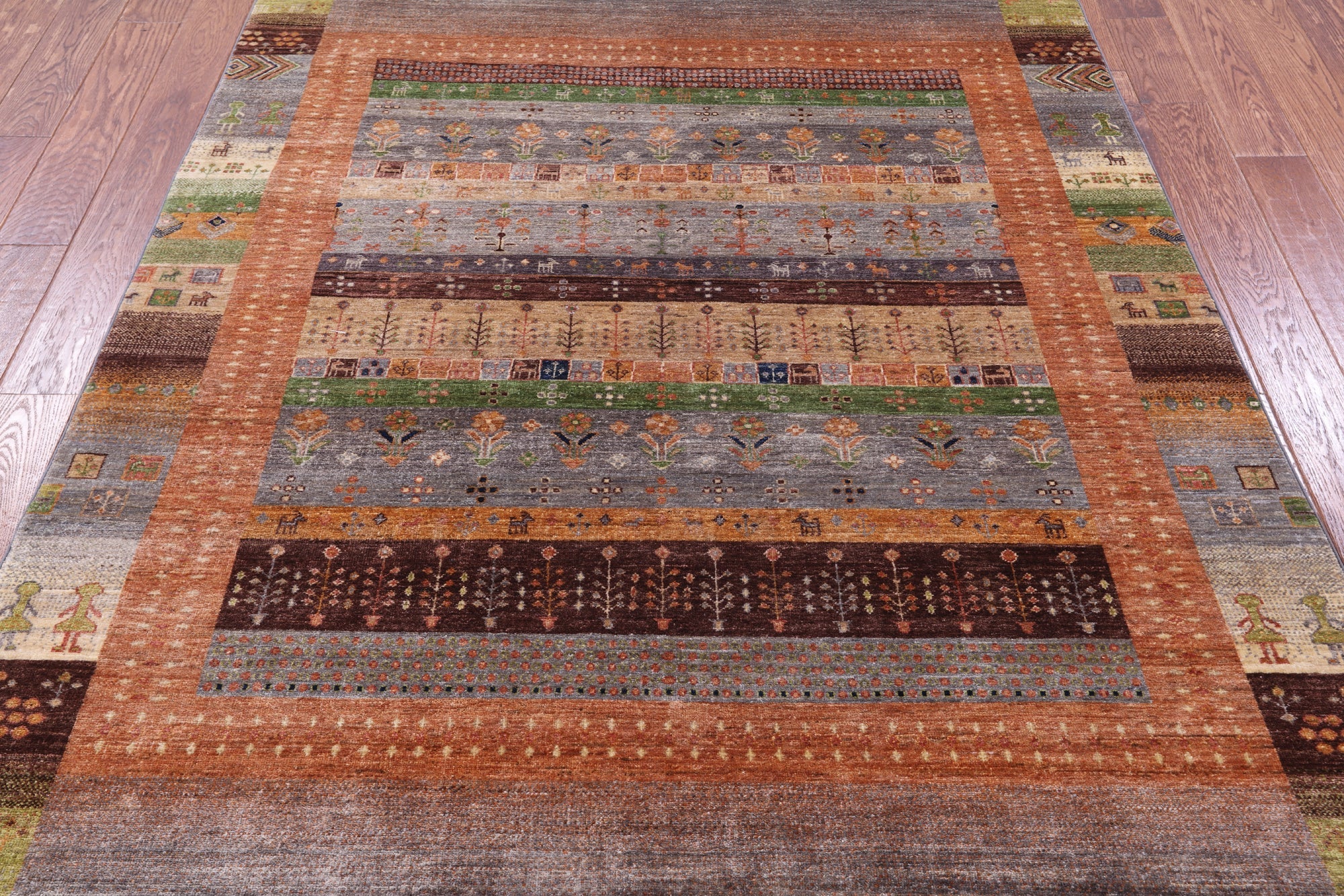 Gabbeh rugs are nothing short of simplistic and tribal, with designs consisting of primarily geometric shapes, animals, and plants. All done in a simplified way and based on the nomadic observation. Commonly brightly colored, these rugs are fun and beautiful and will add a warm touch to any home.
