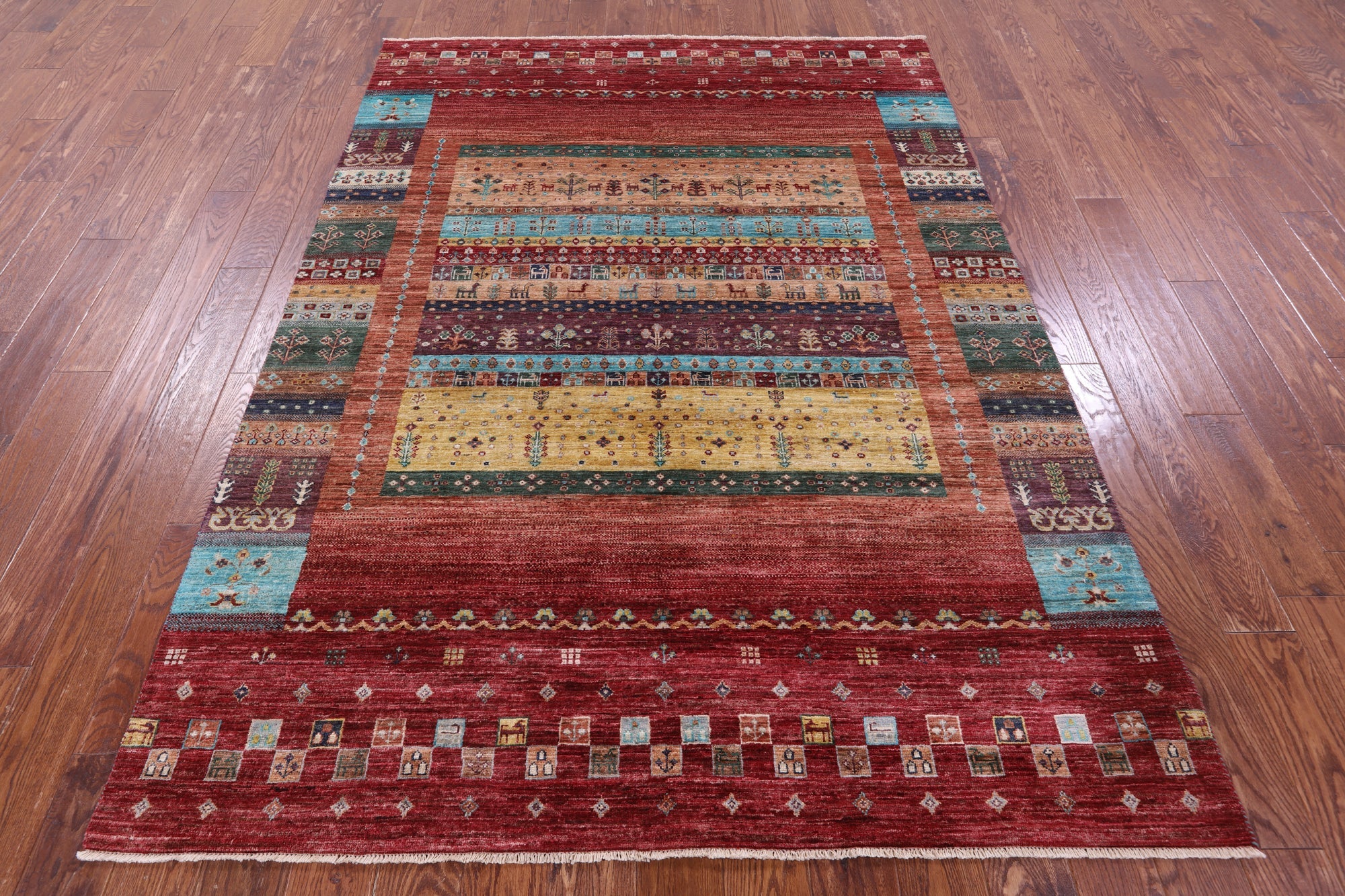 Gabbeh rugs are nothing short of simplistic and tribal, with designs consisting of primarily geometric shapes, animals, and plants. All done in a simplified way and based on the nomadic observation. Commonly brightly colored, these rugs are fun and beautiful and will add a warm touch to any home.