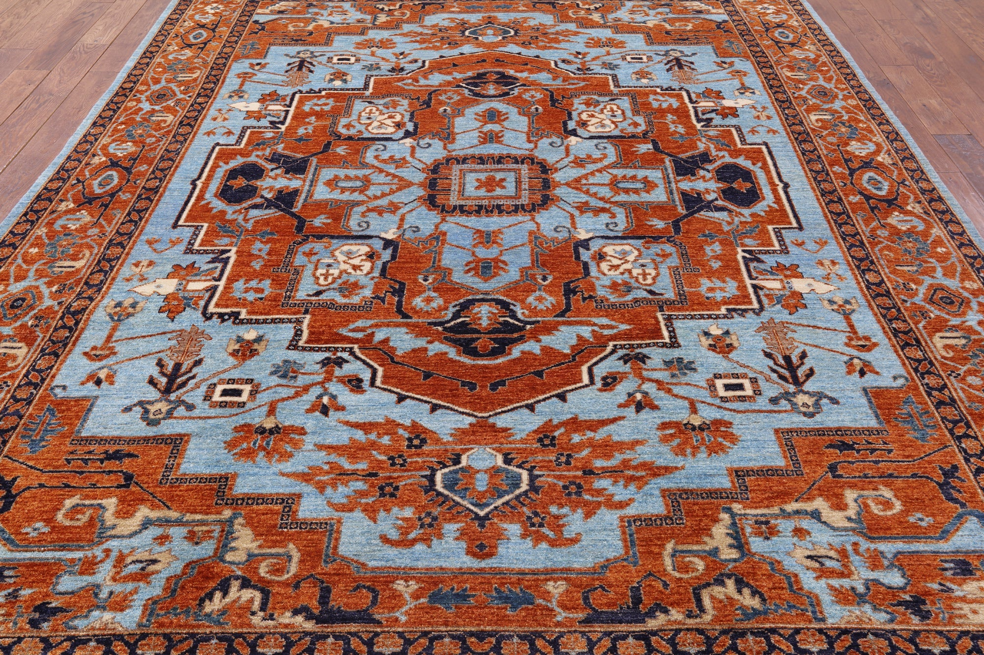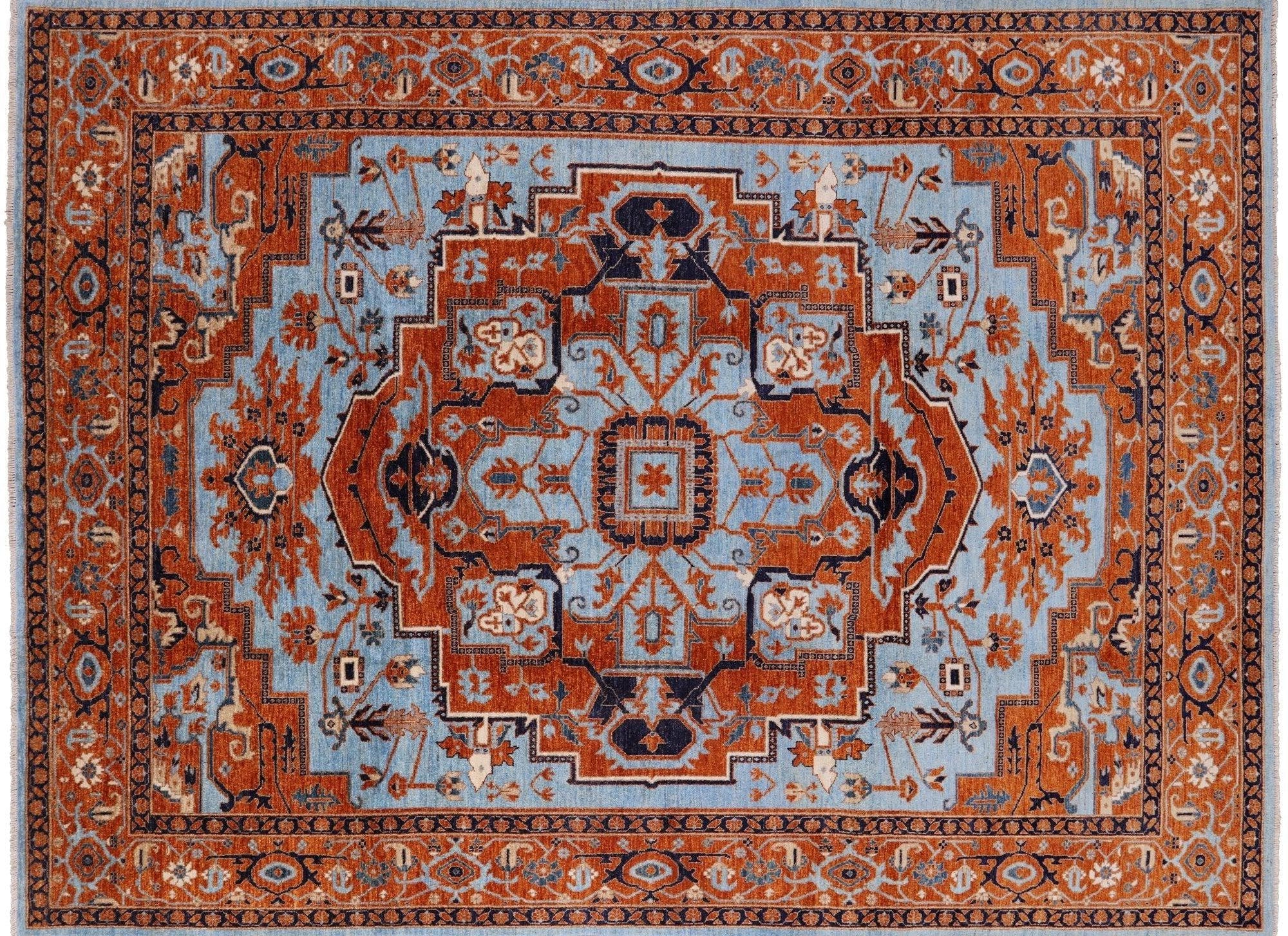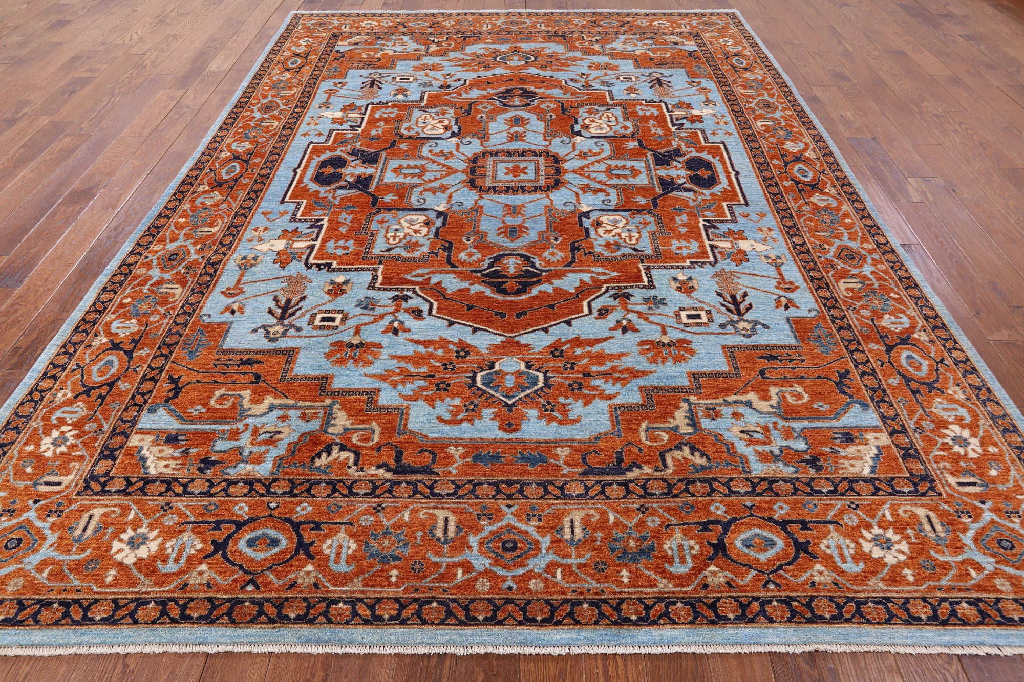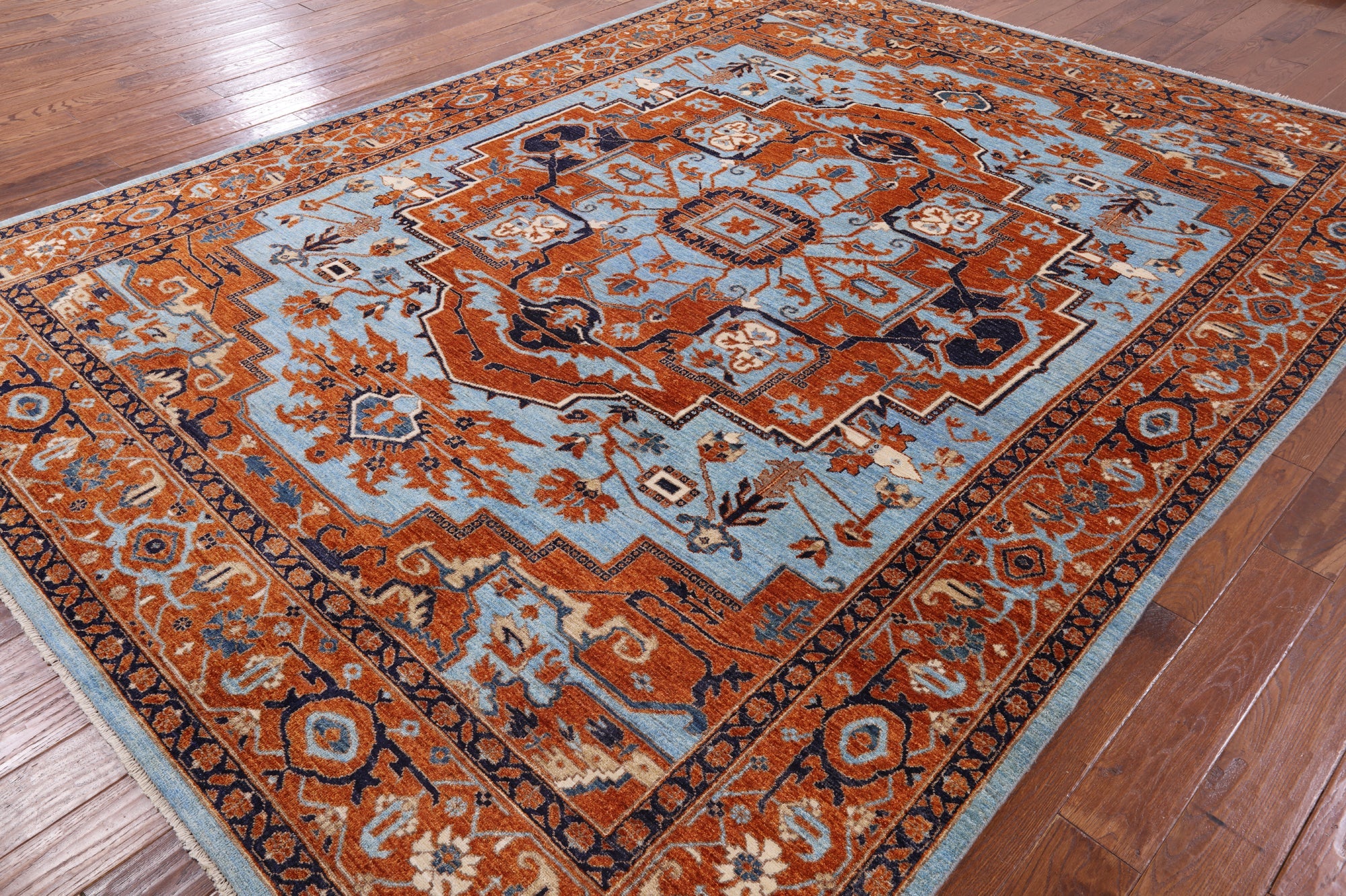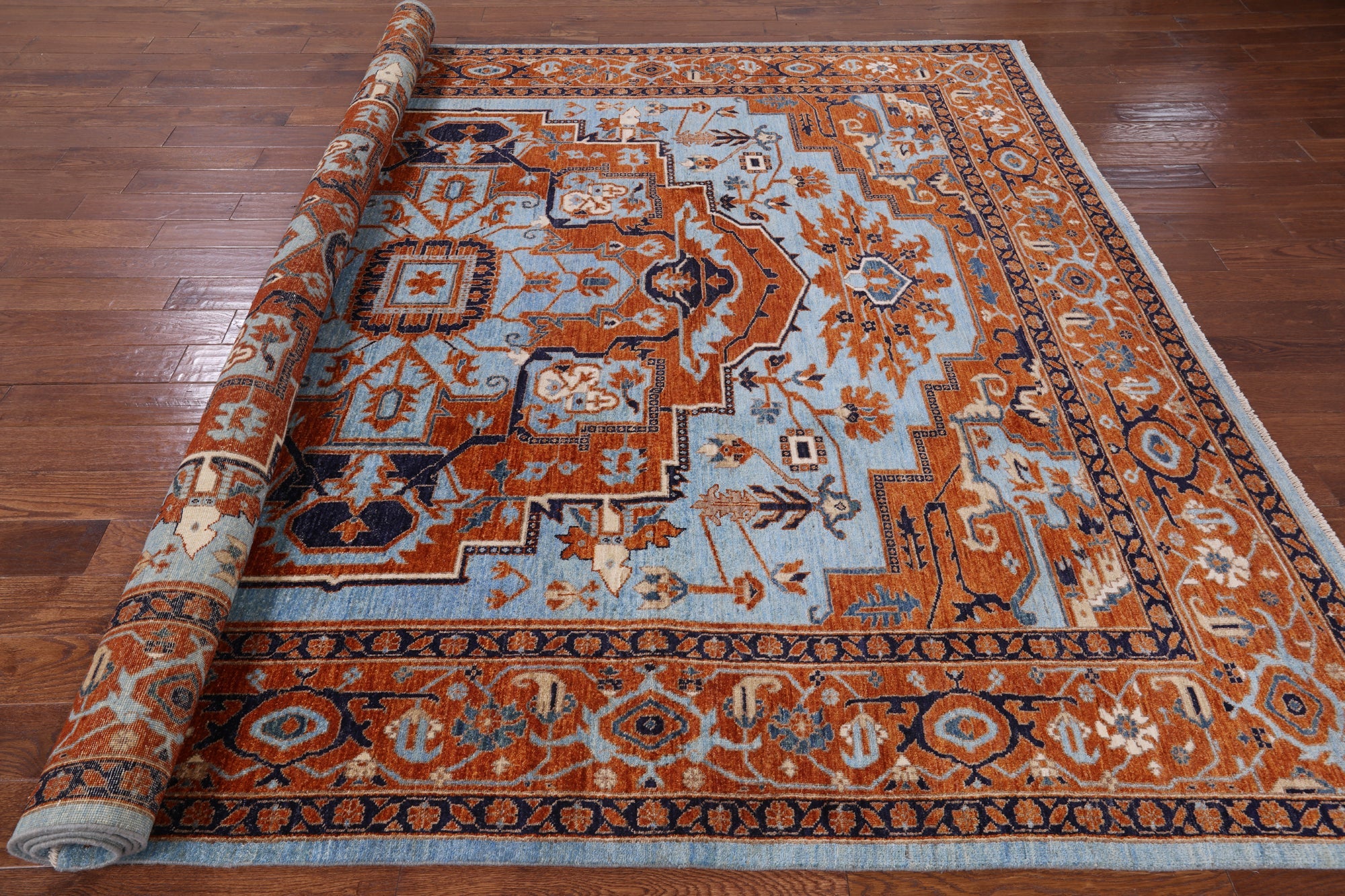 The nature-inspired color palette of Serapi/Heriz rugs gives them an antique look, which has historically sought after for many years. They commonly feature intricate medallions, followed by abstract florals and geometric designs. What makes the Serapi/Heriz so desirable, is their high endurance and longevity under high traffic. Serapi/Heriz rugs are constructed by a labor intensive hand knotting process, made from thick plush piles of wool.