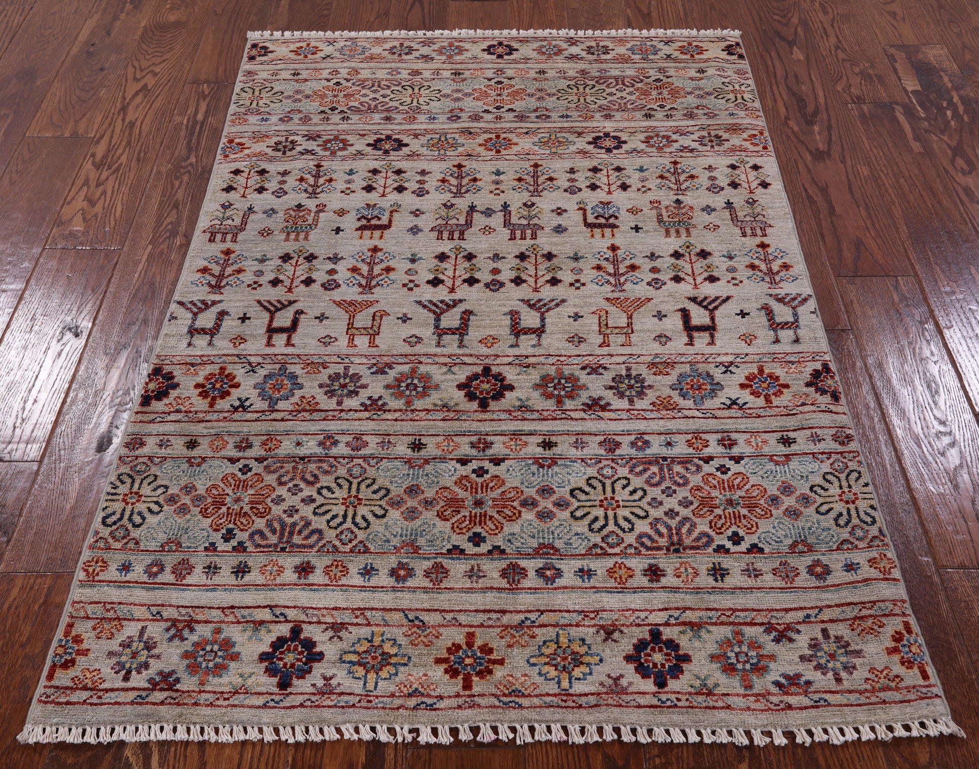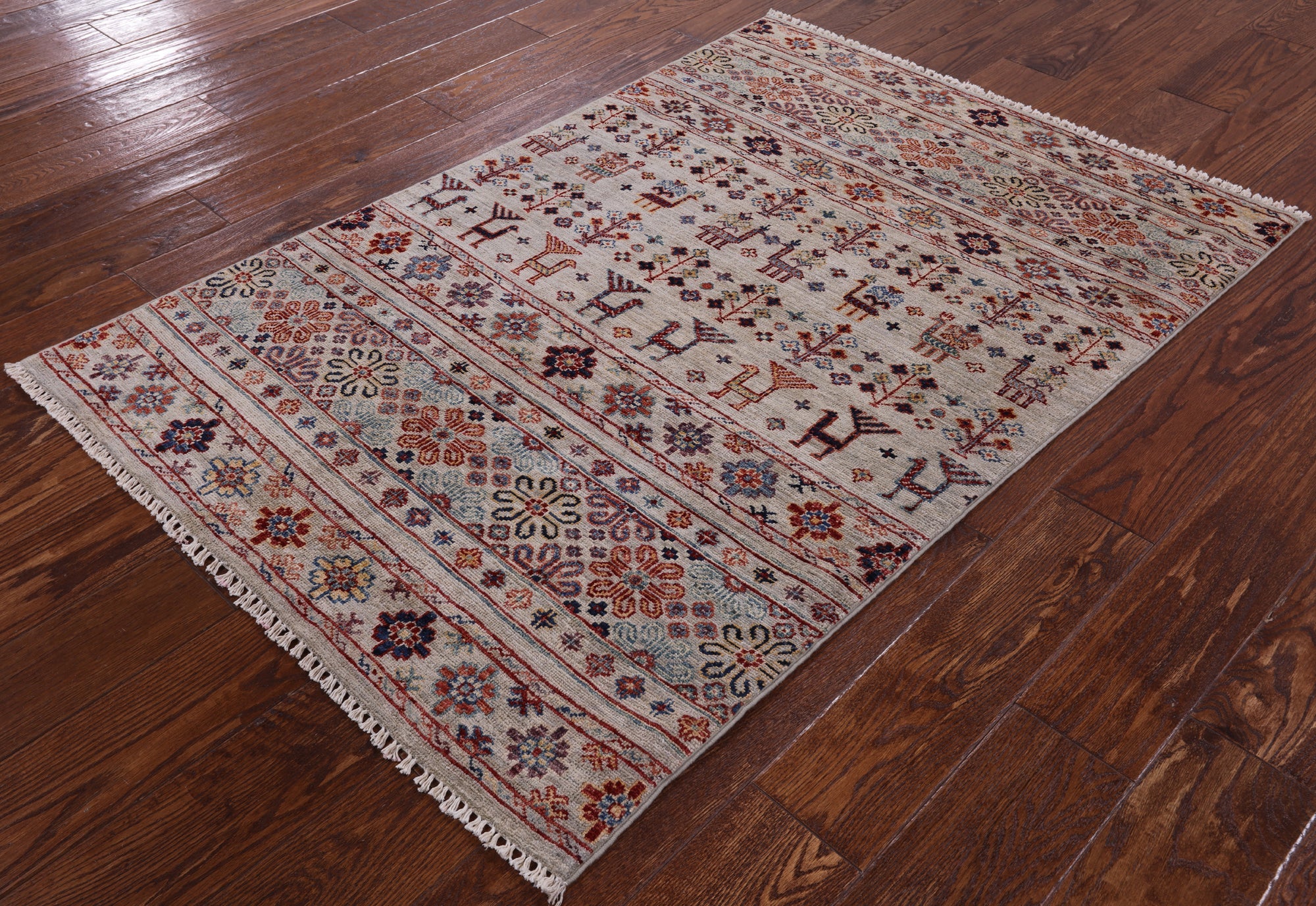Gabbeh rugs are hand-spun wool in both the pile and the foundation, as well as all natural dyes. Simple, colorful geometric patterns, abstract scenery, child-like representations of people and animals, different colors, reds, blue, greens ,yellow, purple. Modern technology has improved the dye process to allow a wider range of colors as well as more stable and easier to care for colors.
