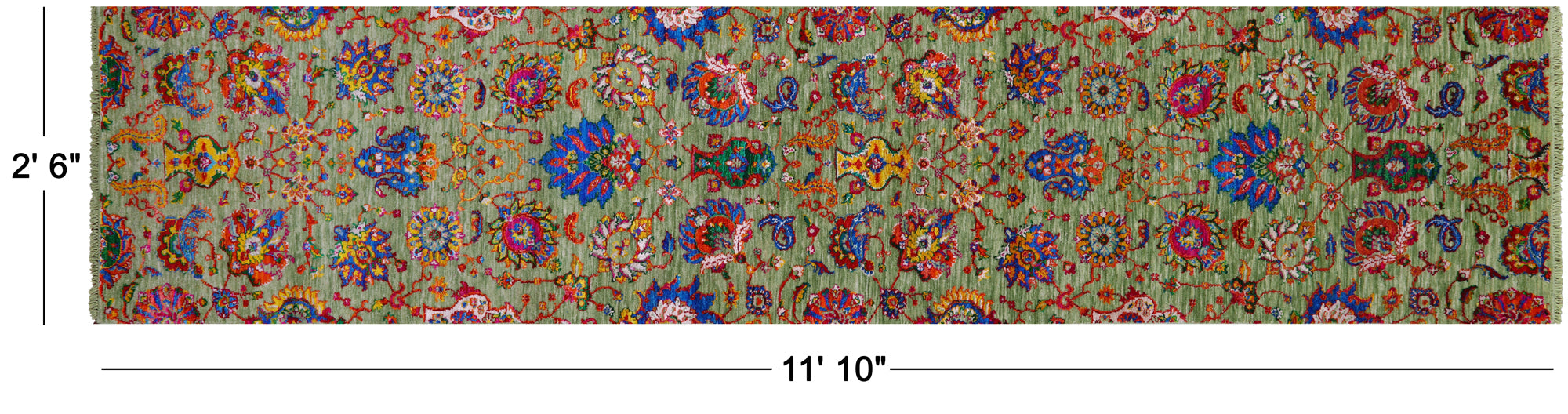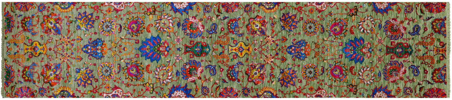 Green Persian Tabriz Hand-Knotted Wool & Silk Runner Rug 2' 6" X 11' 10" - Q23411