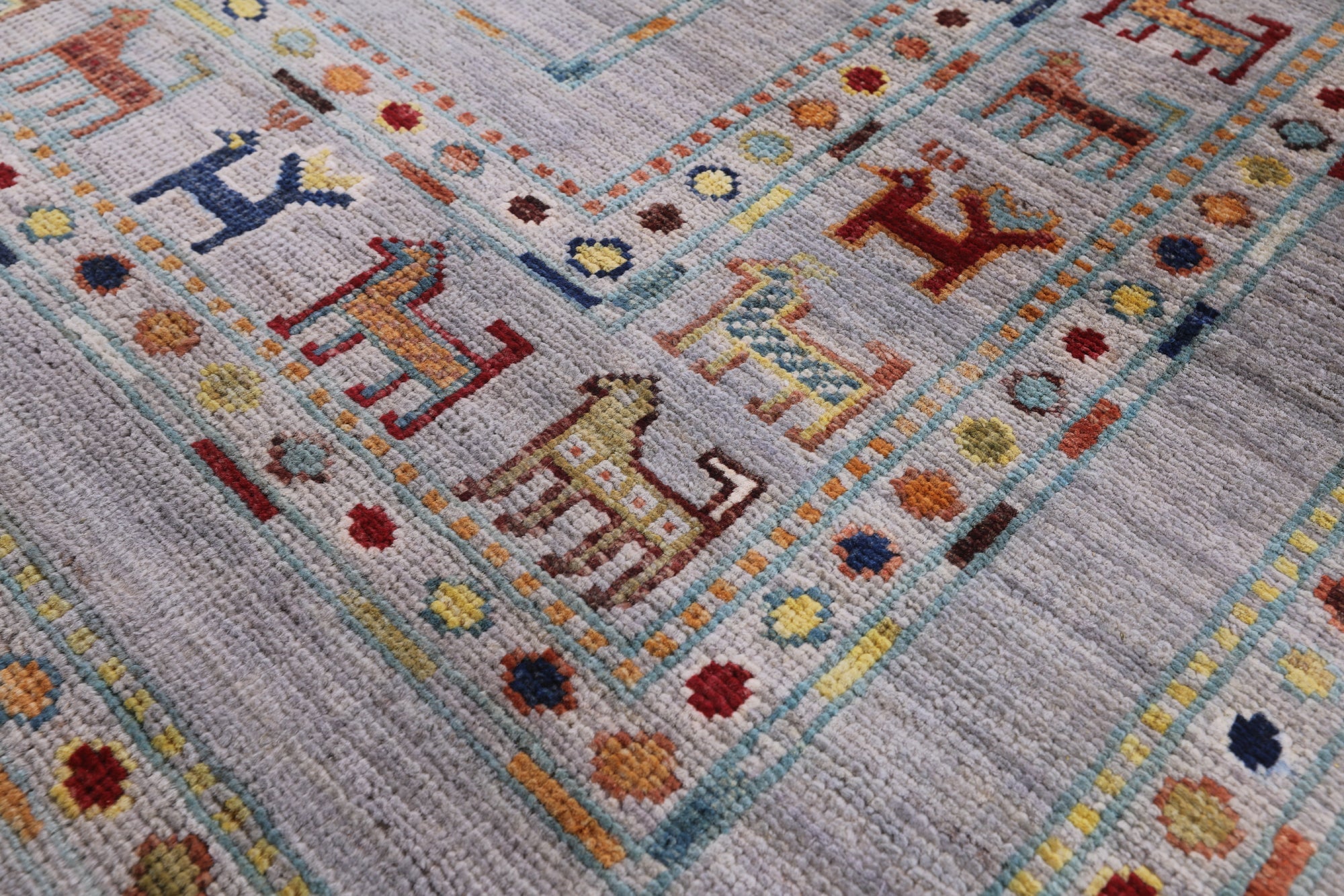 Gabbeh rugs are nothing short of simplistic and tribal, with designs consisting of primarily geometric shapes, animals, and plants. All done in a simplified way and based on the nomadic observation. Commonly brightly colored, these rugs are fun and beautiful and will add a warm touch to any home.