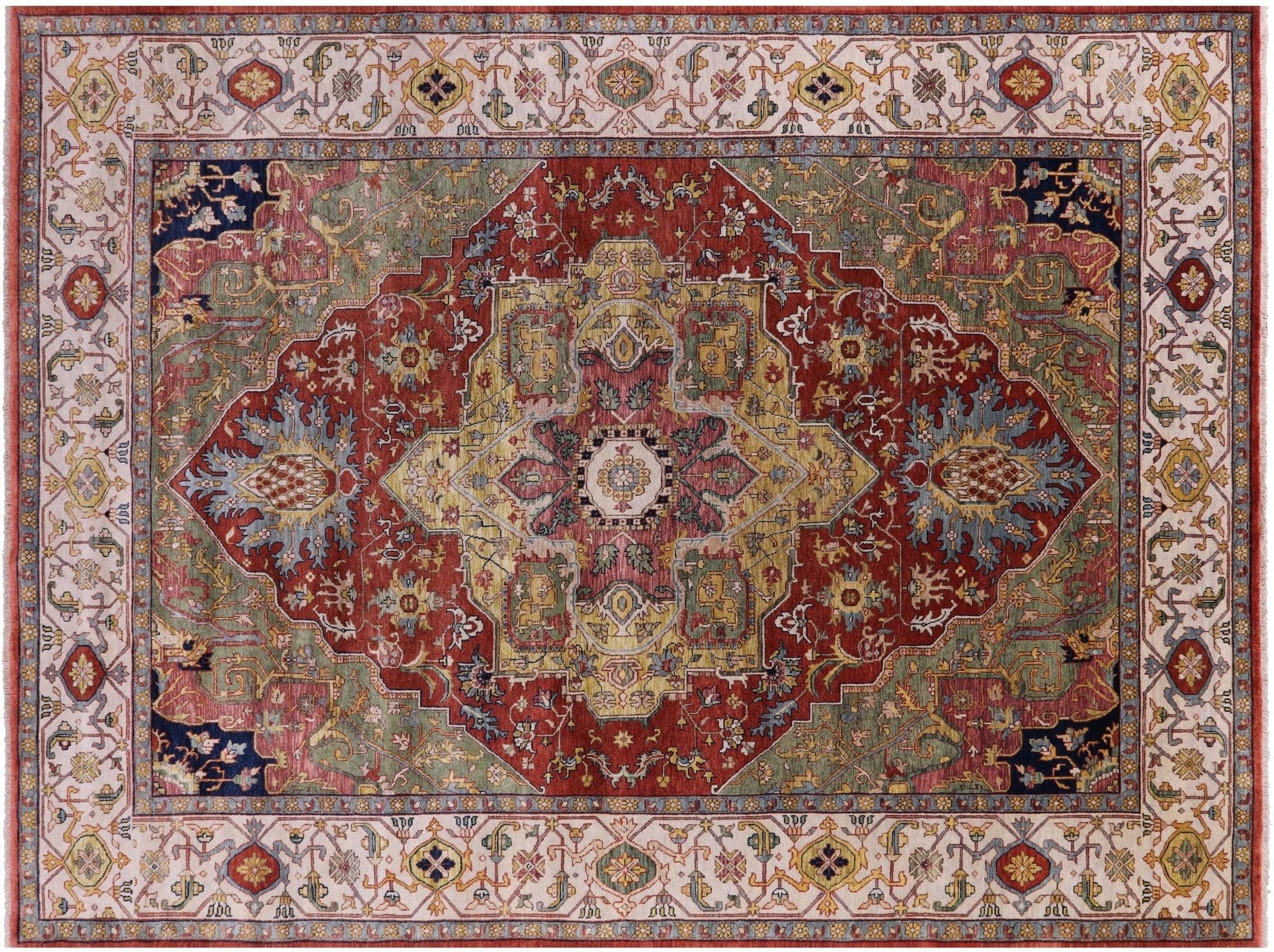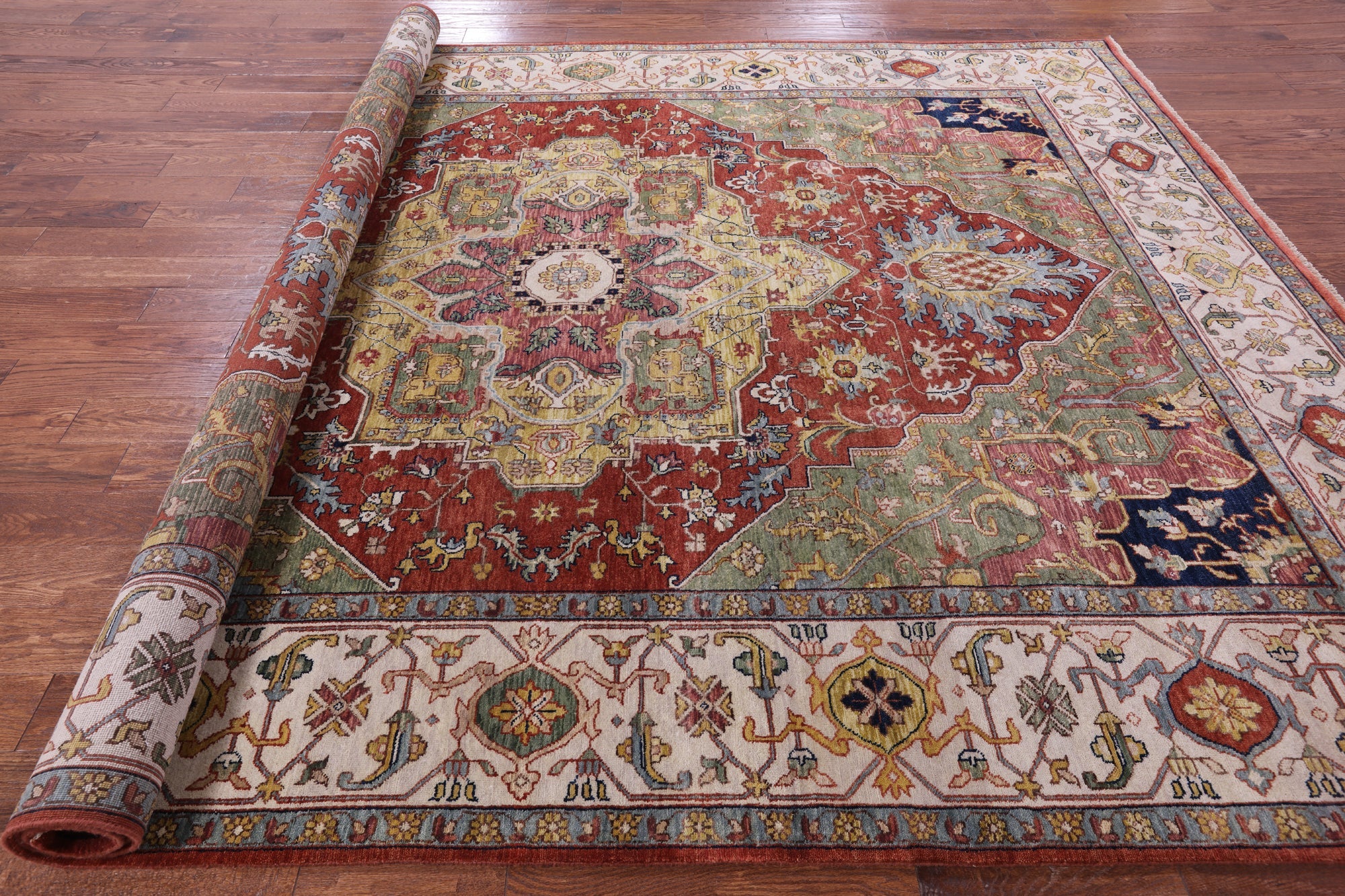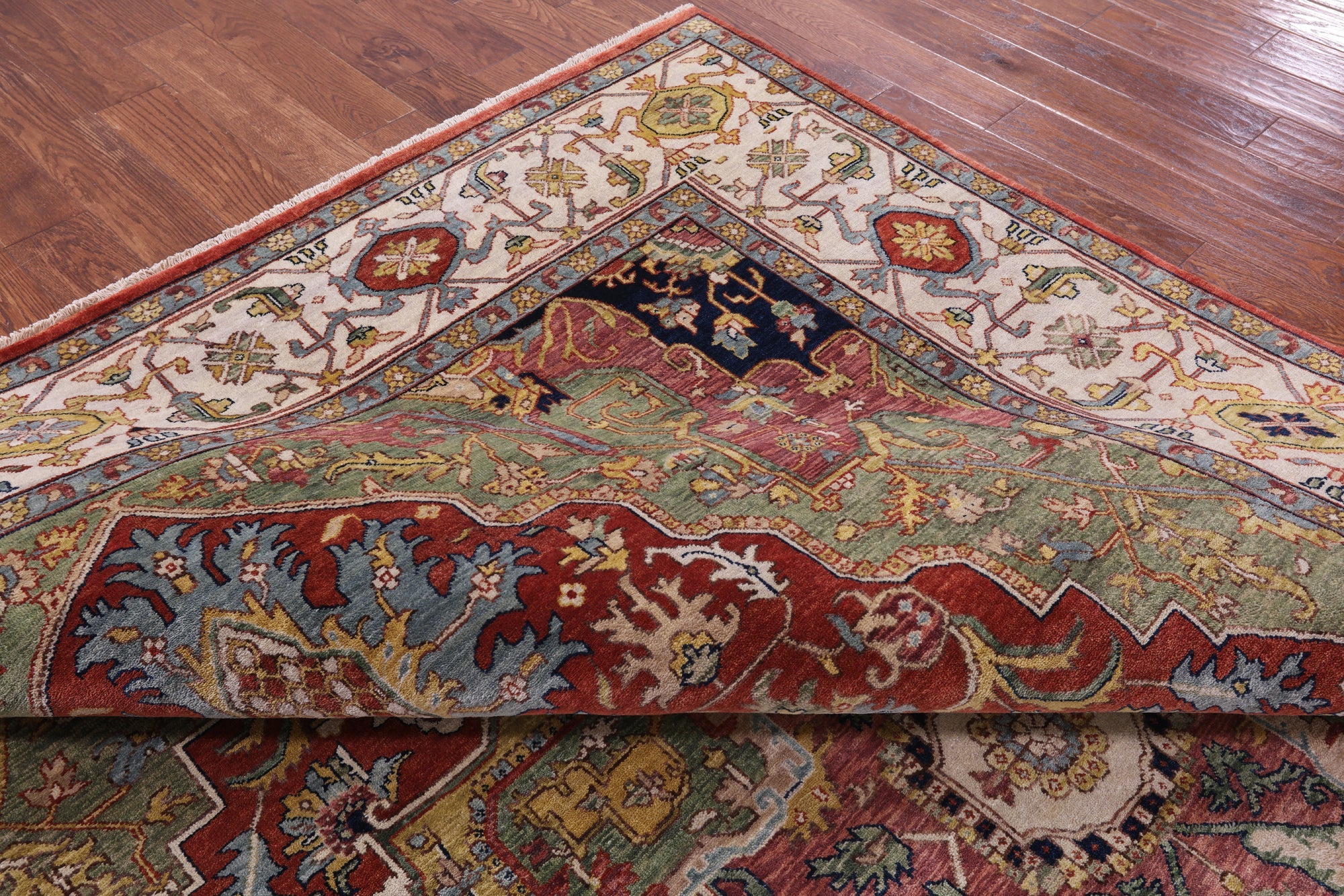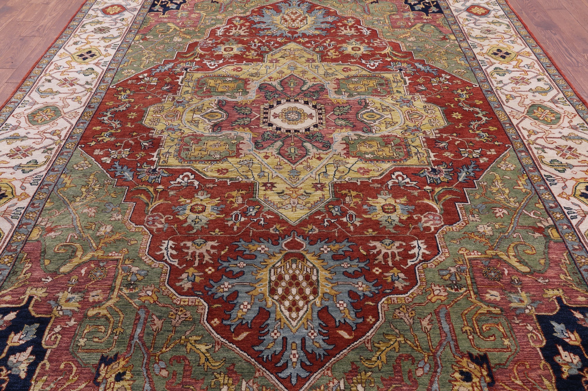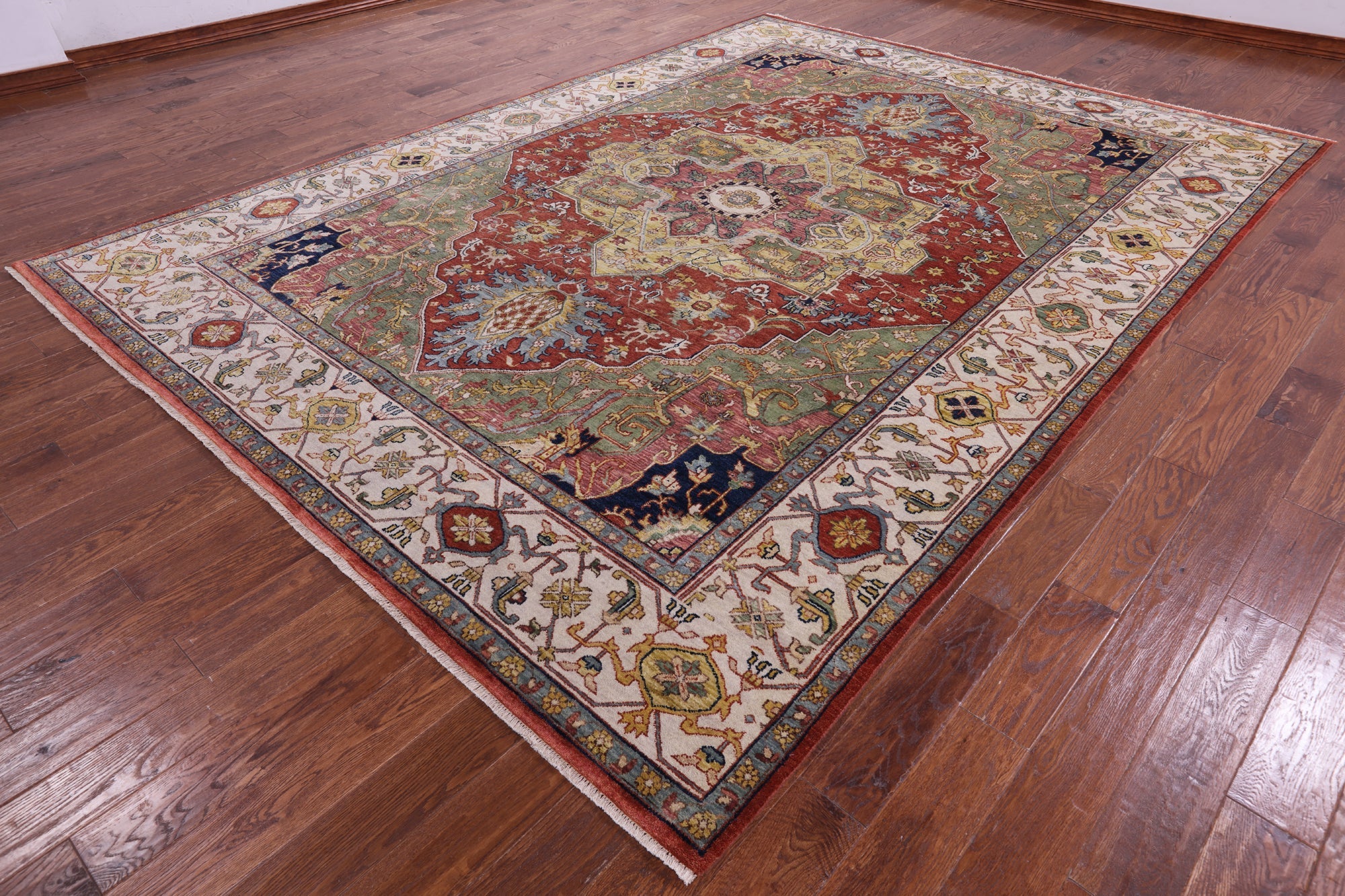 Heriz, Serapi rugs are well known for their bold and angular designs. Many being symmetric, they withhold boldly done geometric and floral-inspired shapes. These shapes are brought out with rich reds, blues, greens, and yellows contrasted against ivory. Heriz, Serapi rugs are very elegant and durable, perfect for a variety of different rooms and spaces within a home.