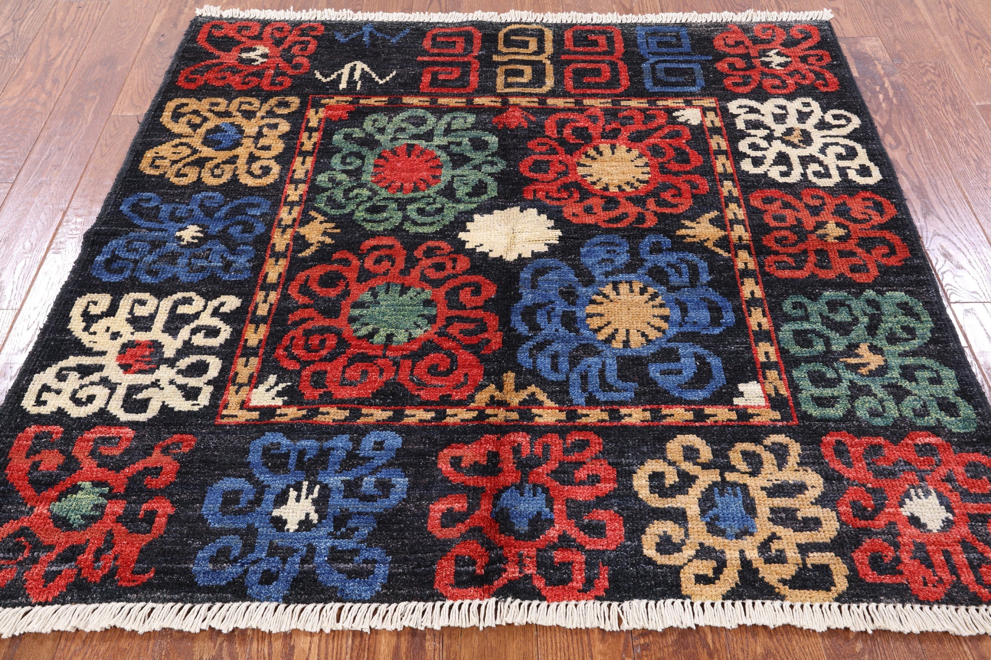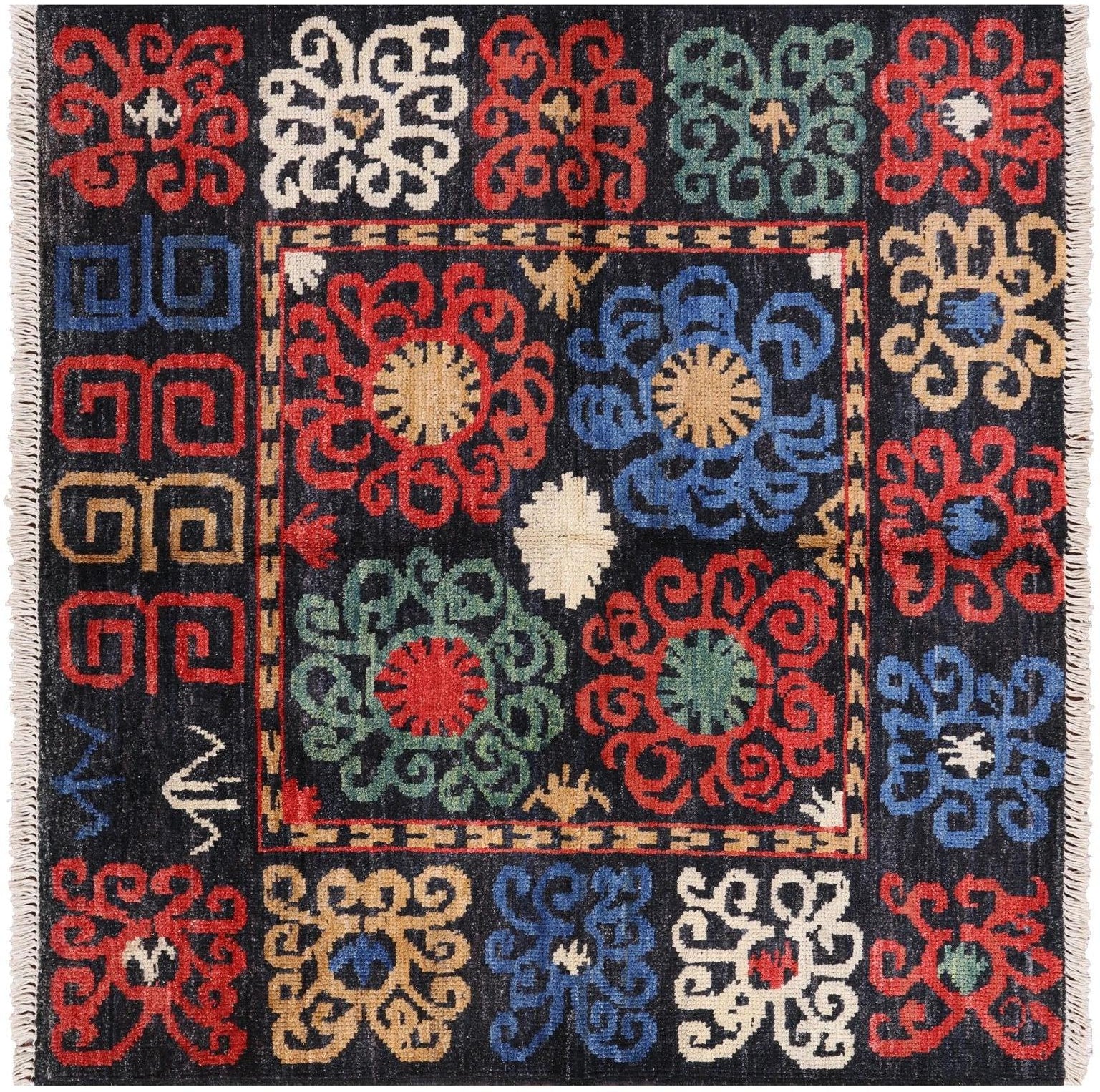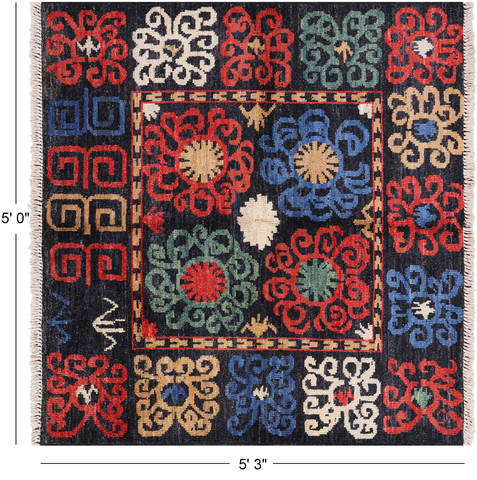 Black 5' Square Ikat Hand-Knotted Wool Rug - P6440