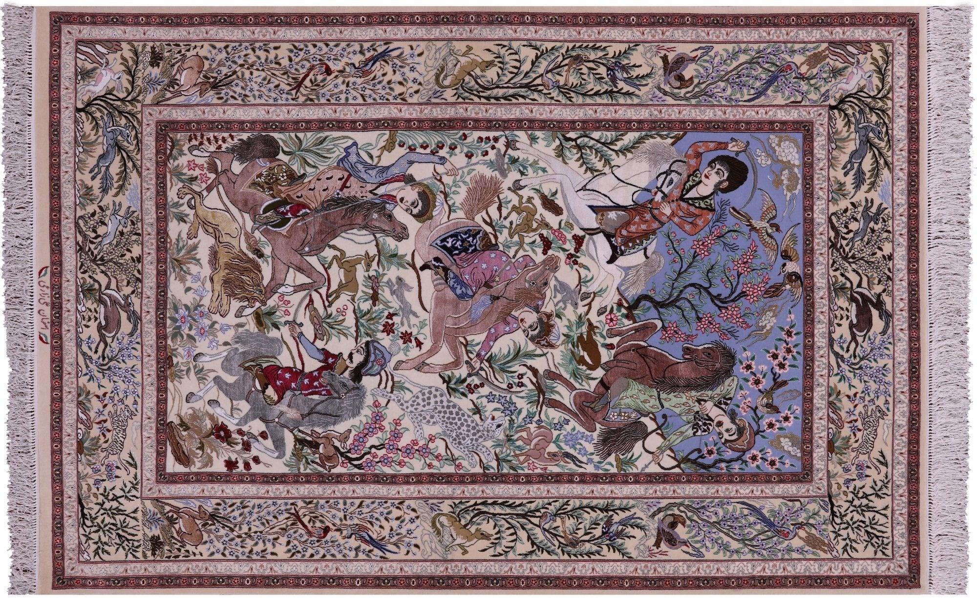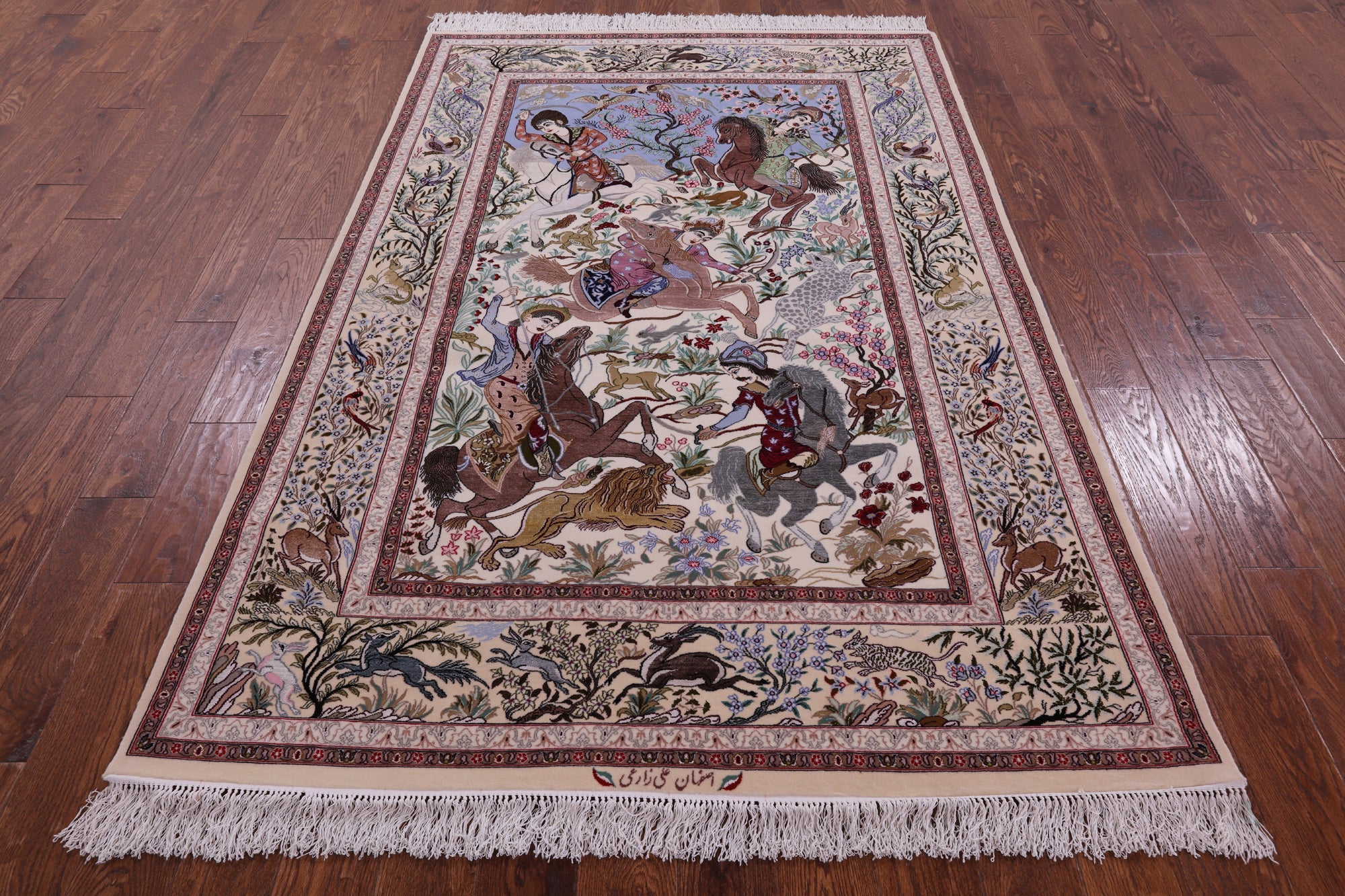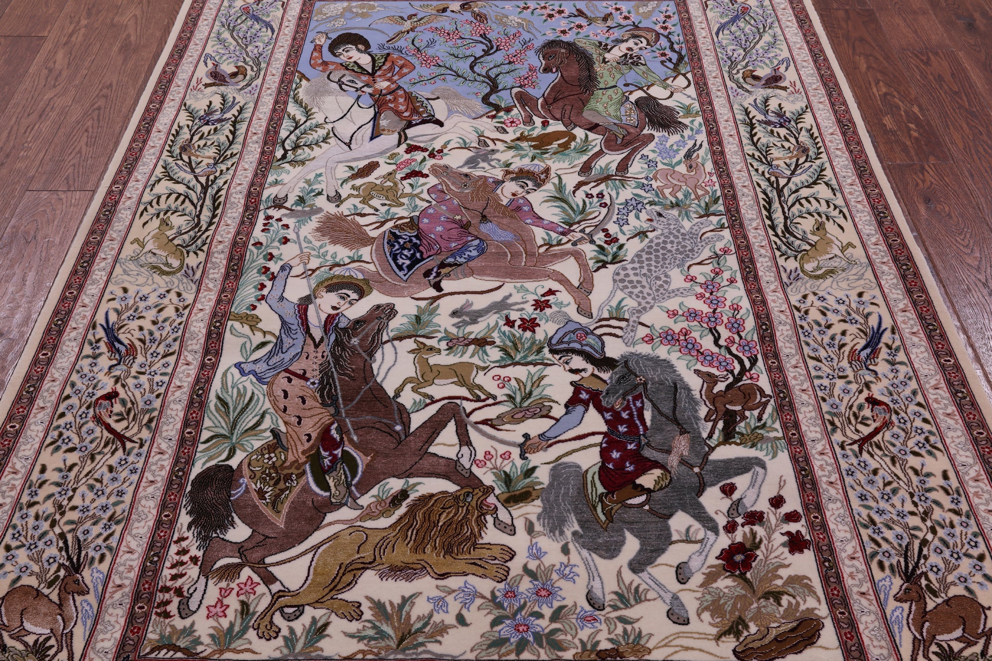 4' 11" X 7' 5" Hand Knotted Wool & Silk Signed Persian Isfahan Hunting Scene Rug - SA2706