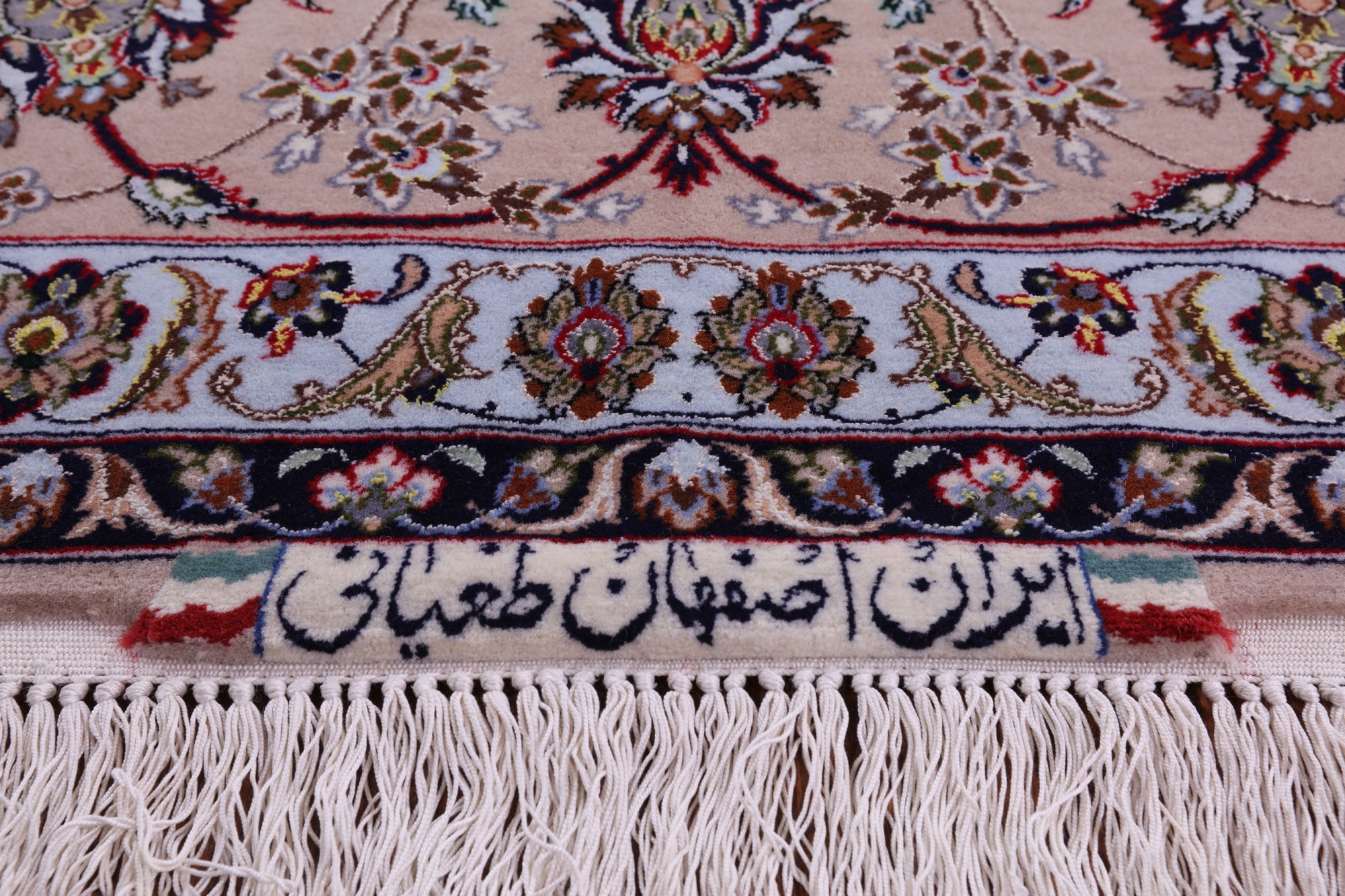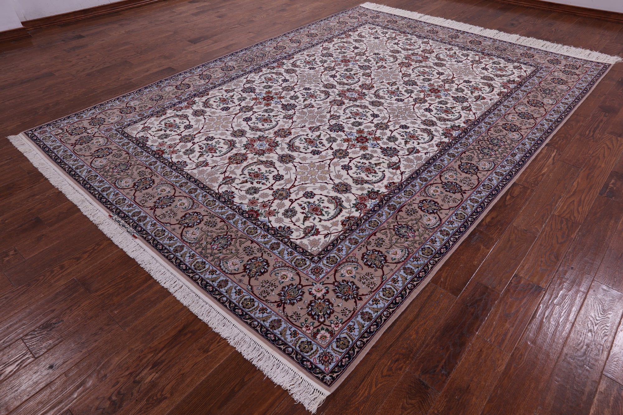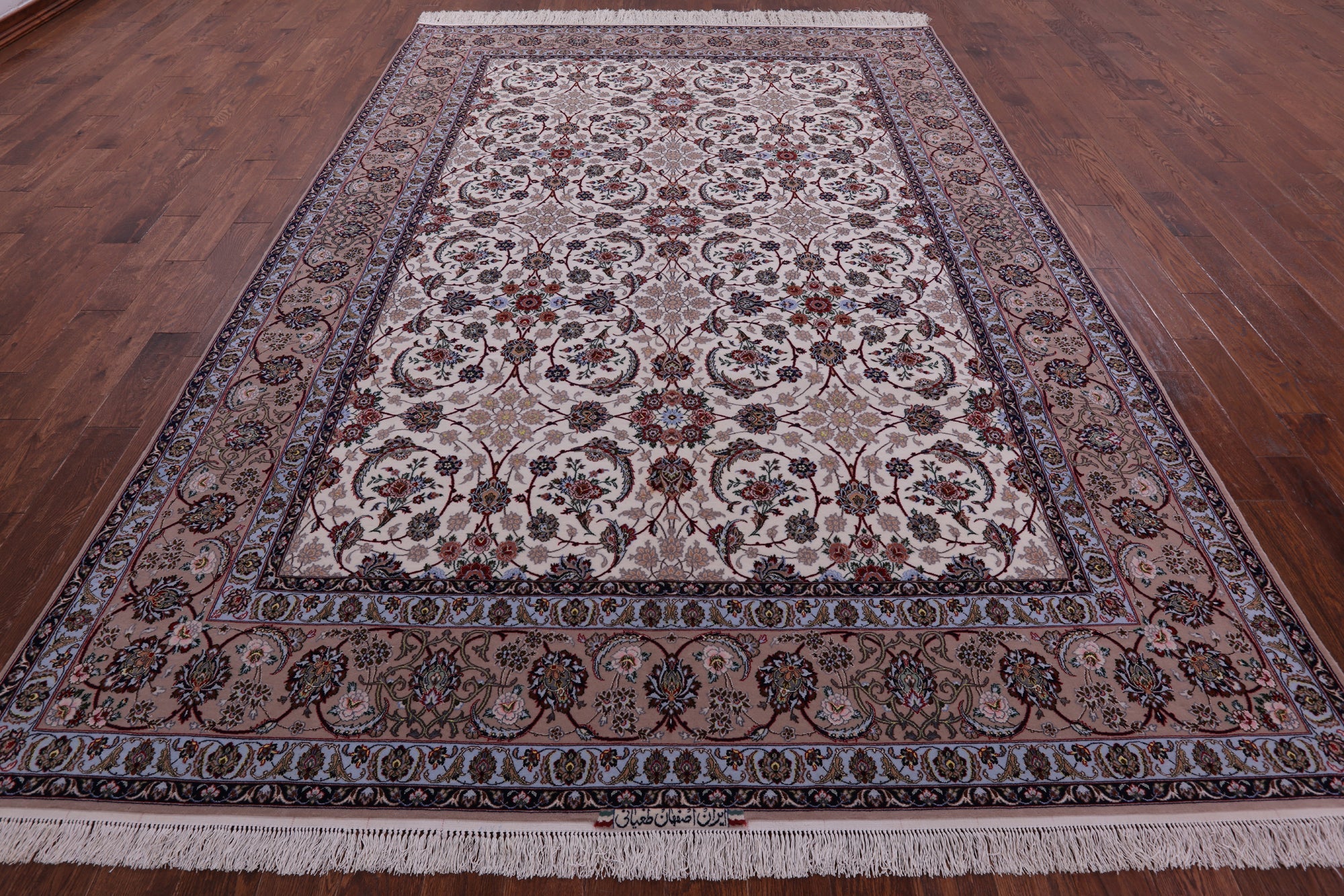 Hand knotted Isfahan rugs and carpets usually have ivory backgrounds with blue, rose, and green. Isfahan rugs and carpets often have very symmetrical and balanced designs. They usually have a single medallion. These Handmade rugs and carpets have very high quality. Isfahan rugs are one of the highest quality rugs in the world.