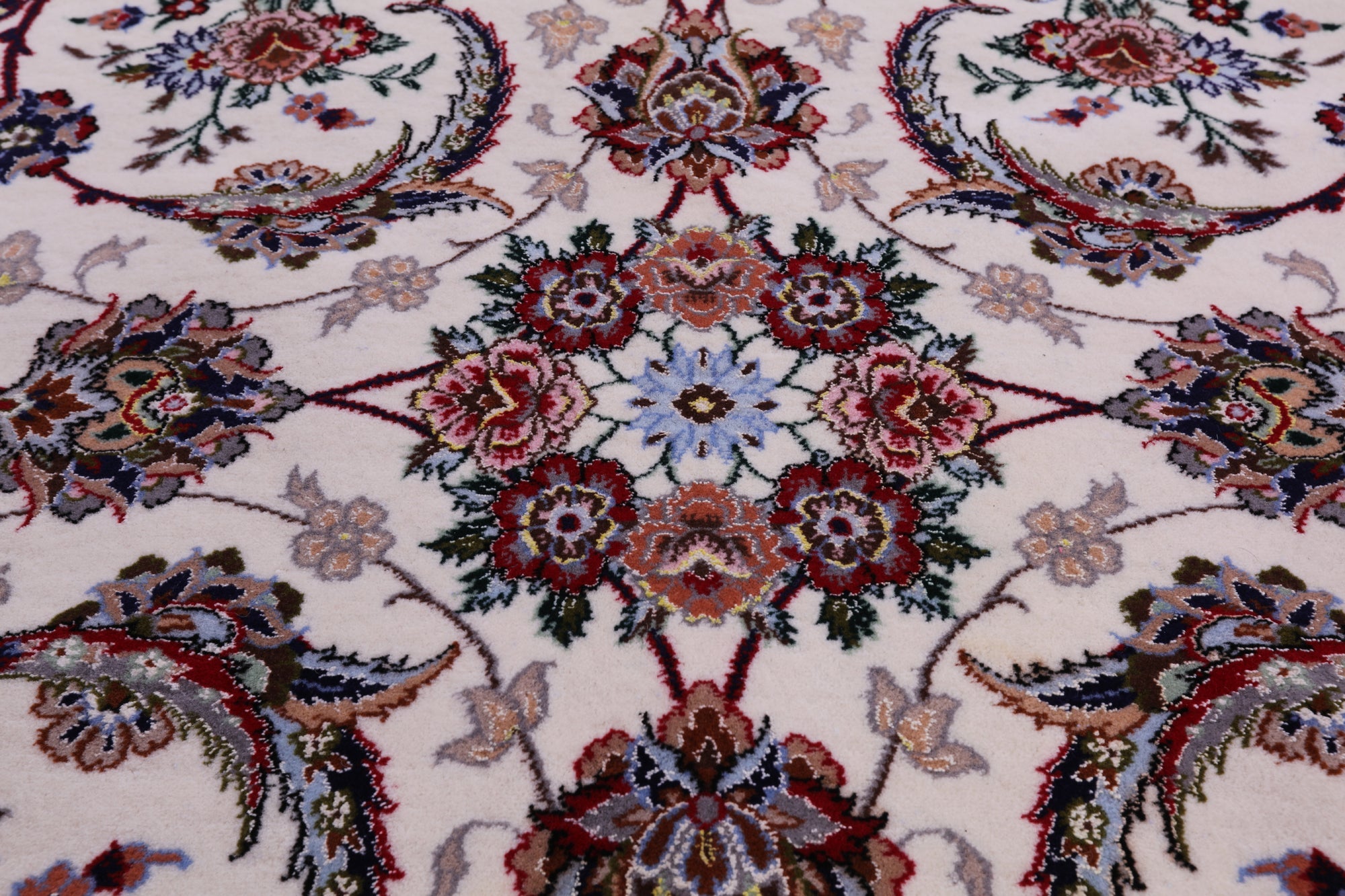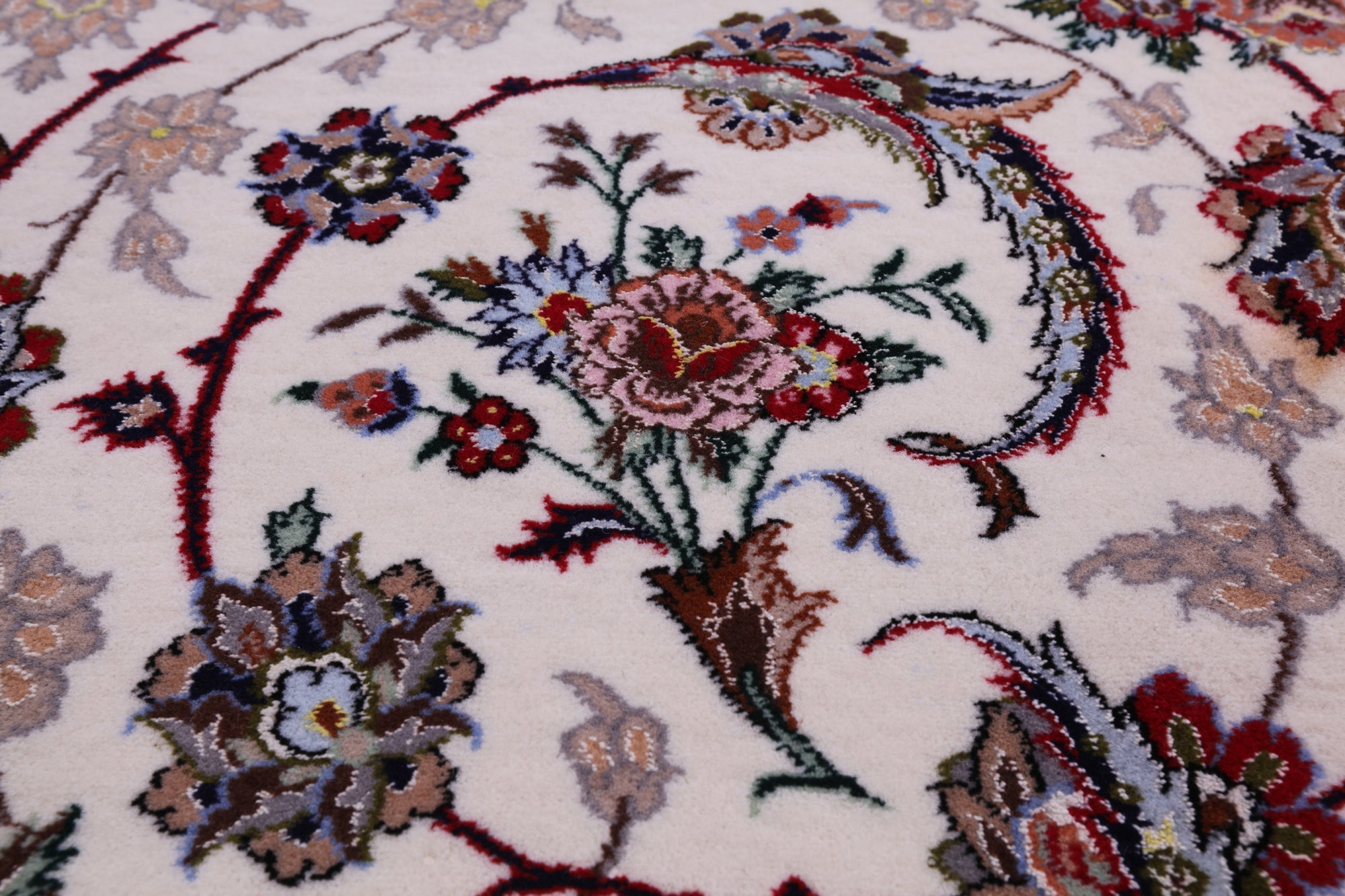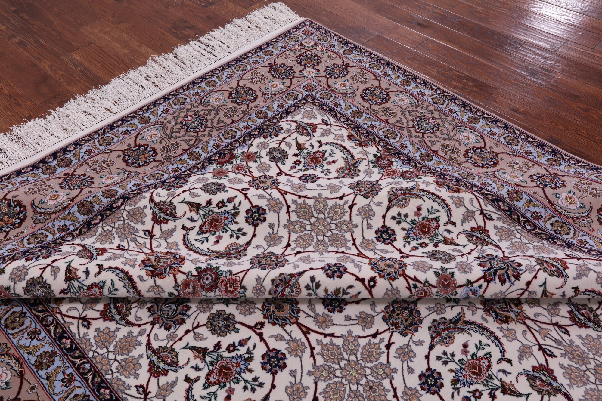 Hand knotted Isfahan rugs and carpets usually have ivory backgrounds with blue, rose, and green. Isfahan rugs and carpets often have very symmetrical and balanced designs. They usually have a single medallion. These Handmade rugs and carpets have very high quality. Isfahan rugs are one of the highest quality rugs in the world.