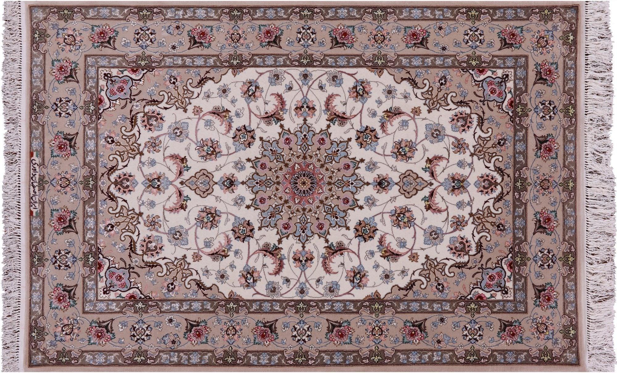 Ivory Signed Hand Knotted Persian Isfahan Wool & Silk Rug 3' 8" X 5' 9" - SA2645