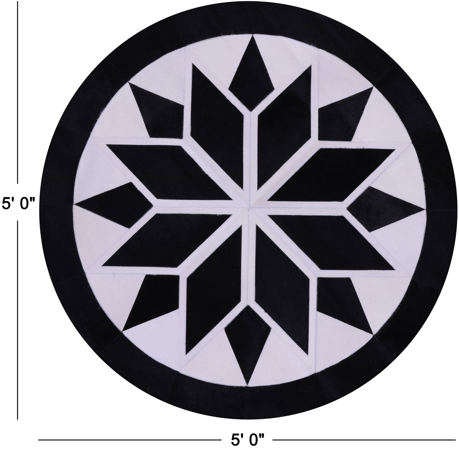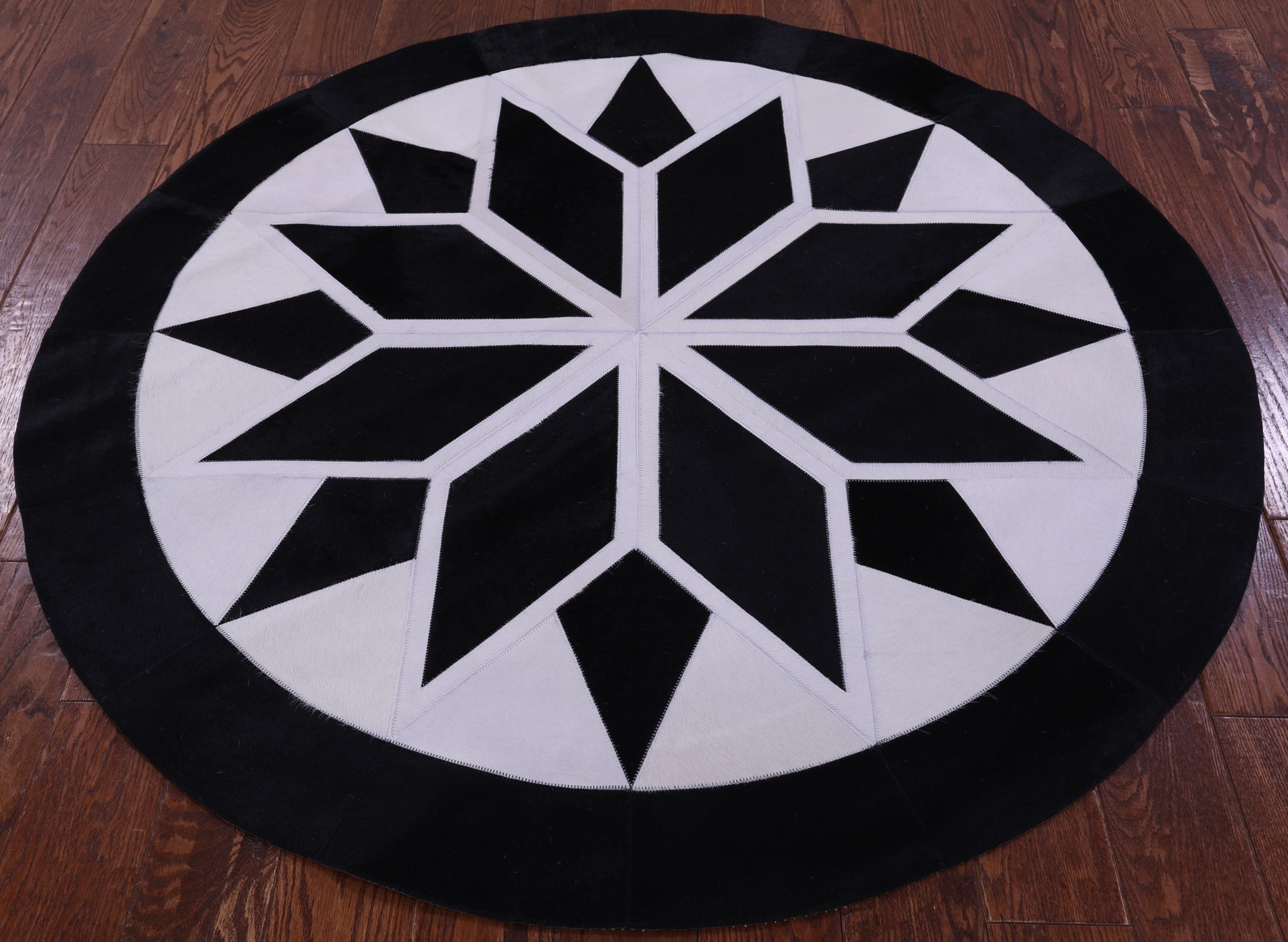 5' 0" X 5' 0" Black & White Round Natural Cowhide Hand Stitched Rug - C3561