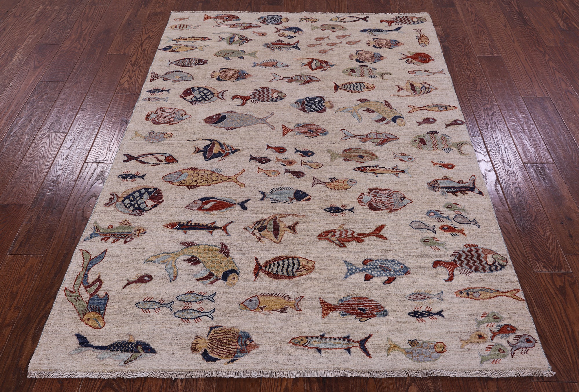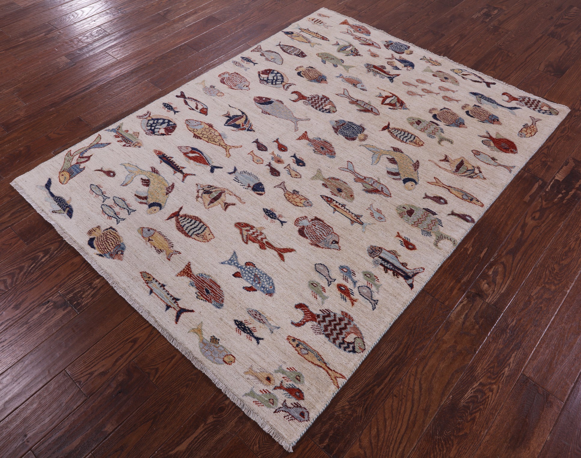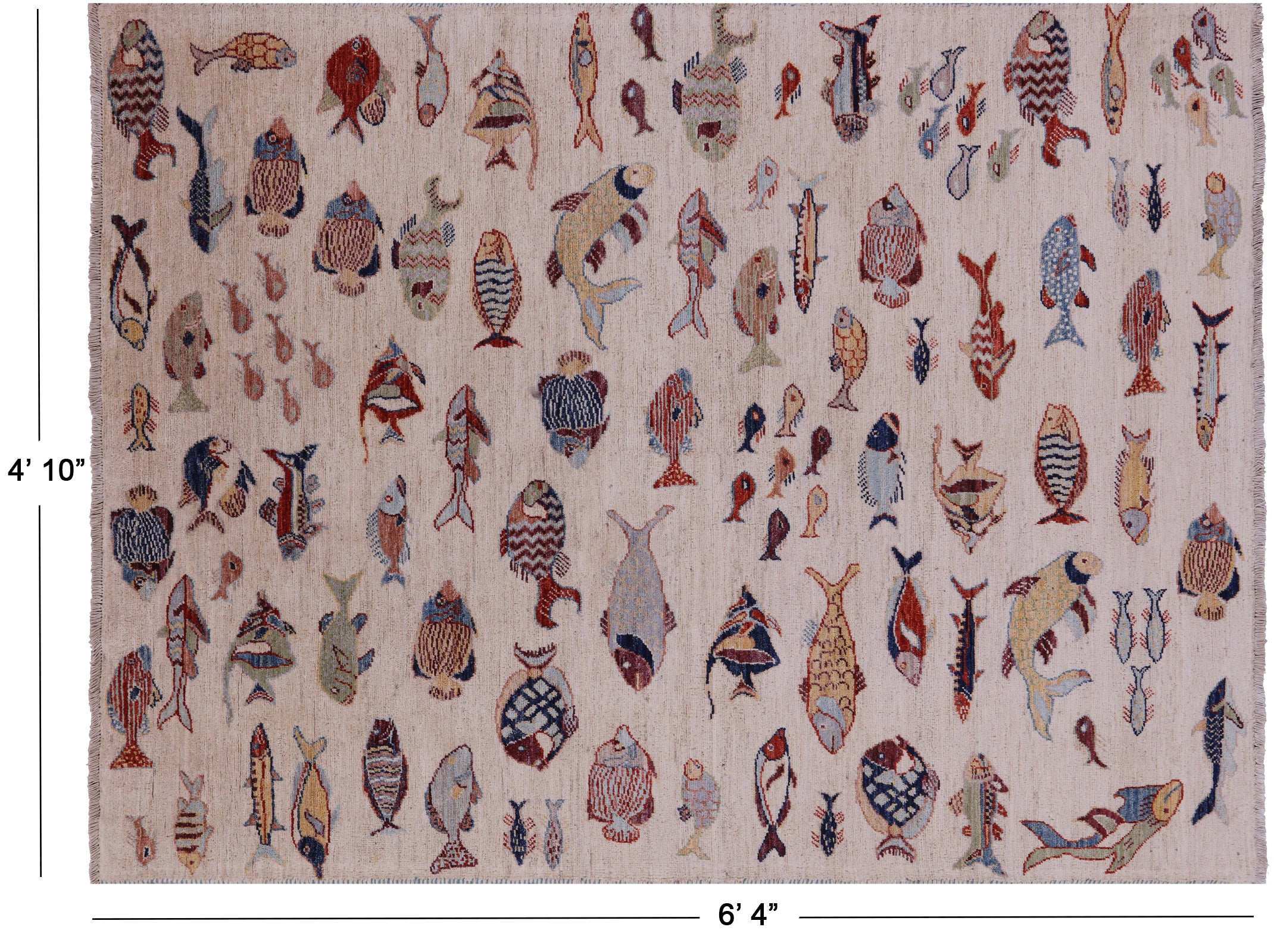 Ivory 4' 10" X 6' 4" Gabbeh Fish Design Hand Knotted Rug - Q21048 is backordered and will ship as soon as it is back in stock.
