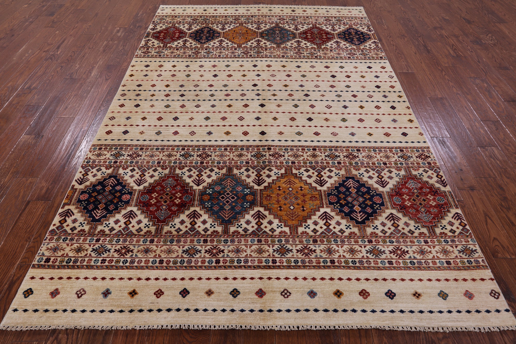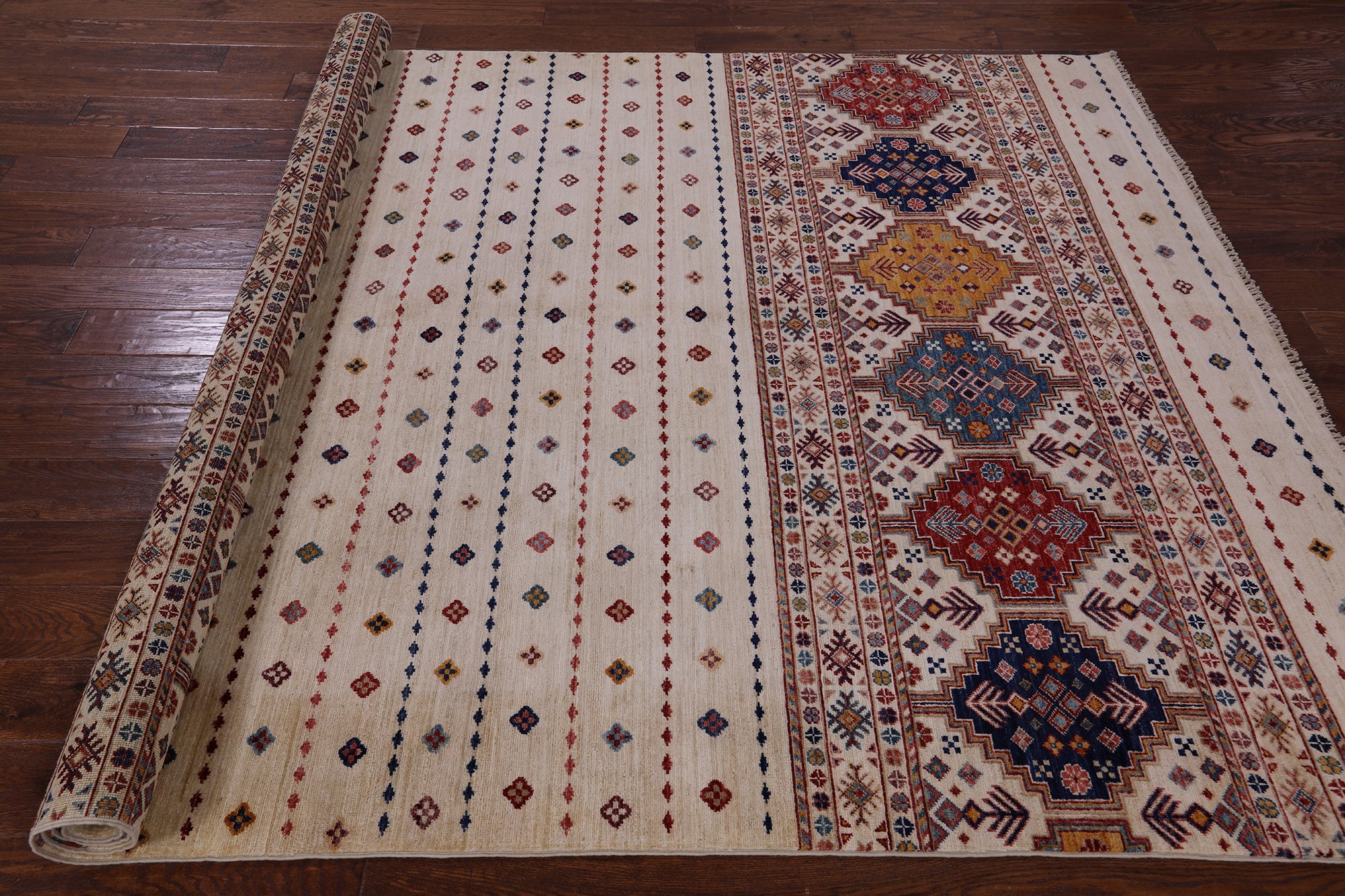 Ivory Hand Knotted Khorjin Super Kazak Rug 6' 9" X 10' 1" - Q10741 is backordered and will ship as soon as it is back in stock.